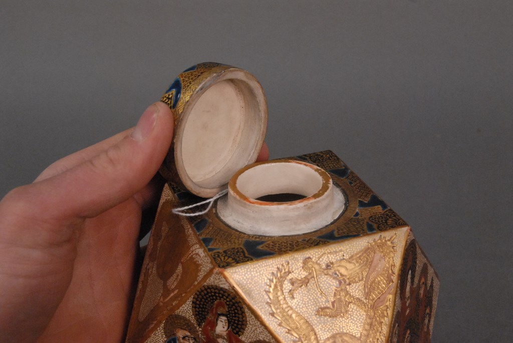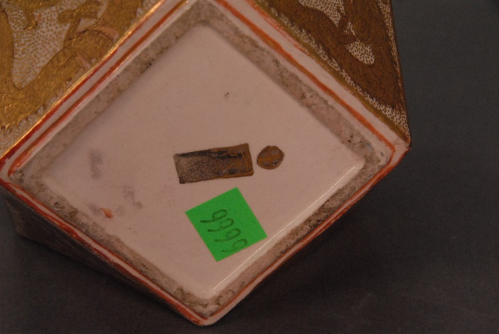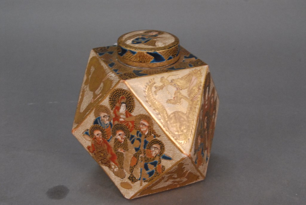 Satsuma covered jar, unusual 12 sided with gold dragons in panels, signed. ht. 6in.