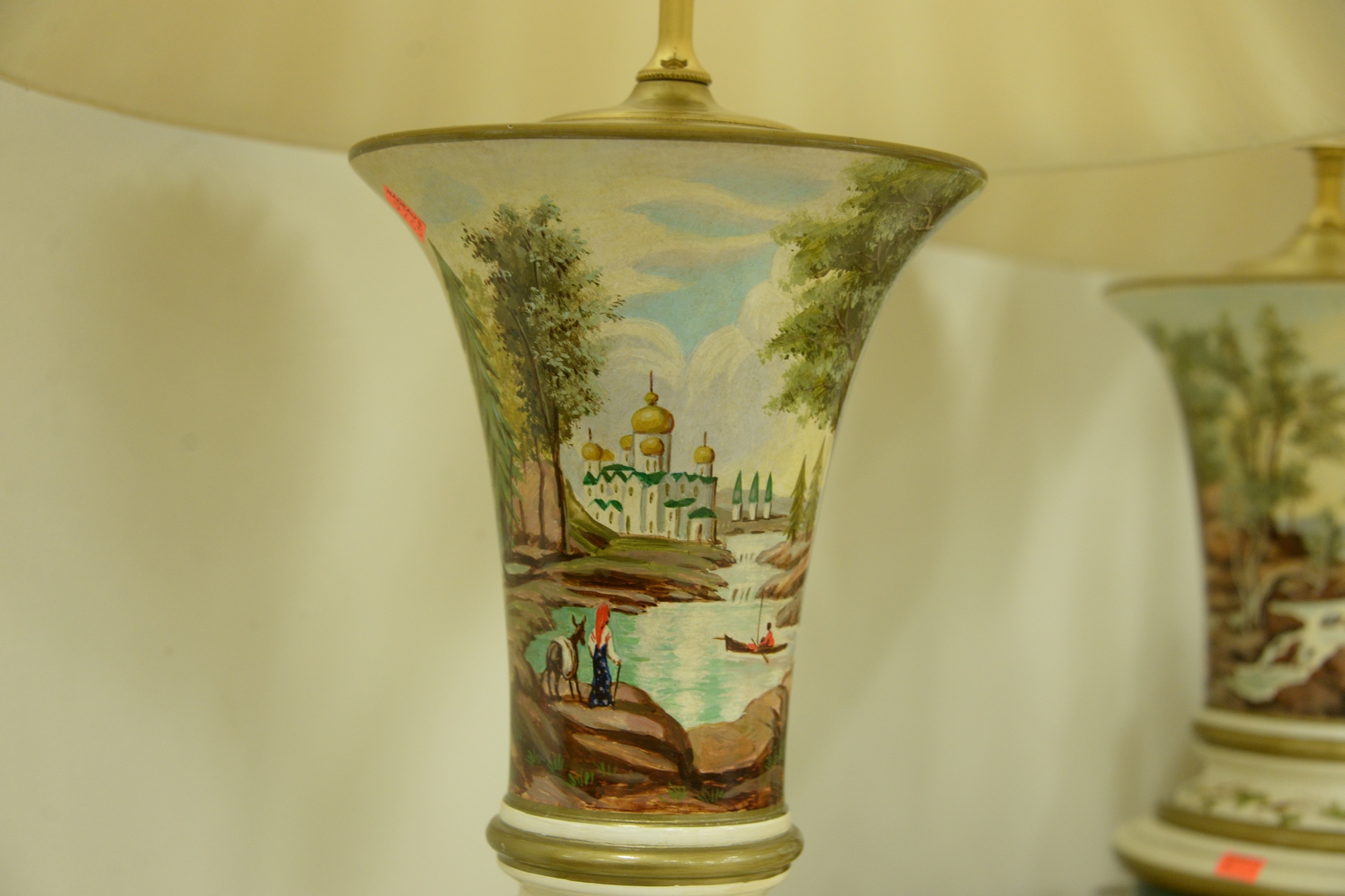 Six Piece Lot, to include three pairs of table lamps one brass pair on neoclassical bases one yellow glass pair on brass bases along with a pair of ceramic lamps with painted landscape scene heights 21, 30 1/2, and 39 inches.