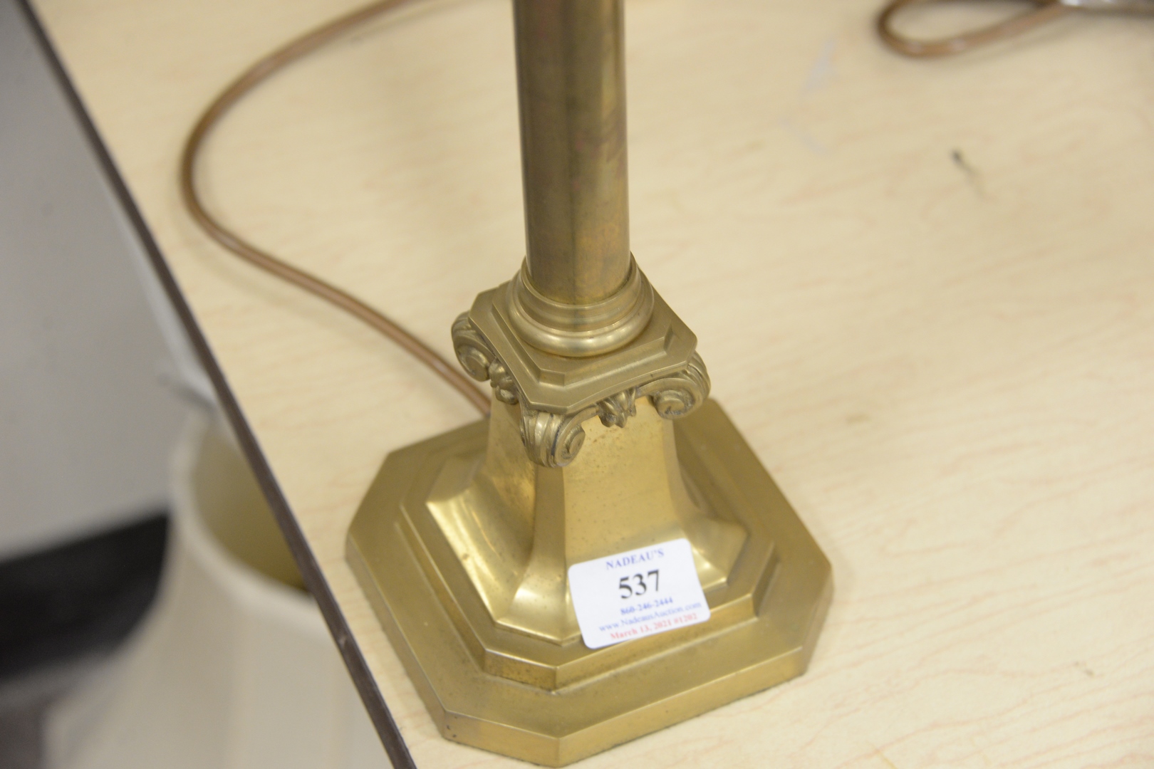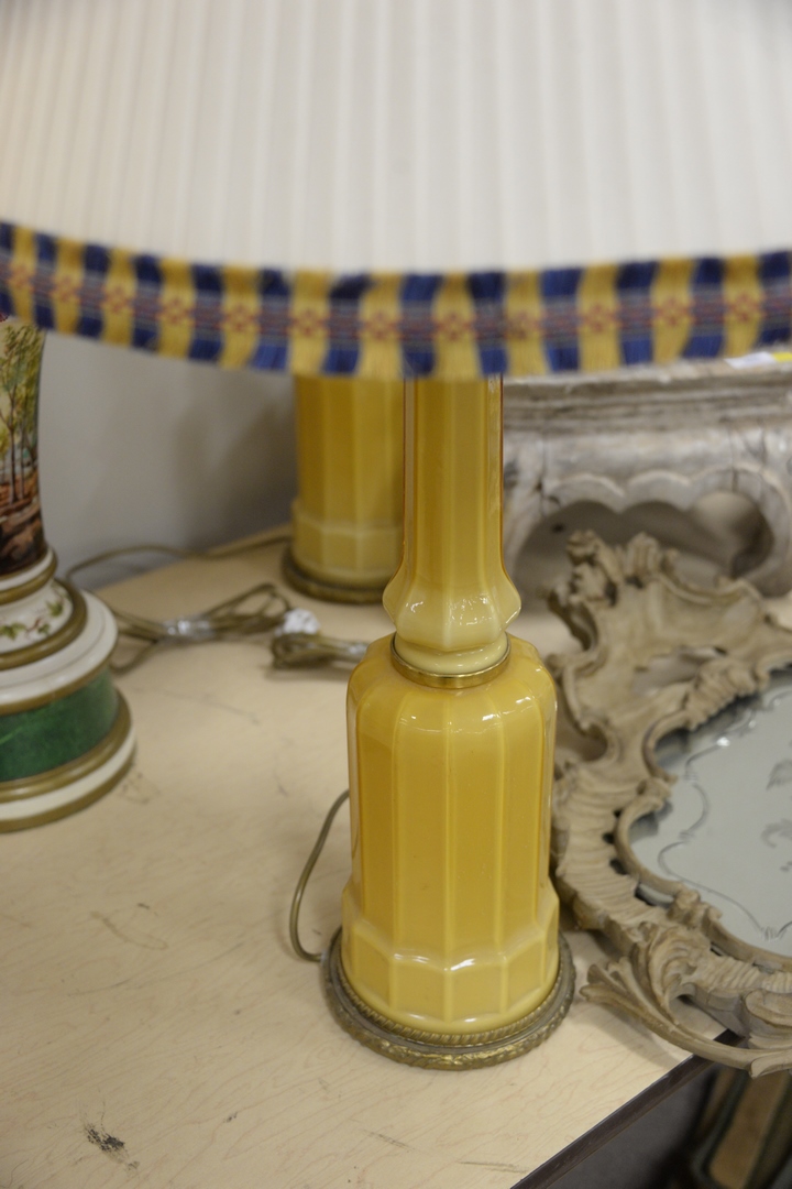 Lot 537: Six Piece Lot, to include three pairs of table lamps one brass pair on neoclassical bases one yellow glass pair on brass bases al…