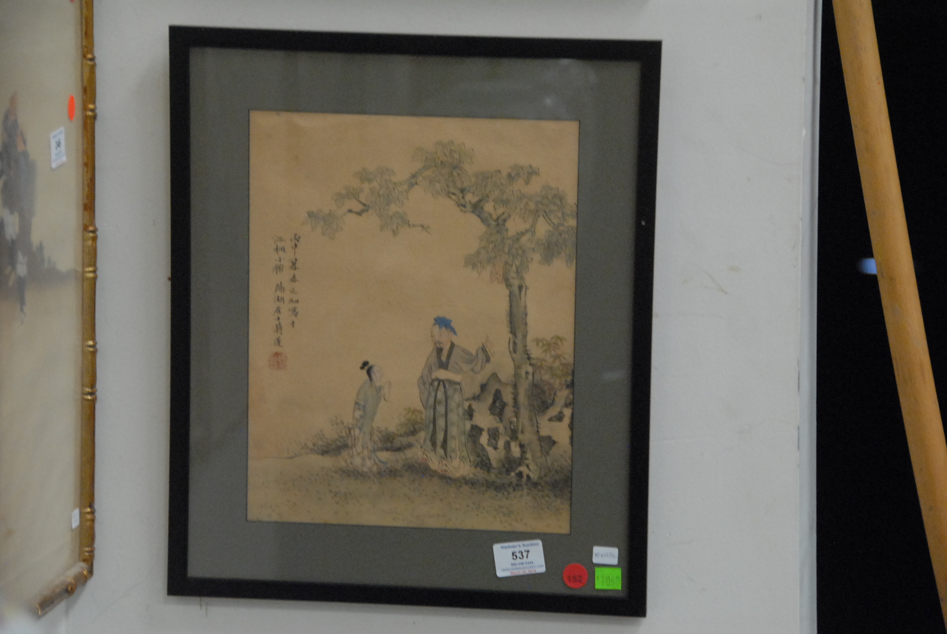 Lot 537: Three piece lot including painting of scholar with horse and a pair of framed painting on paper of scholars and attendants, calligraphy and seal mark. 14 1/2 x 17