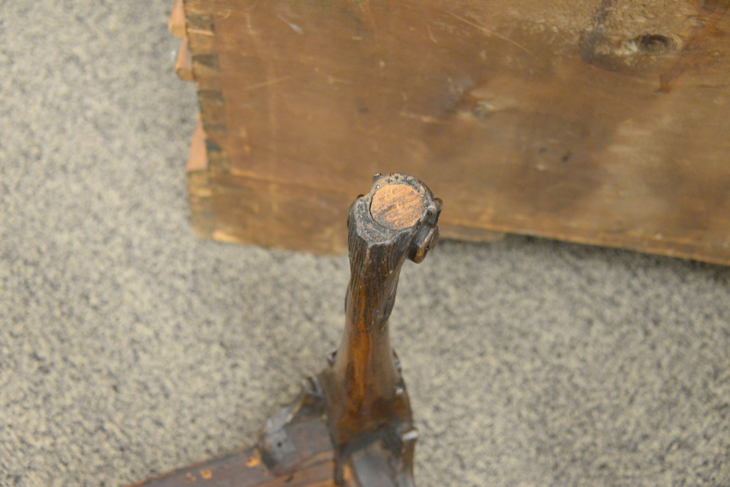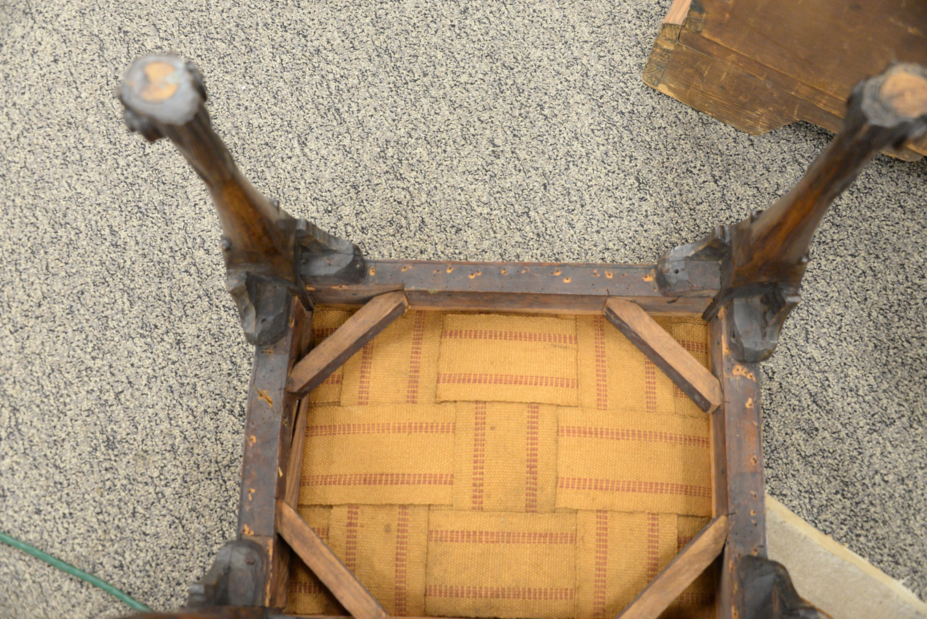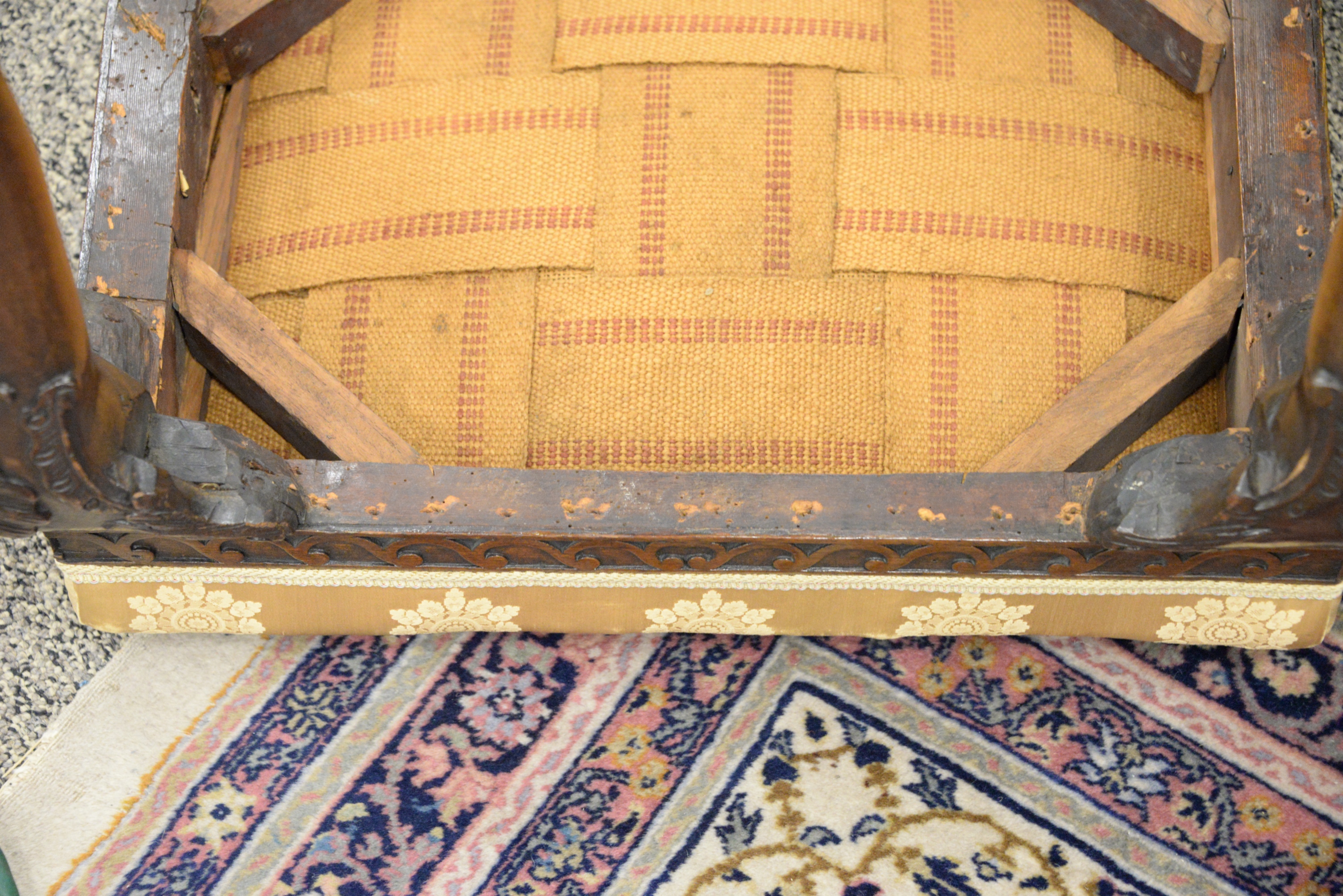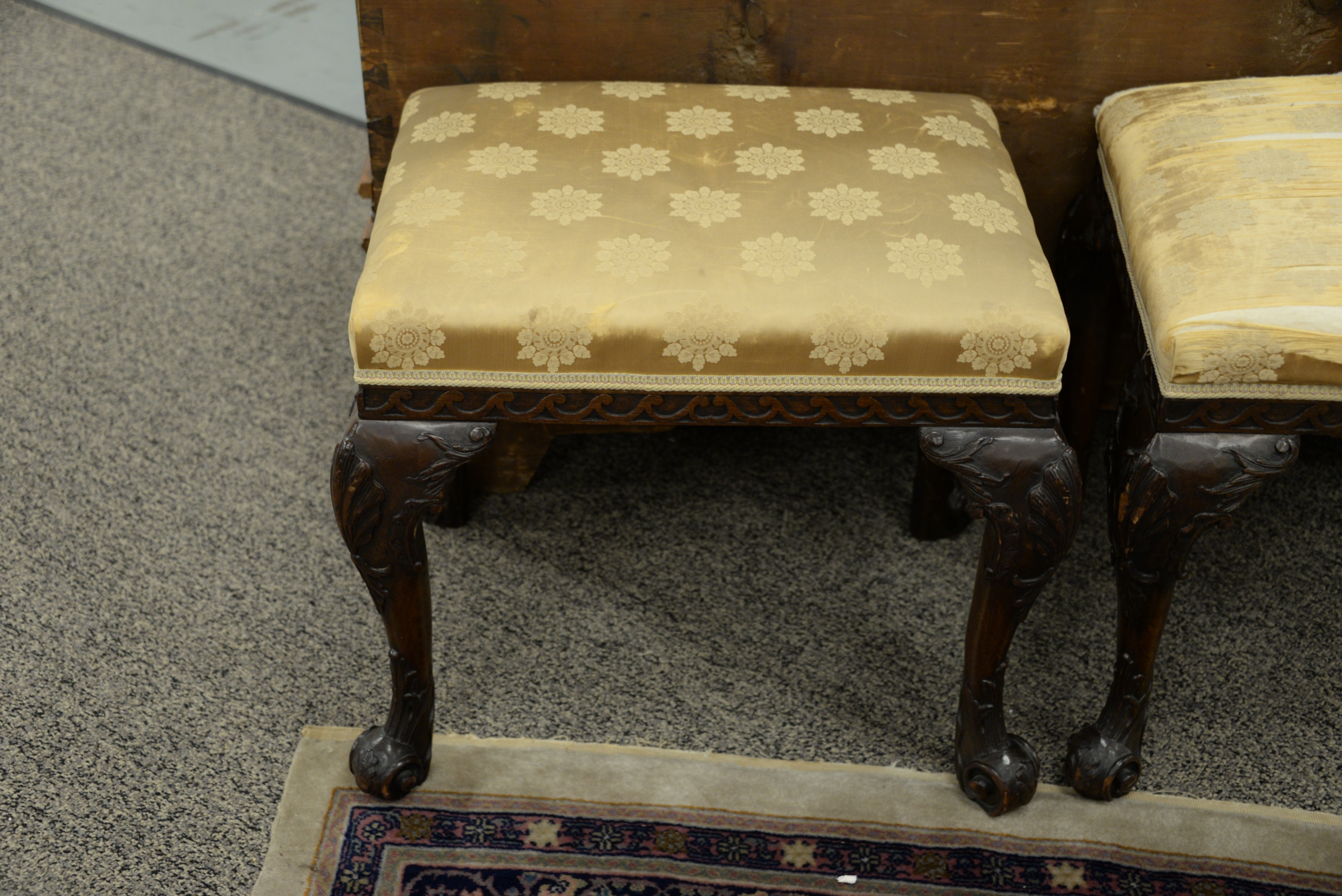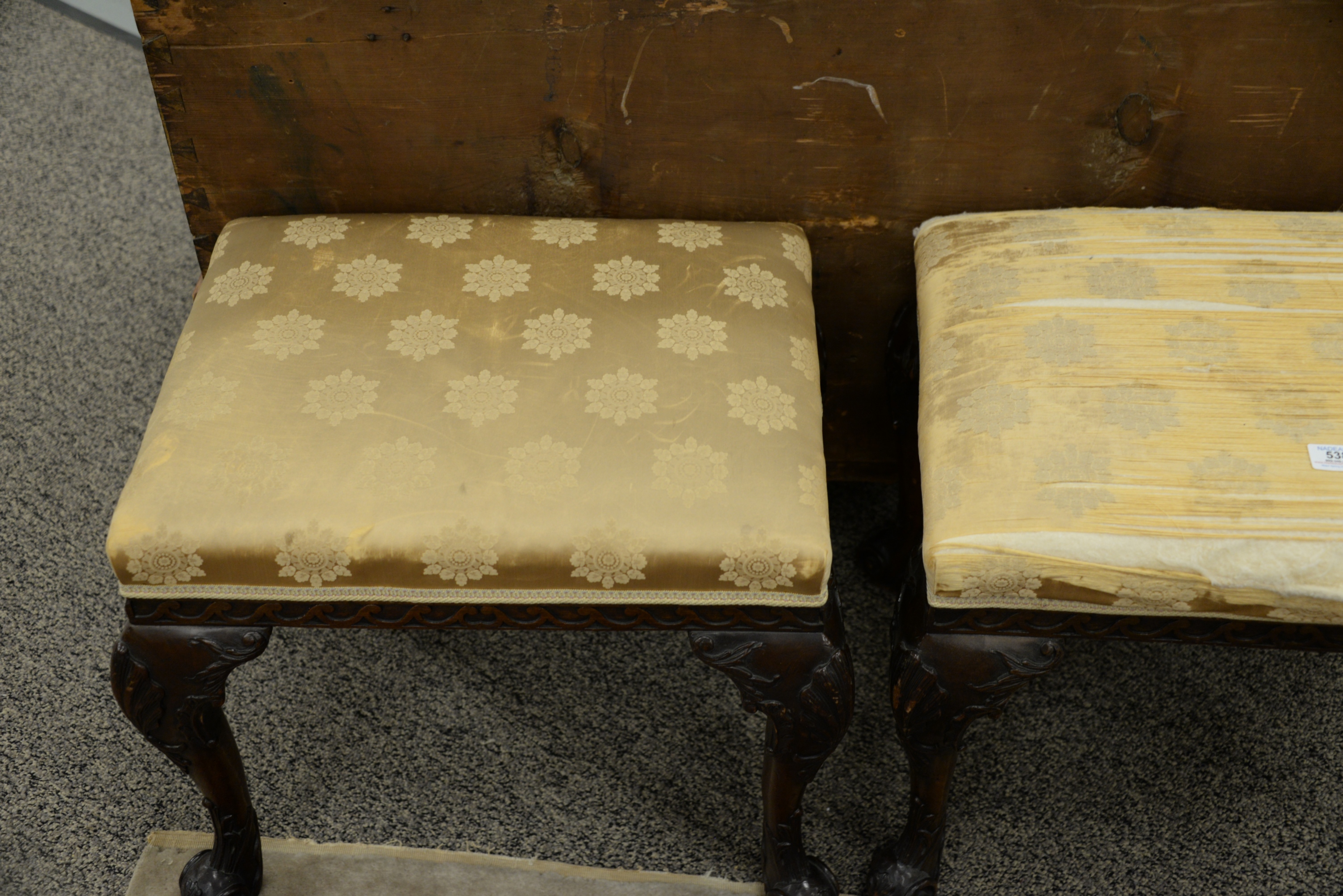A Pair of George III Mahogany and Upholstered Stools, the rectangular form having Vitruvian scroll carved frieze set on cabriole legs with shell carved knees ending in scrolled feet, 18th century, height 19 1/2 inches, 17″ x 21″, upholstery worn.