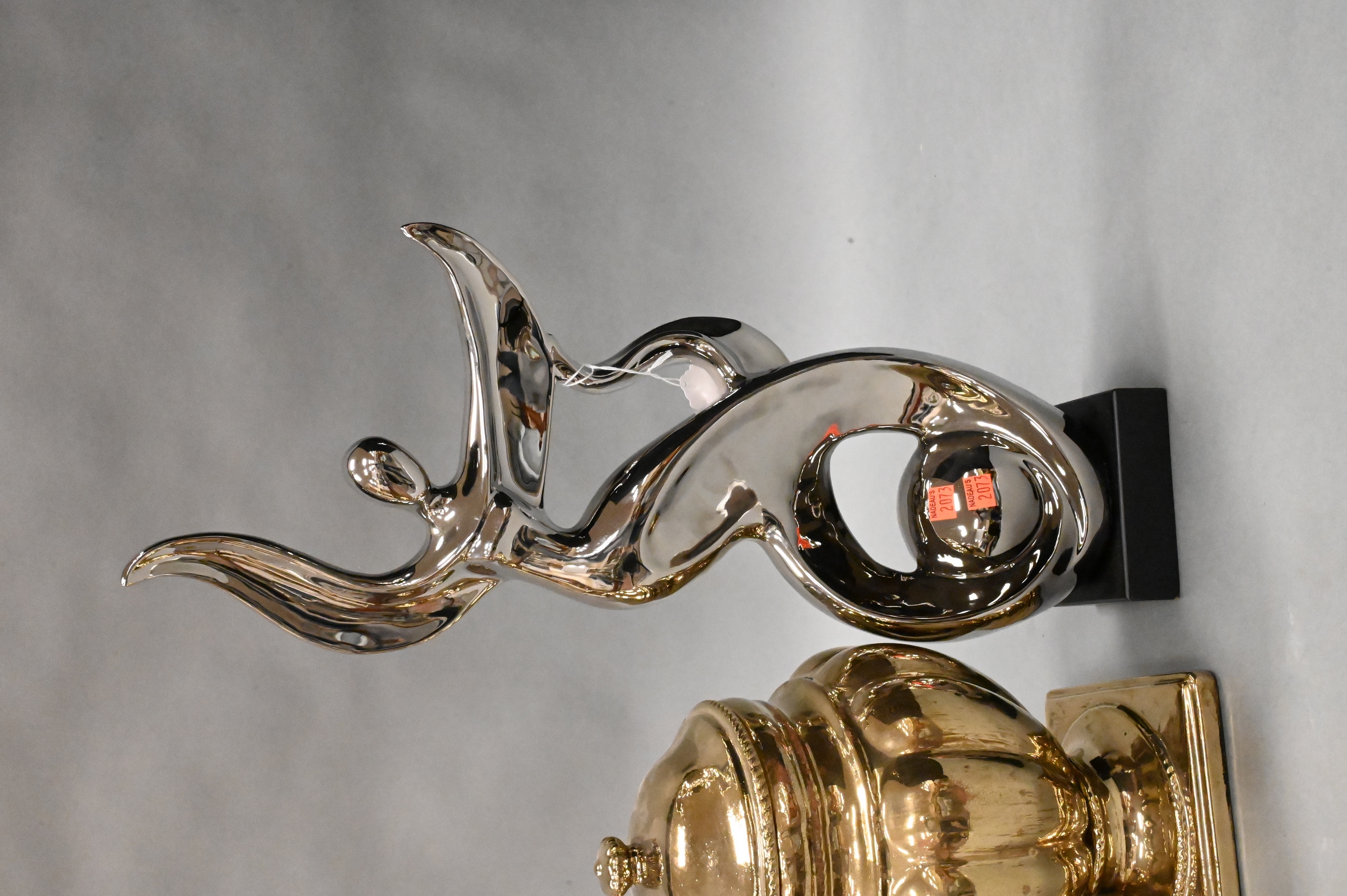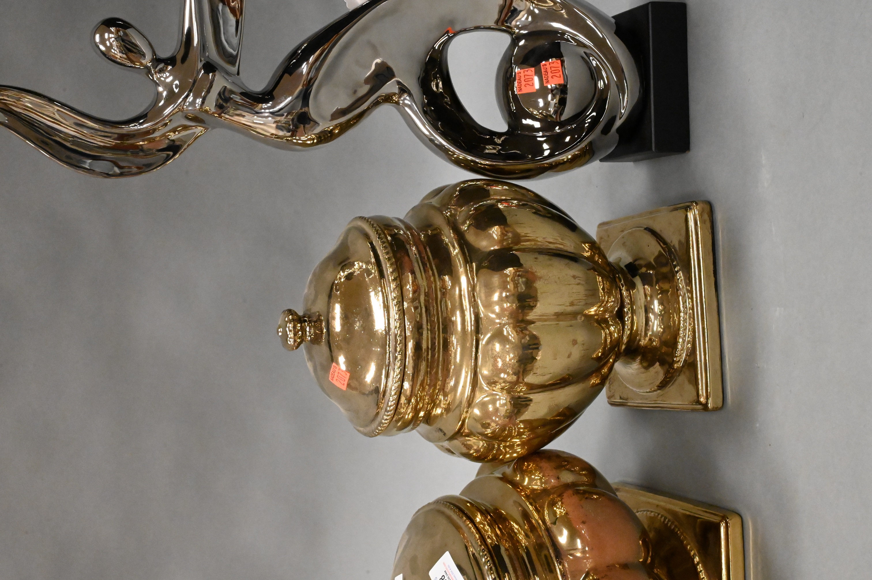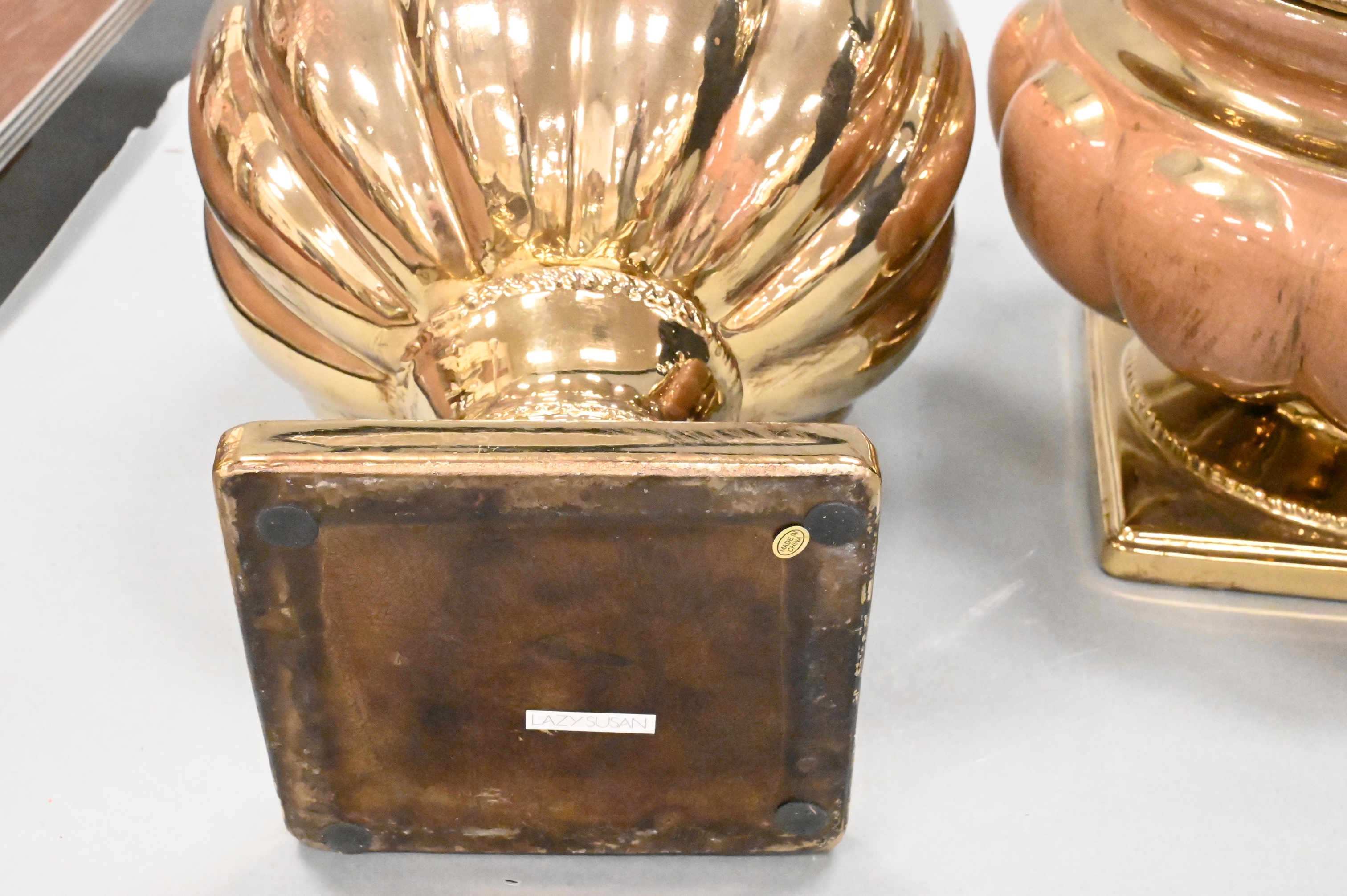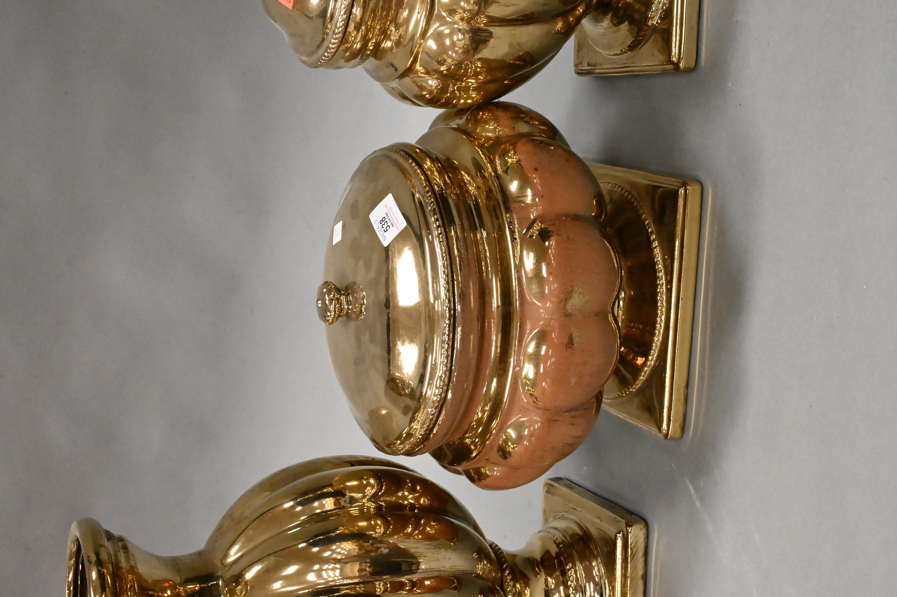 three Lazy Susan ceramic gold mirrored glazed vases and two covered urns, along with mirror ceramic figure