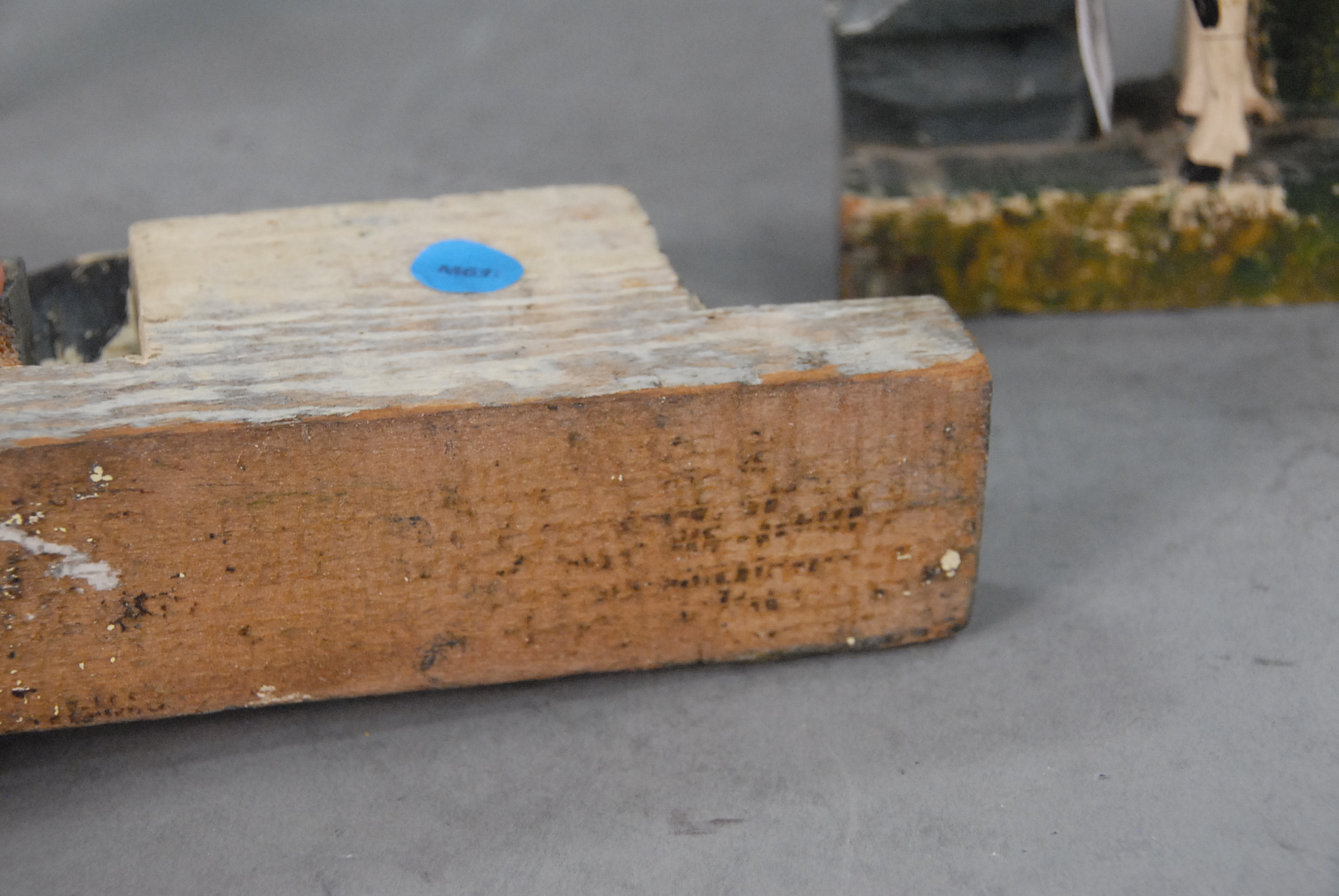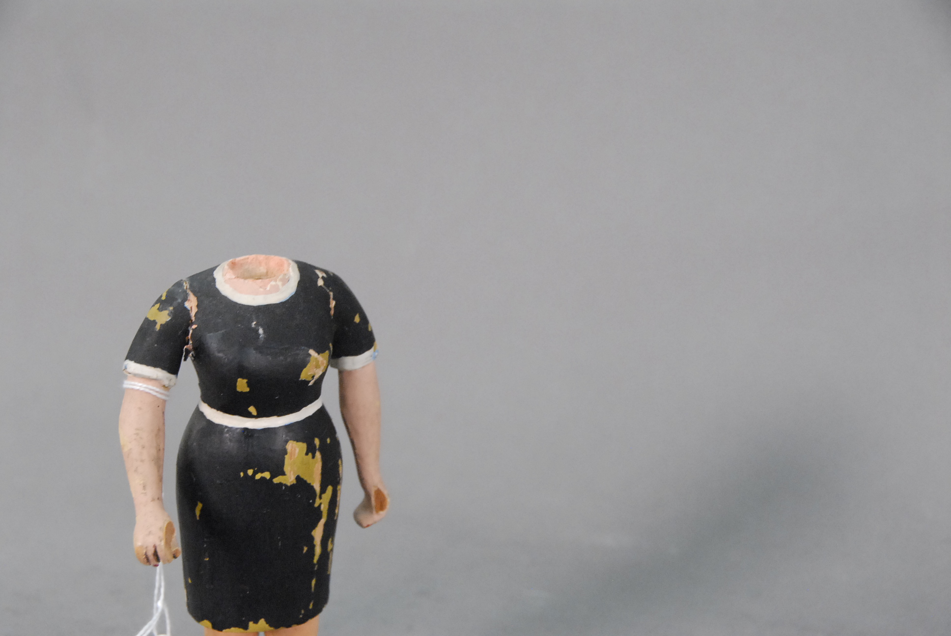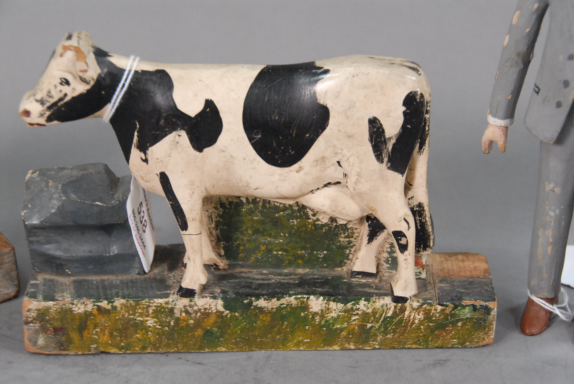 Four piece lot of painted wooden folk art, pair of cows, man and woman, missing head of woman.