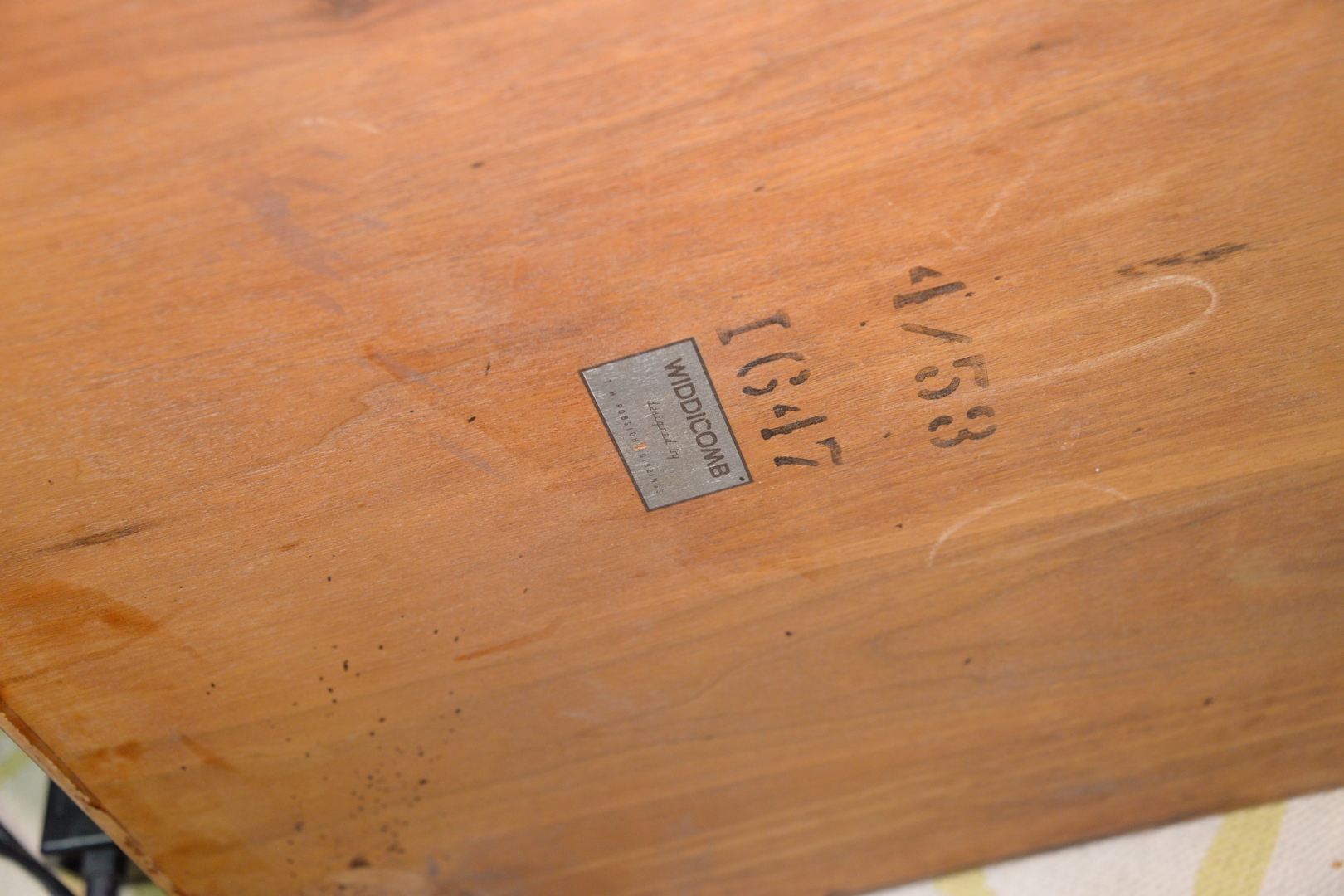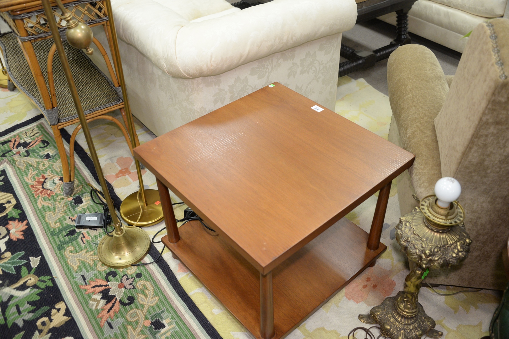 Lot 538: Pair of T.H. Robsjohn-Gibbings for Widdicomb Square End Tables, having labels adhered to the underside, height 19 3/4 inches, top 24″ x 24″.