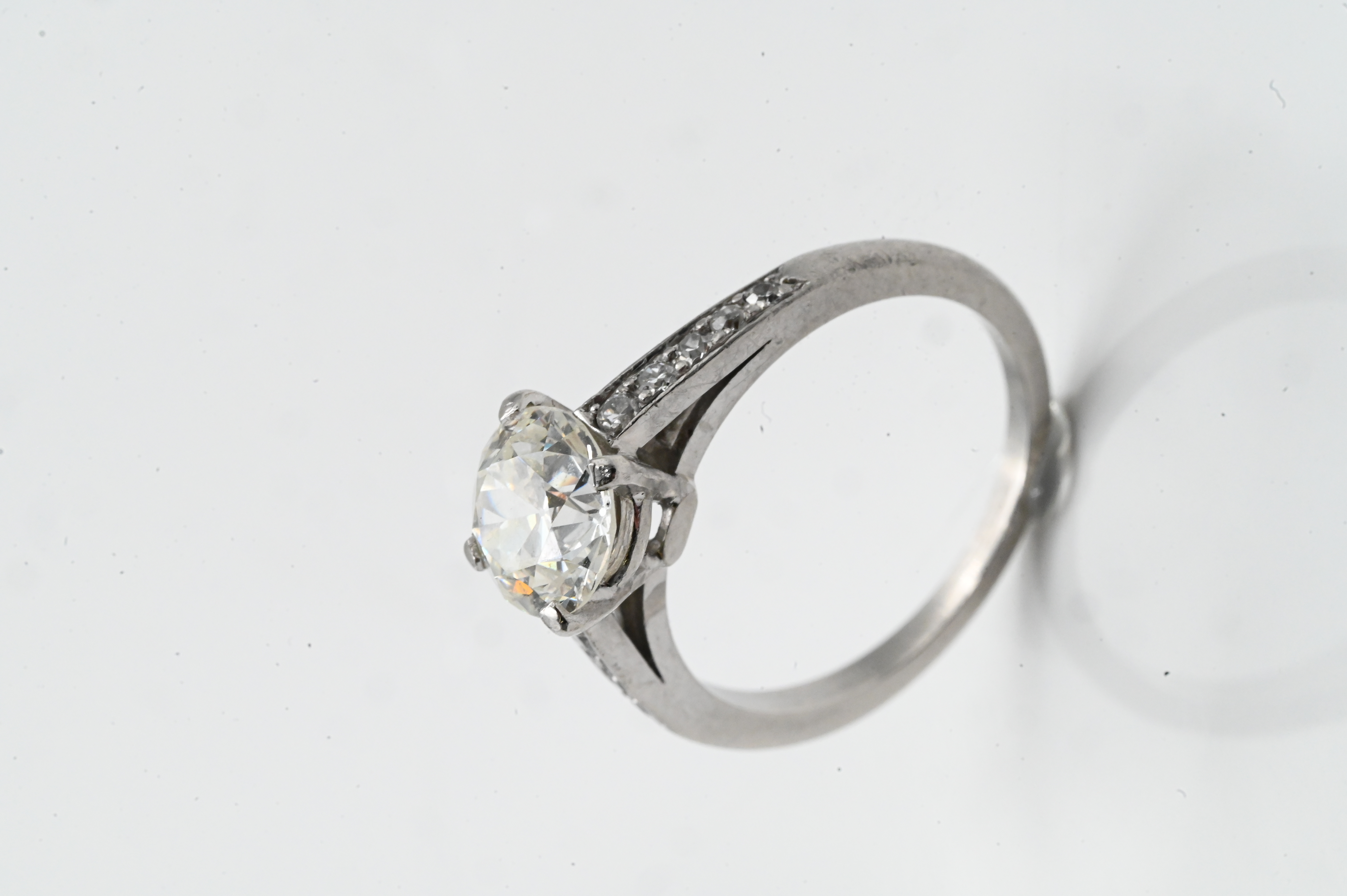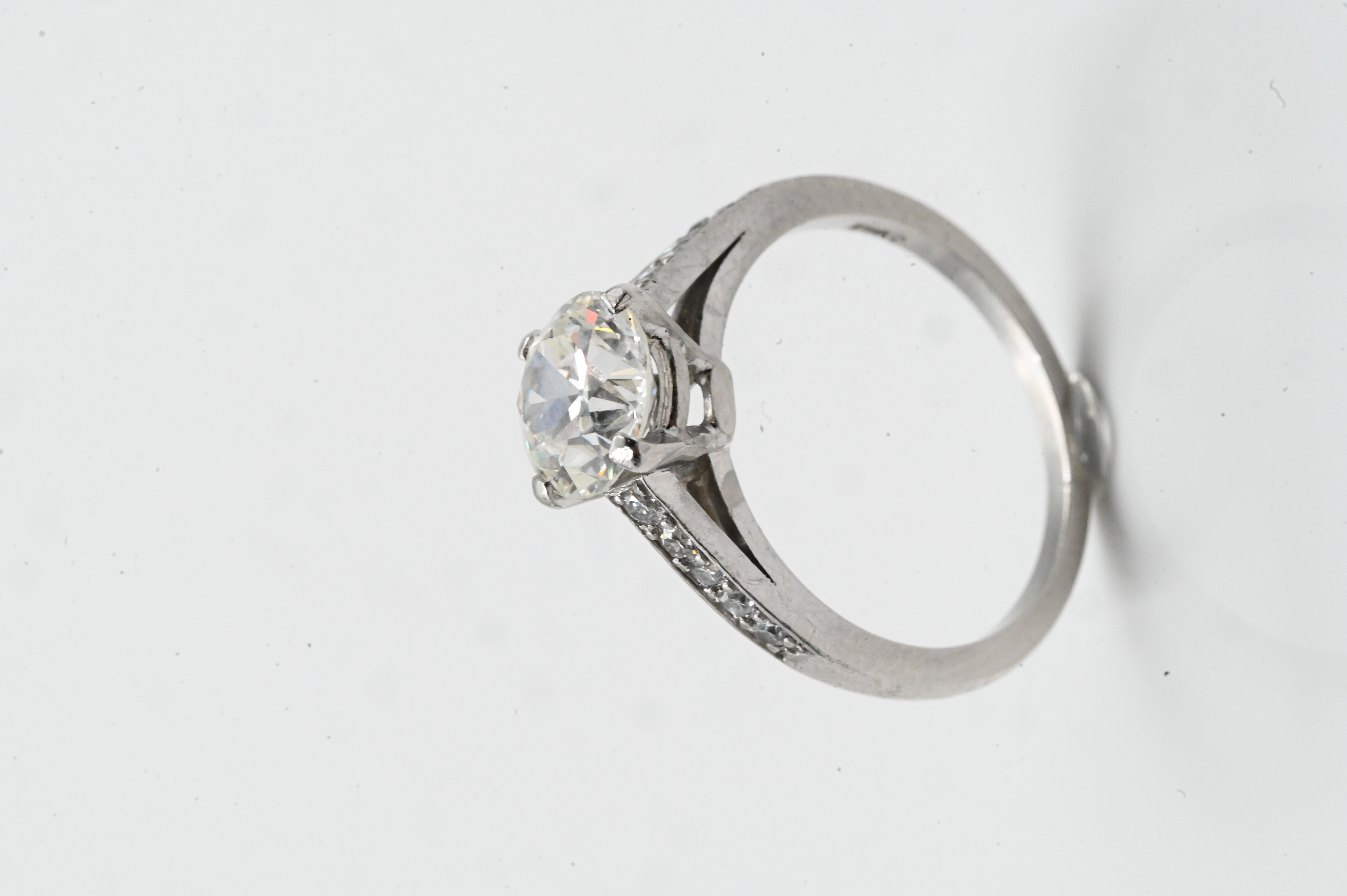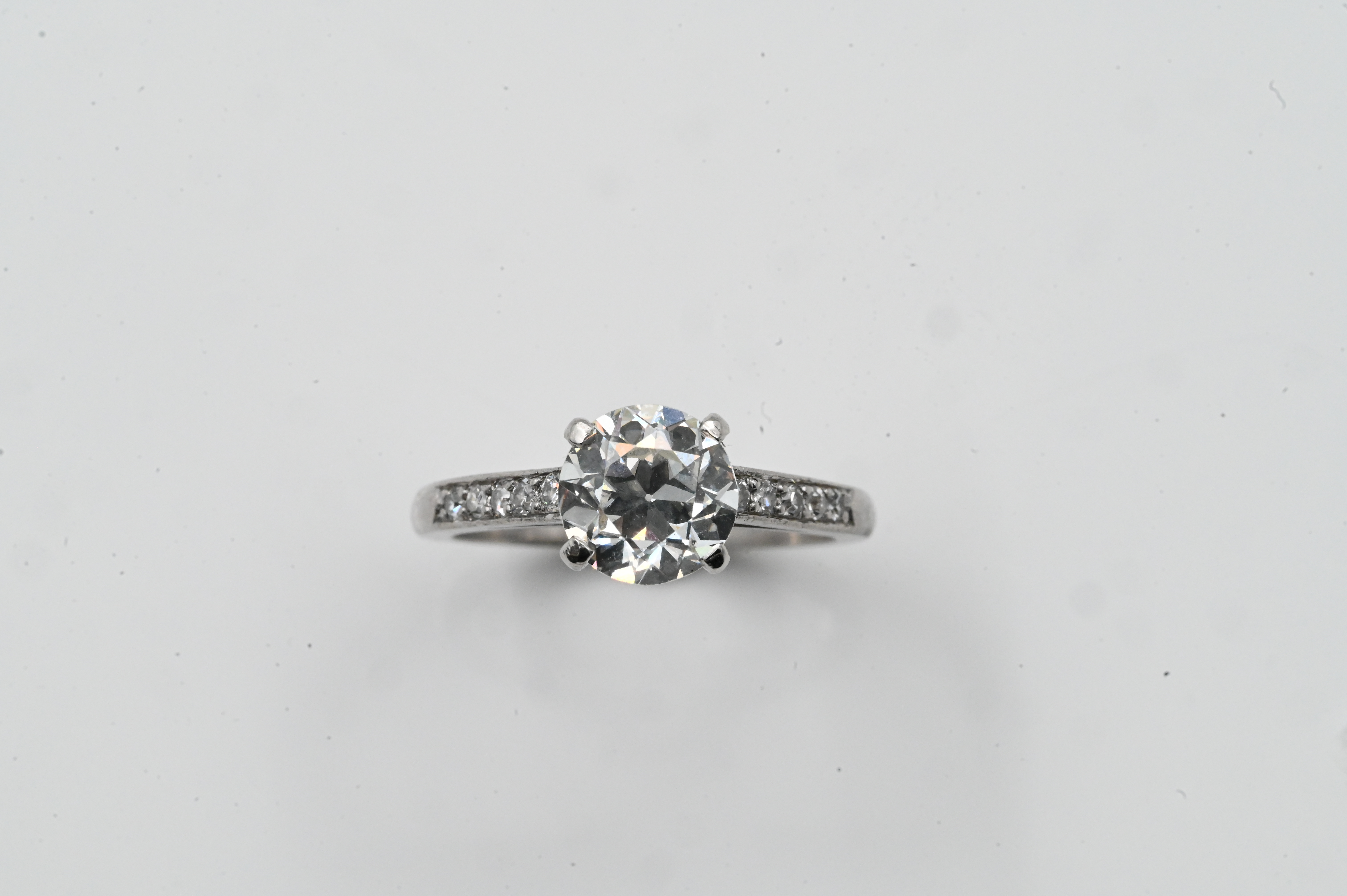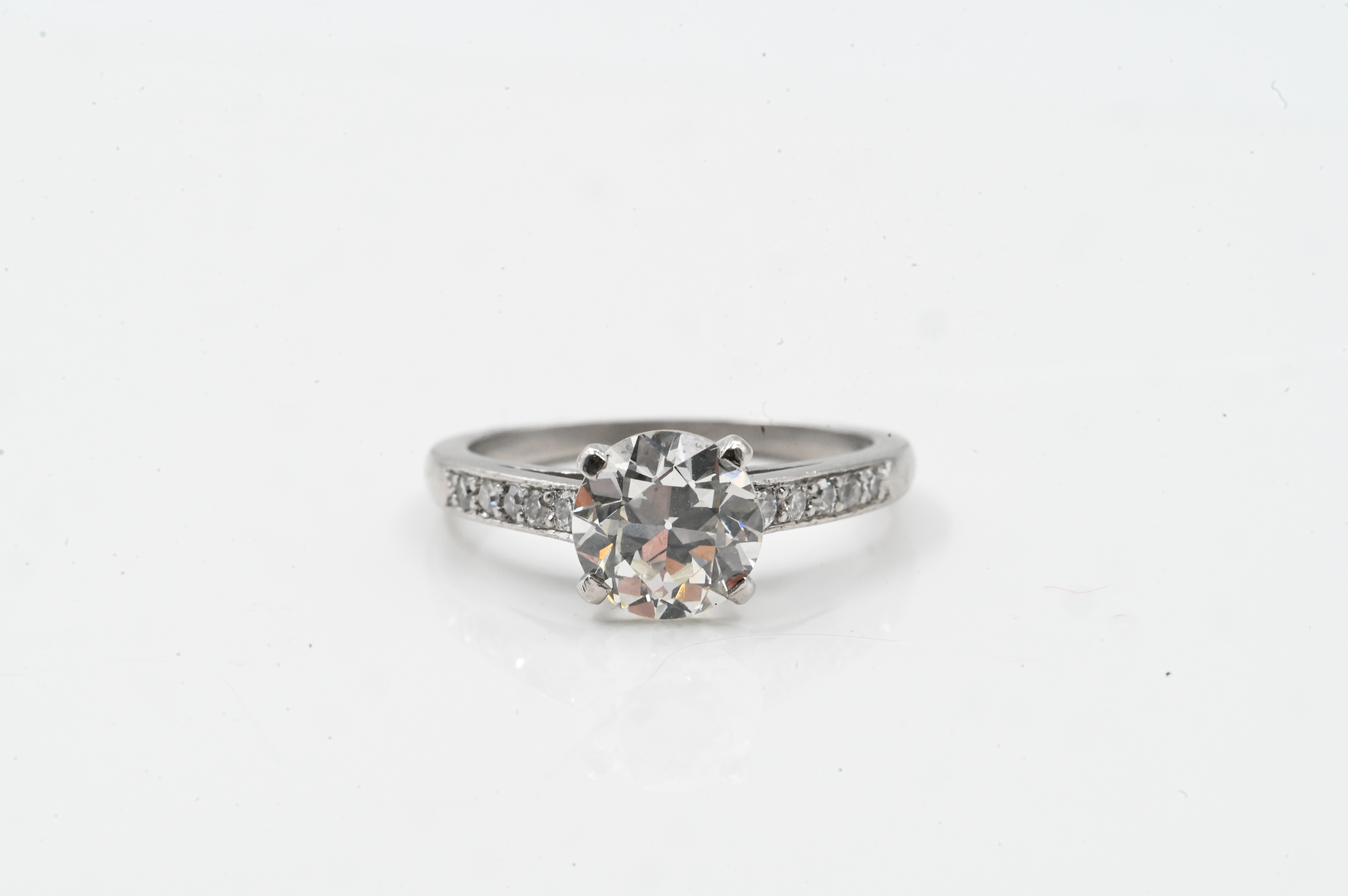 Set with a round brilliant-cut diamond weighing 1.98 carats, I color, VVS2 clarity, secured in a four-prong mount. The shoulders are channel-set with four small round diamonds on each side. Ring size 7.5. Accompanied by GIA Report No. 2235749644.
