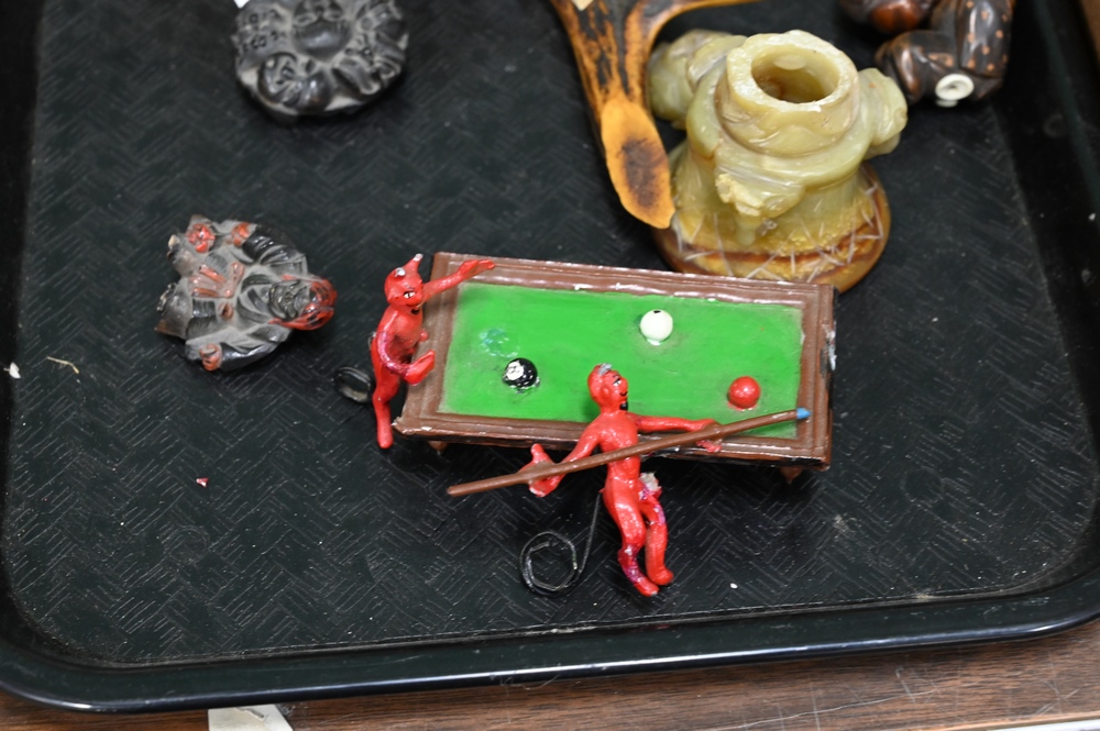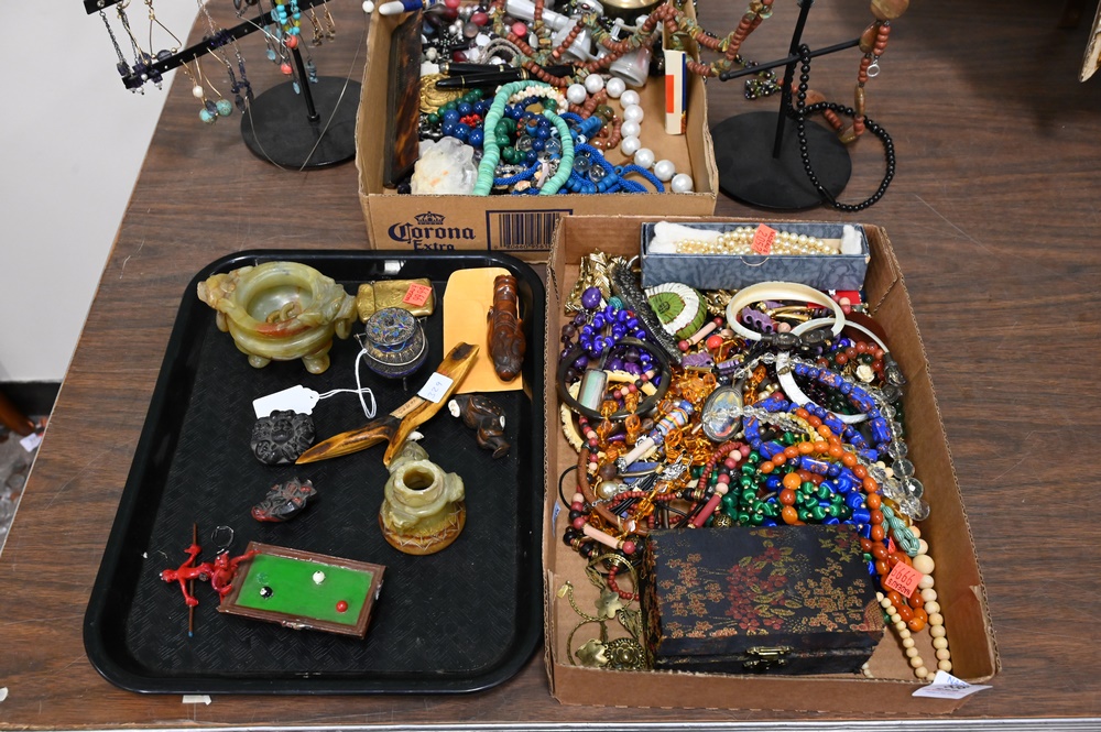 Three Tray Lots of Costume Jewelry to include malachite beads, hardstone urn, enameled silver pot, netsuke, etc.