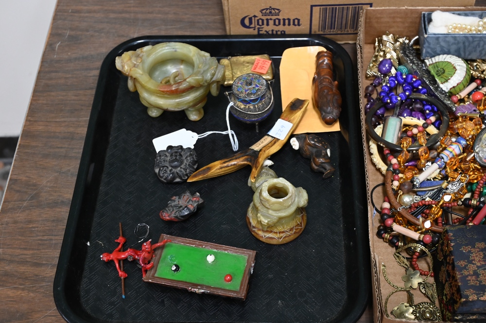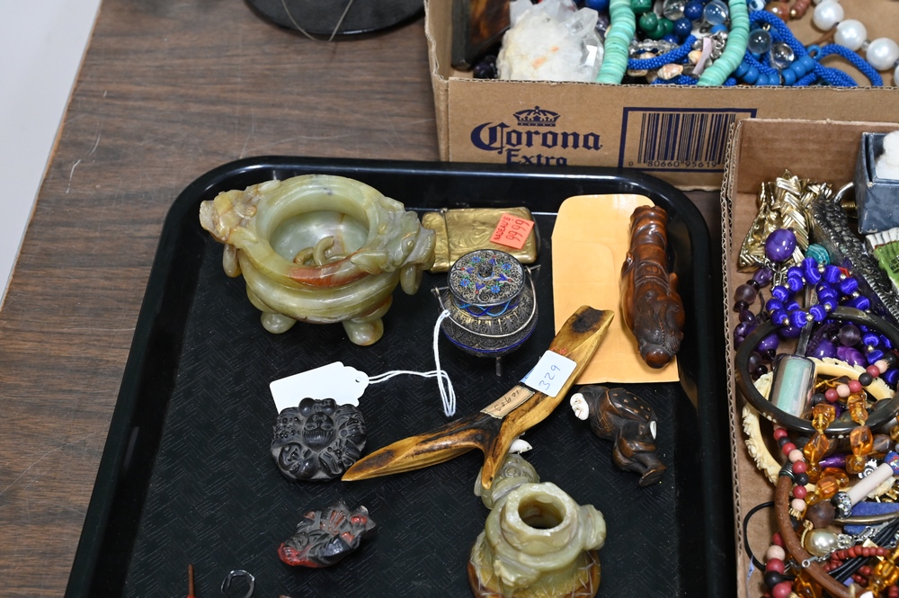 Lot 538: Three Tray Lots of Costume Jewelry to include malachite beads, hardstone urn, enameled silver pot, netsuke, etc.