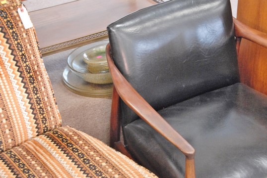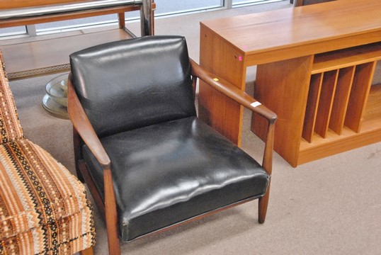 Walnut Mid-Century modern armchair with black vinyl upholstery.