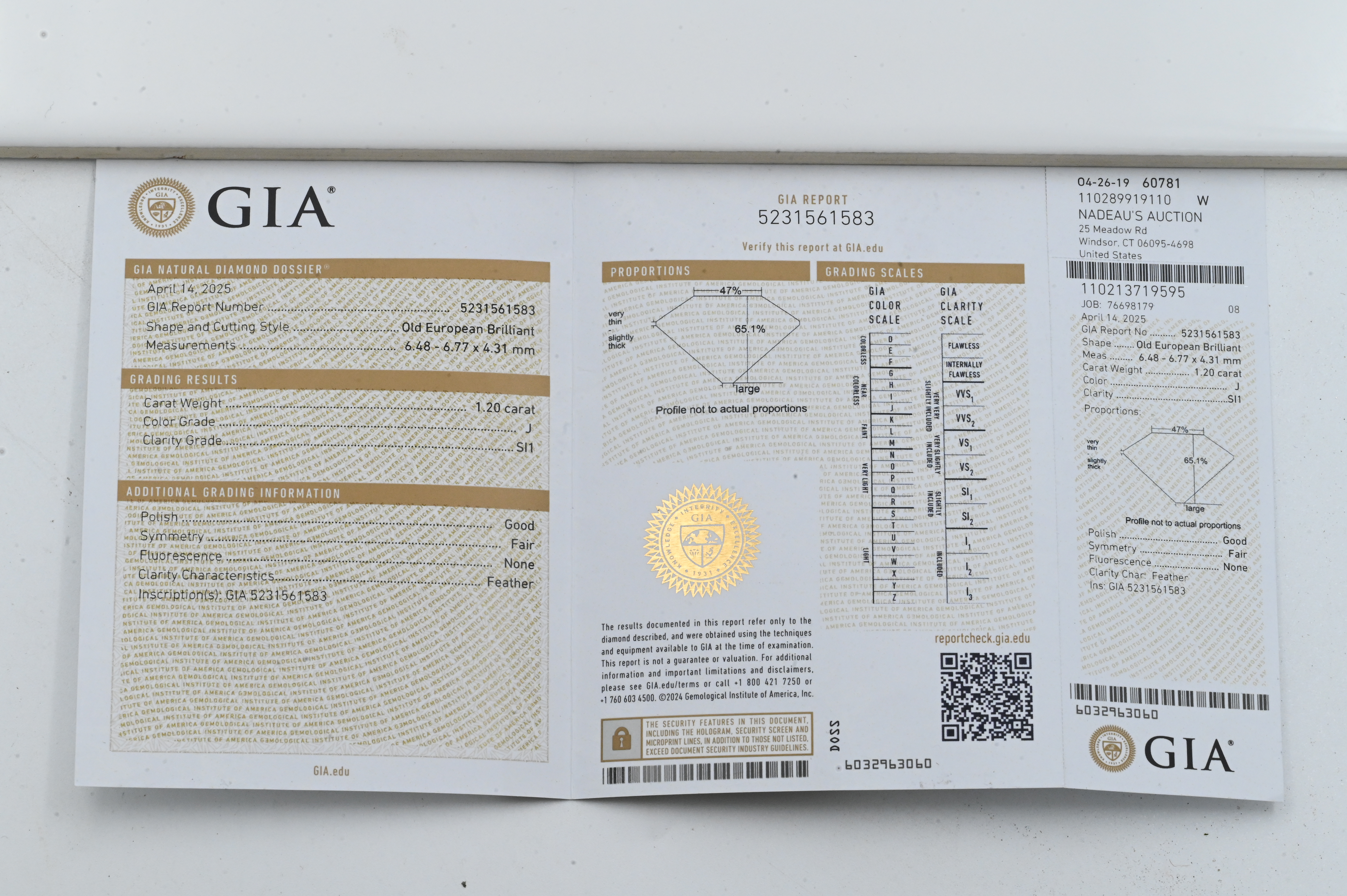 engagement ring having 1.2 carats old European brilliant, J color, S11, GIA report #5231561583, wedding ring set with five small diamonds