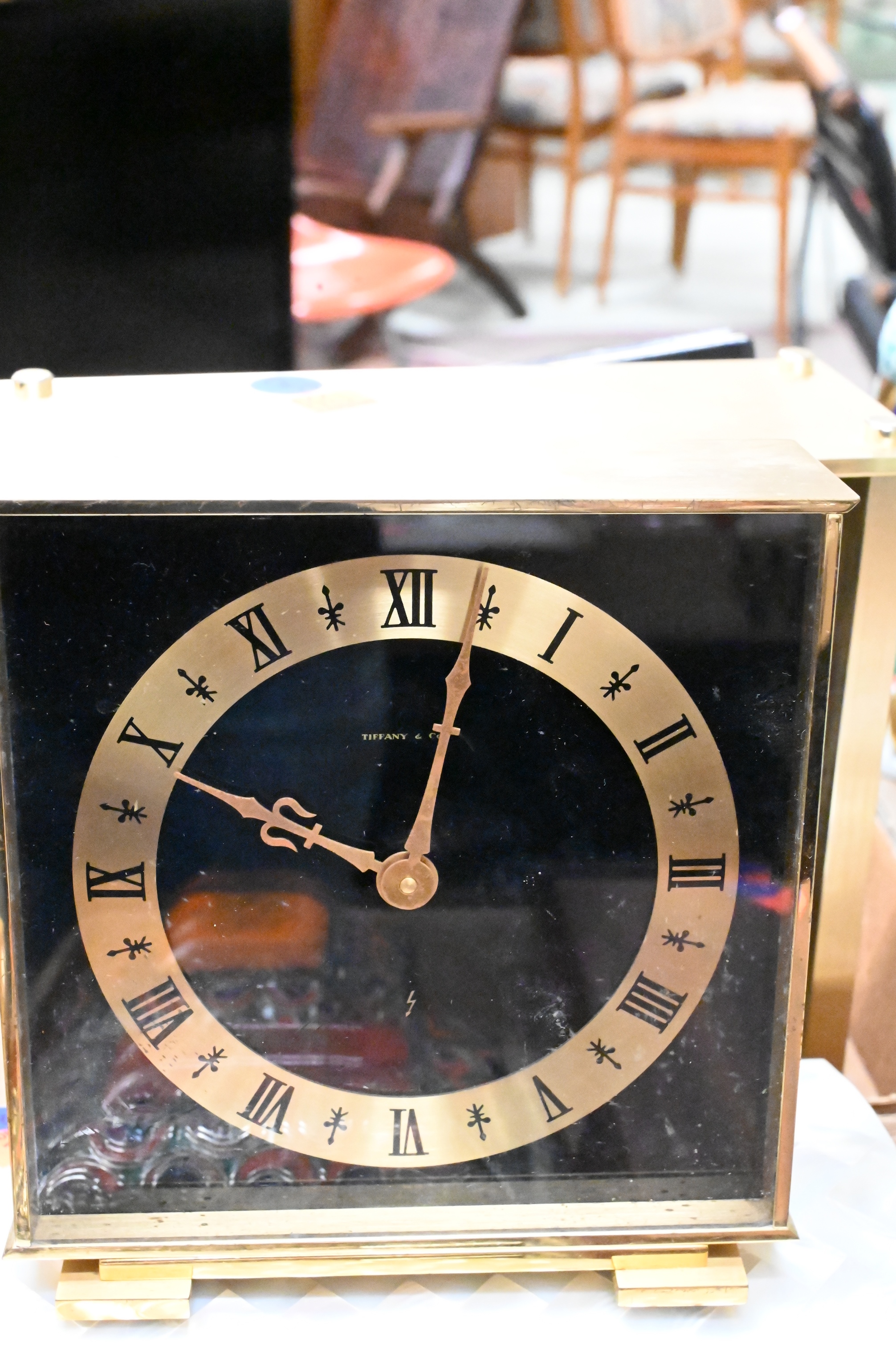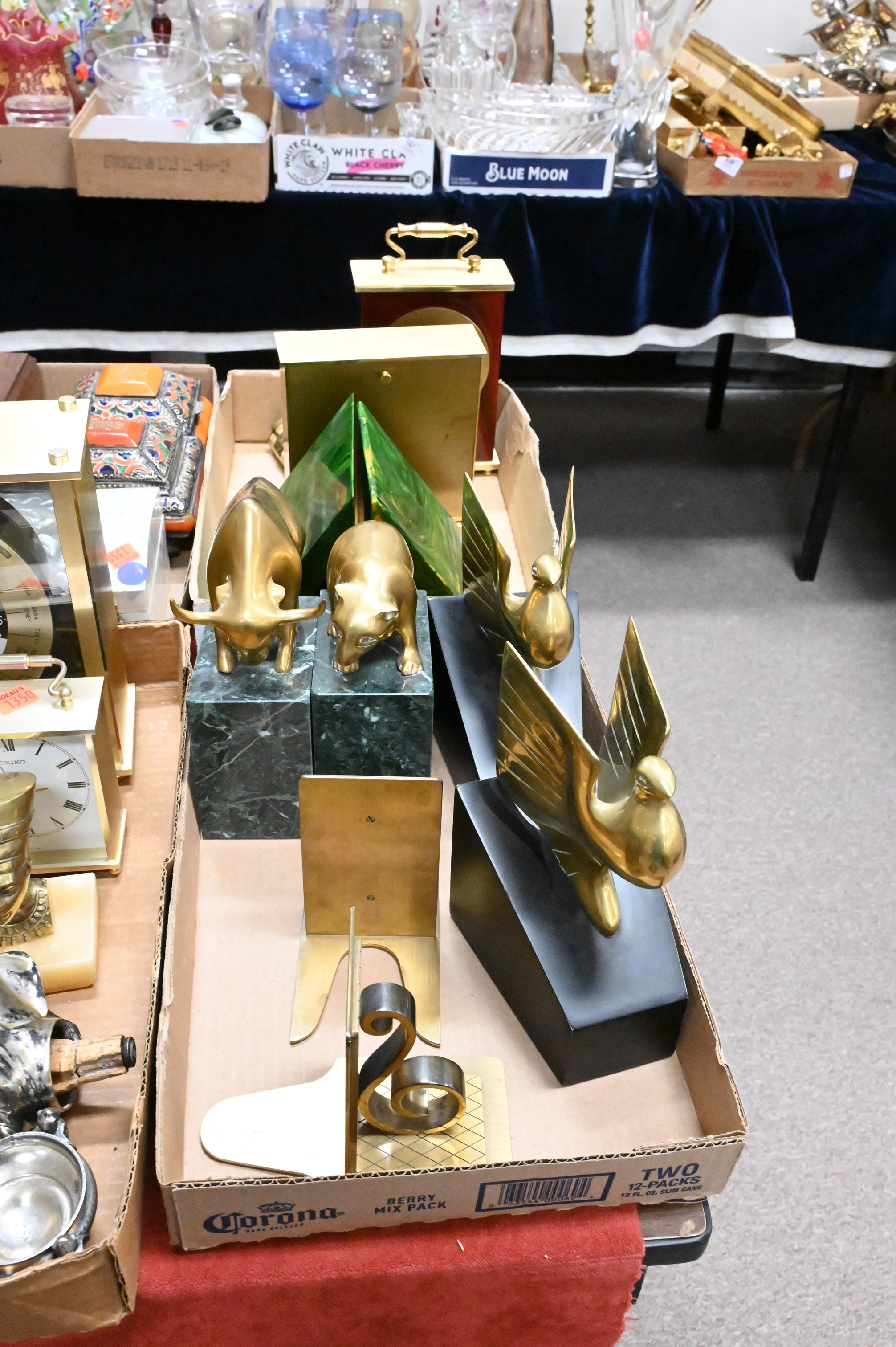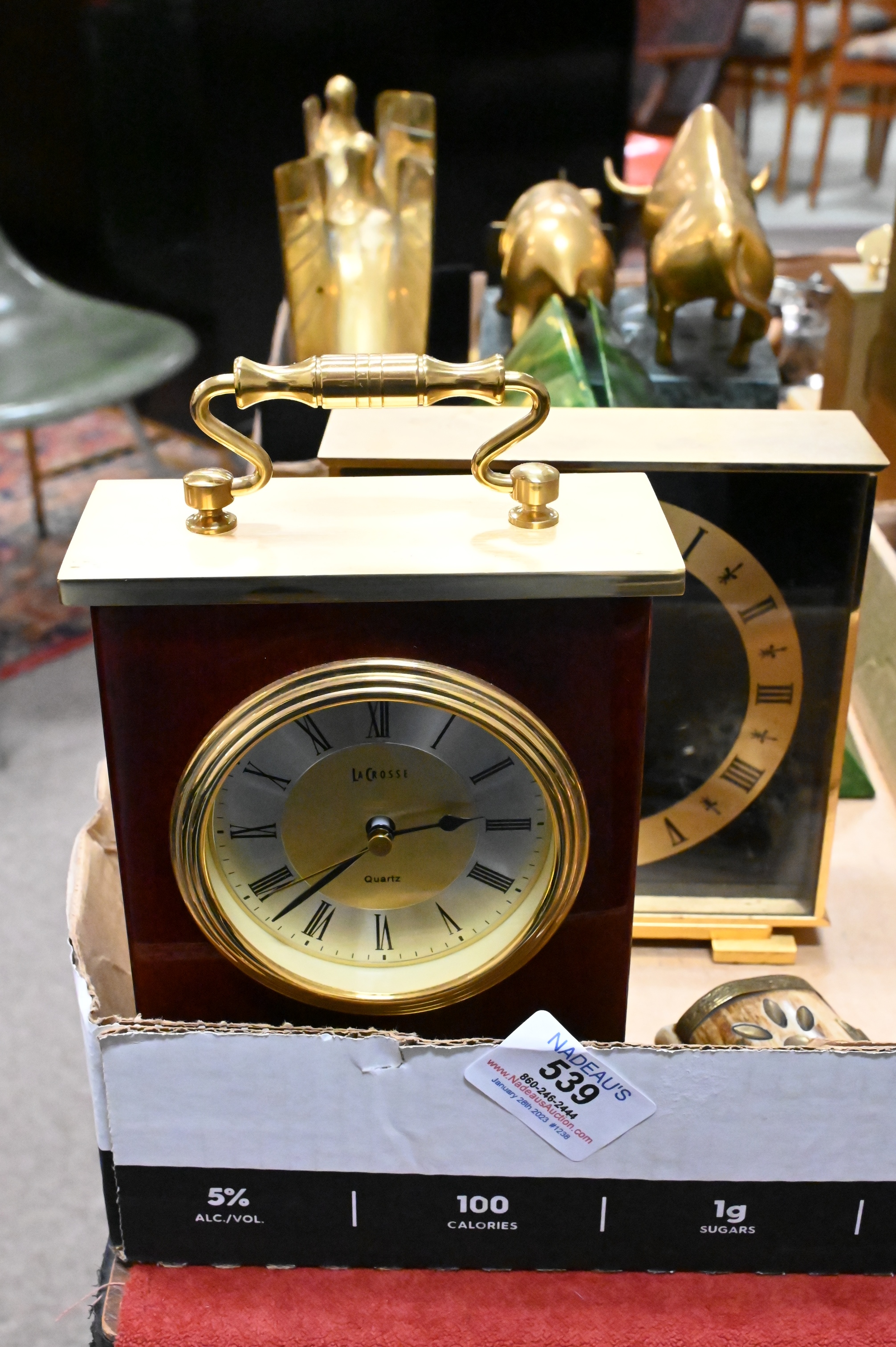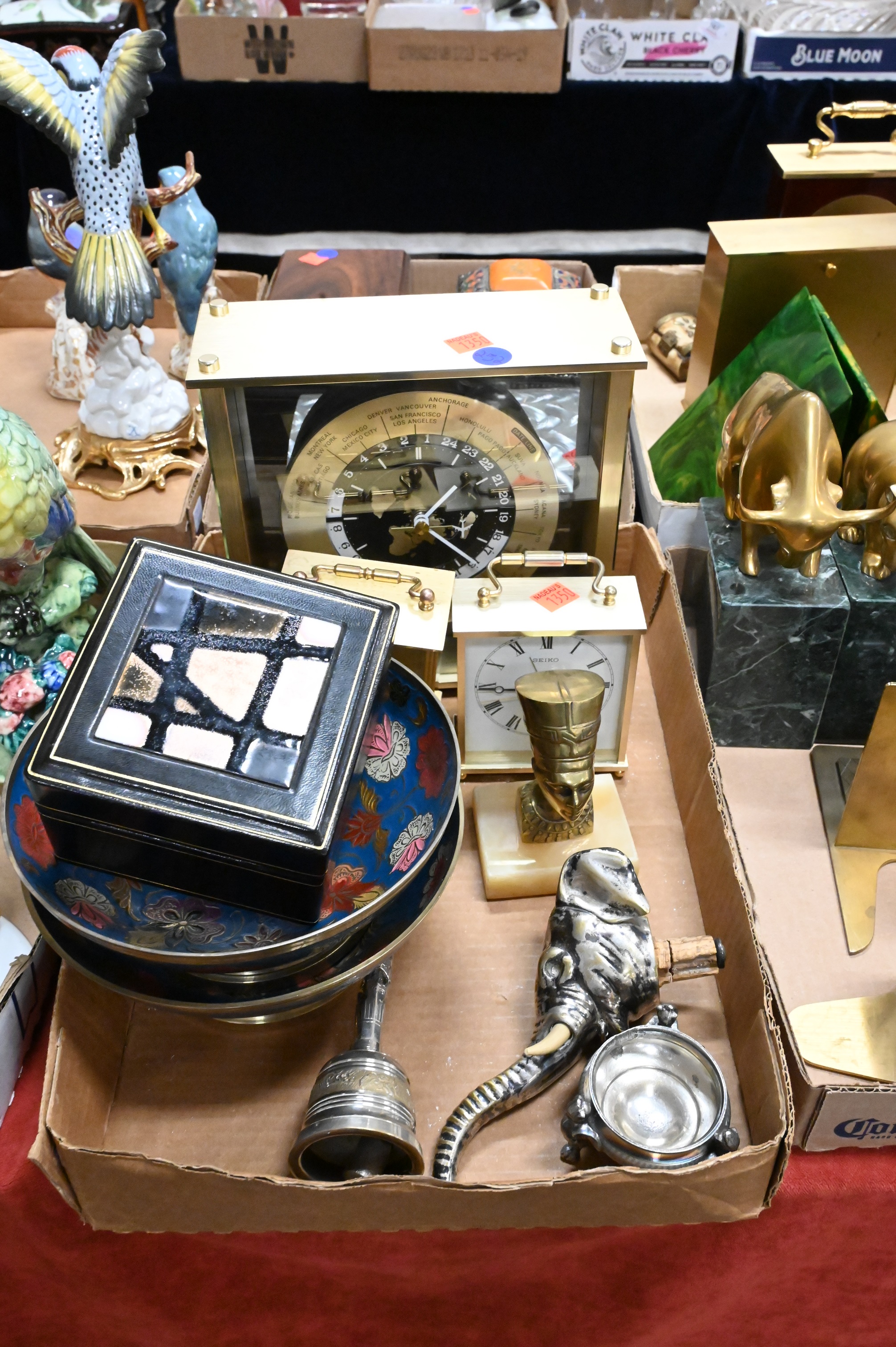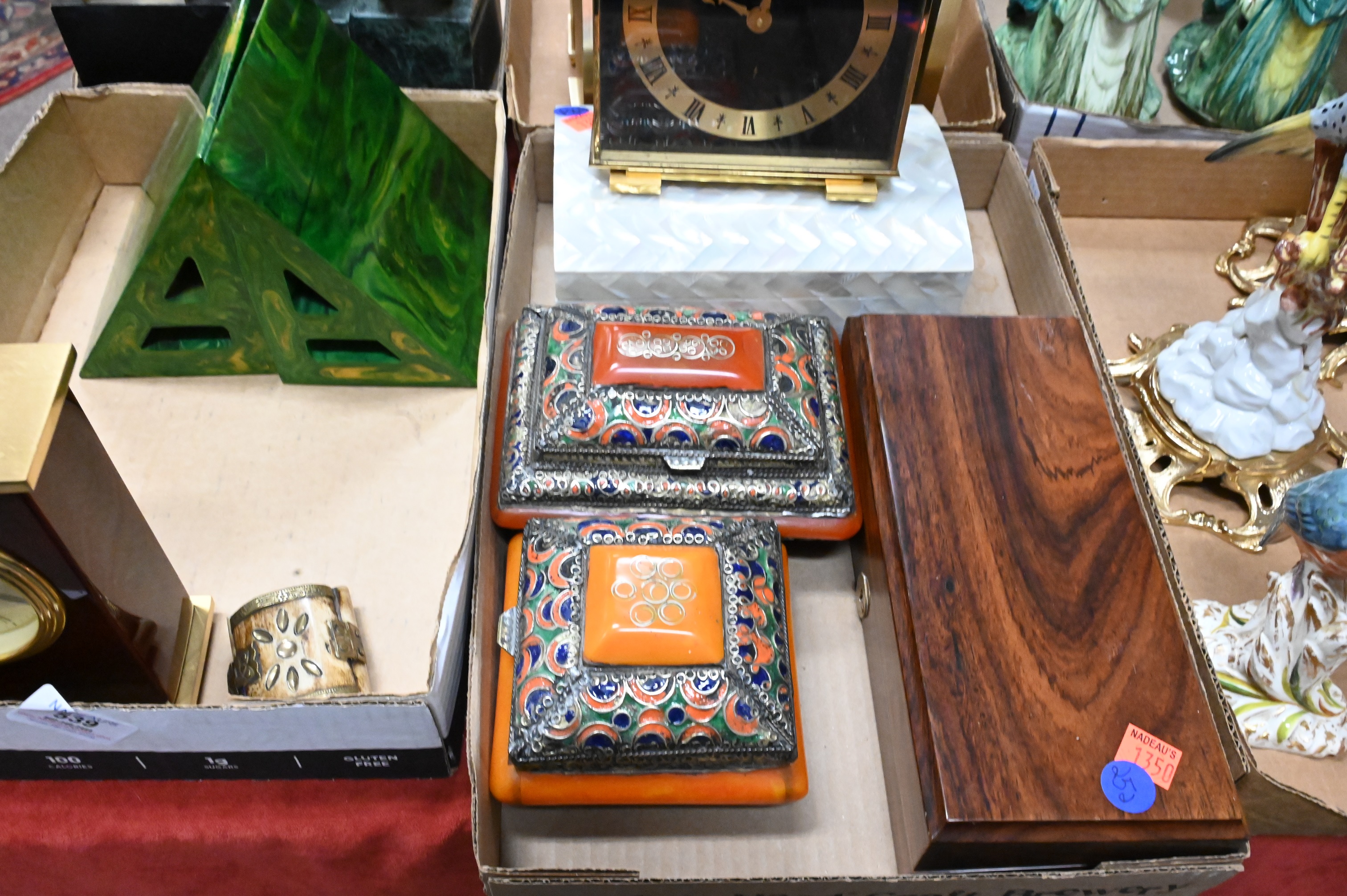 Four Tray Boxes, to include Tiffany & Company brass black dial clock, La Crosse desk clock, brass bookends, mother of pearl box, enameled box, etc. Provenance: Property from a private New York collection sold to benefit charitable foundations.
