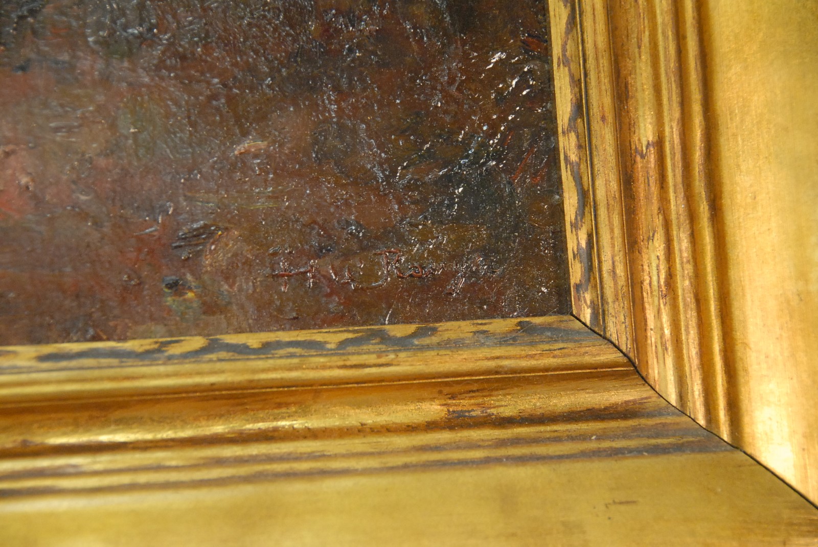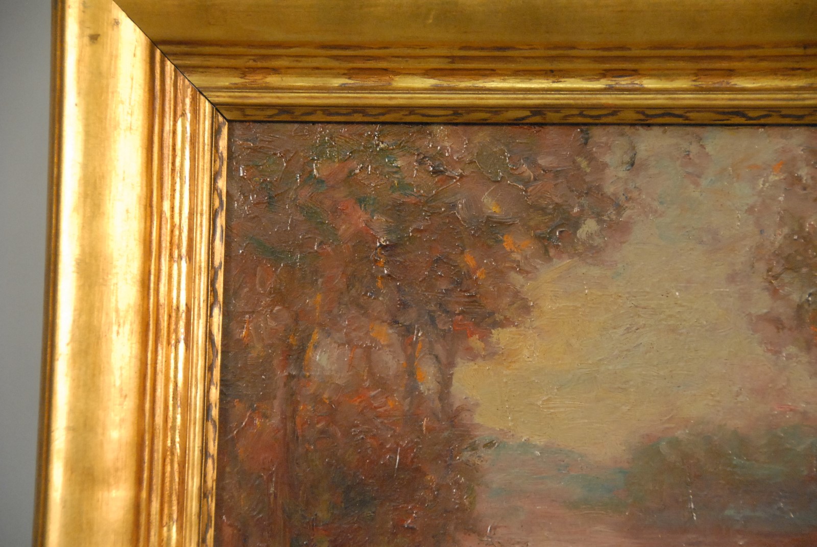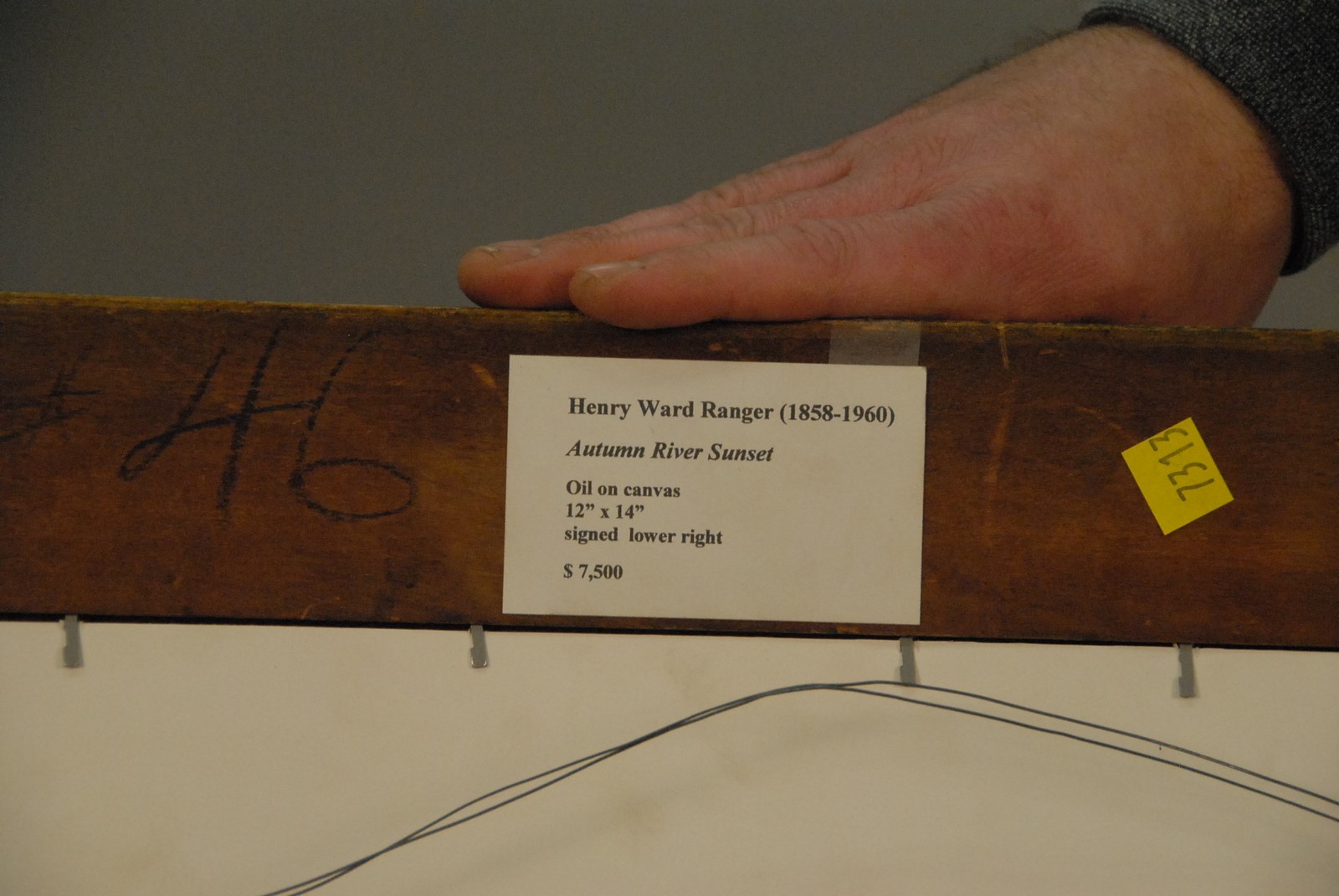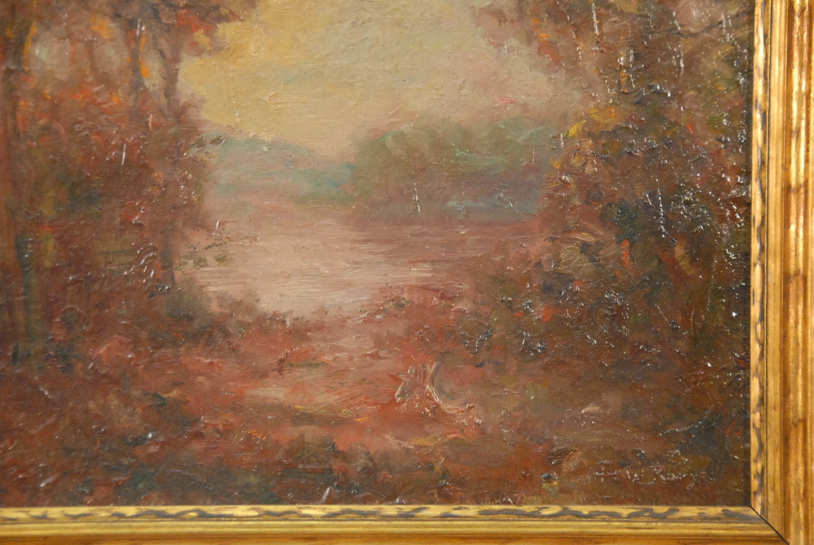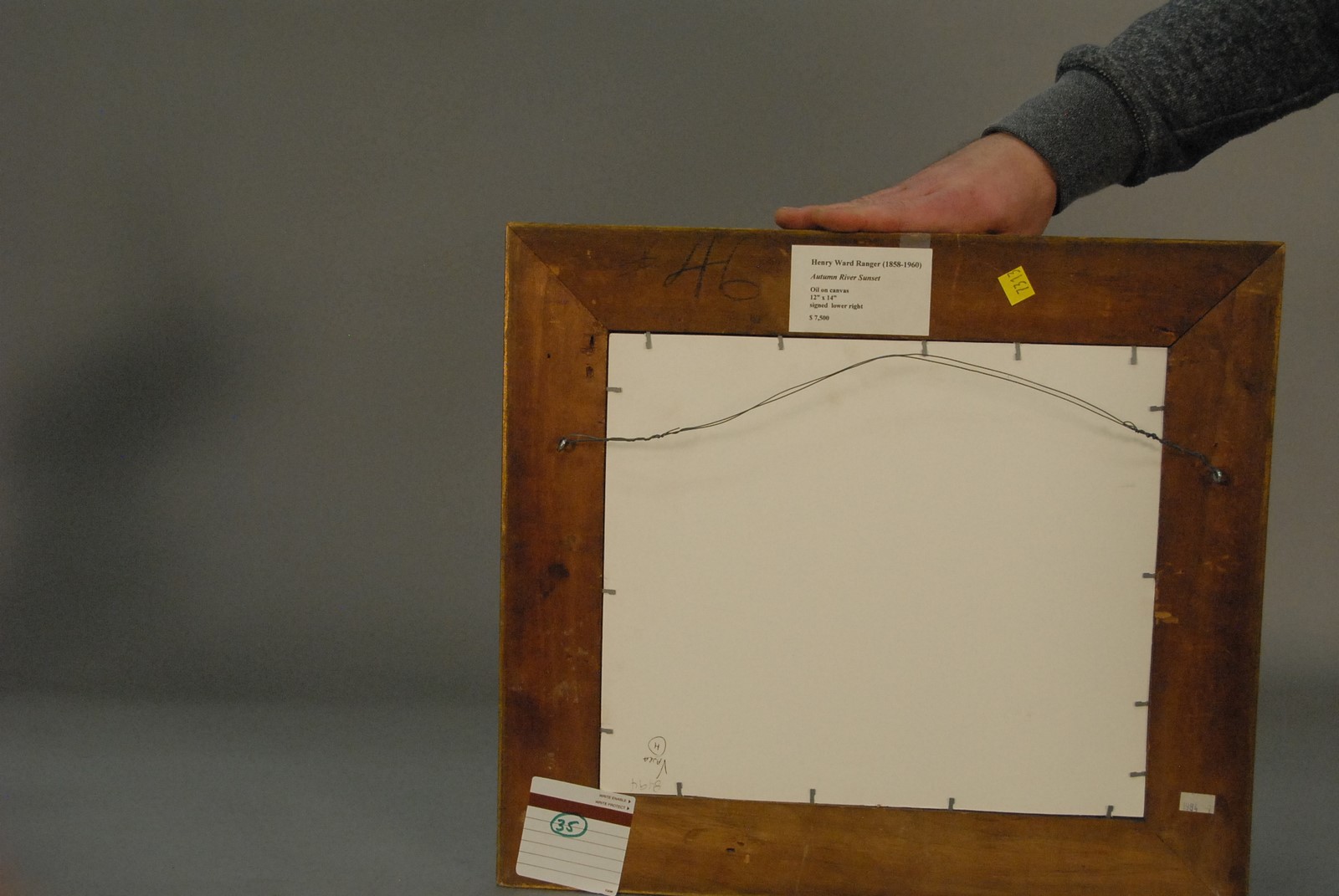 Lot 539: Henry Ward Ranger 1858-1916 AUTUMN RIVER SUNSET oil on board signed lower right H. W. Ranger 12 x 14
