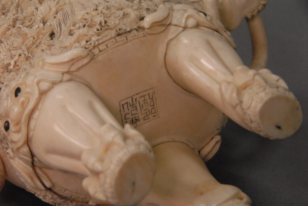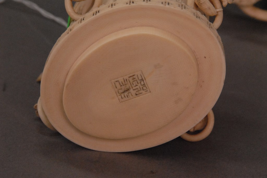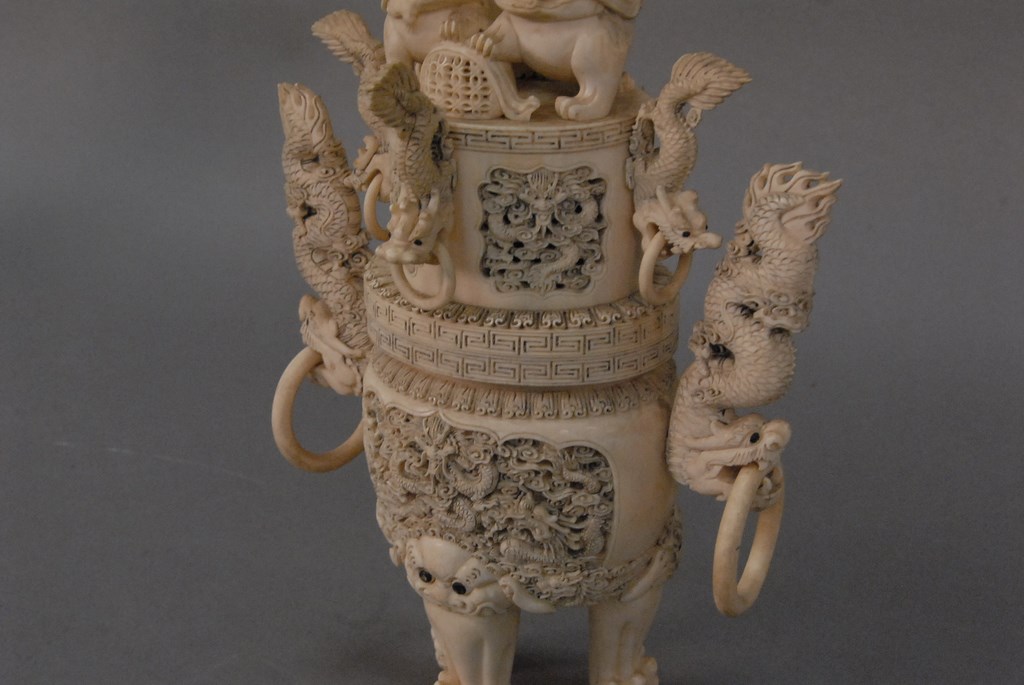 Lot 539: Large ivory covered dragon urn having carved dragon handles with rings in their mouth, two intricately carved panels with dragons, c…