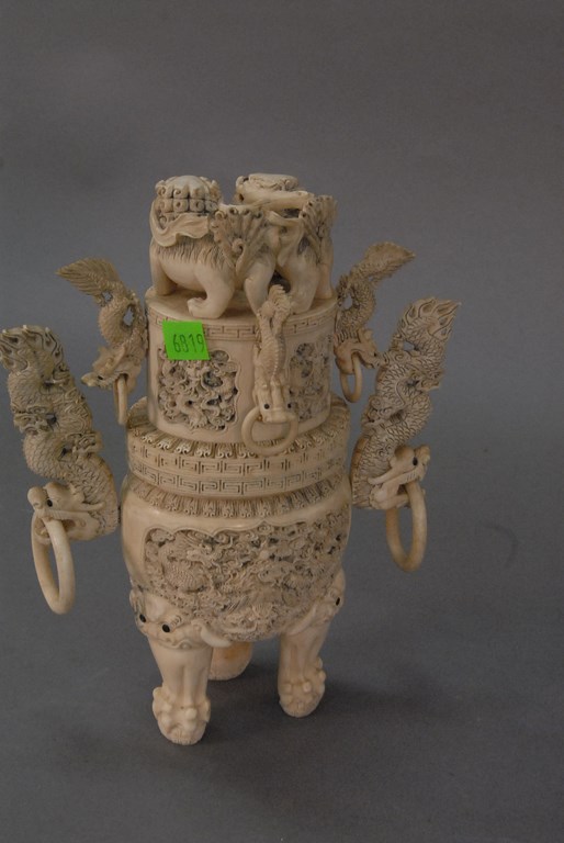 Large ivory covered dragon urn having carved dragon handles with rings in their mouth, two intricately carved panels with dragons, cover having four carved dragons with loops and two foodogs on top all set on tripod claw feet. ht. 10 1/2in.