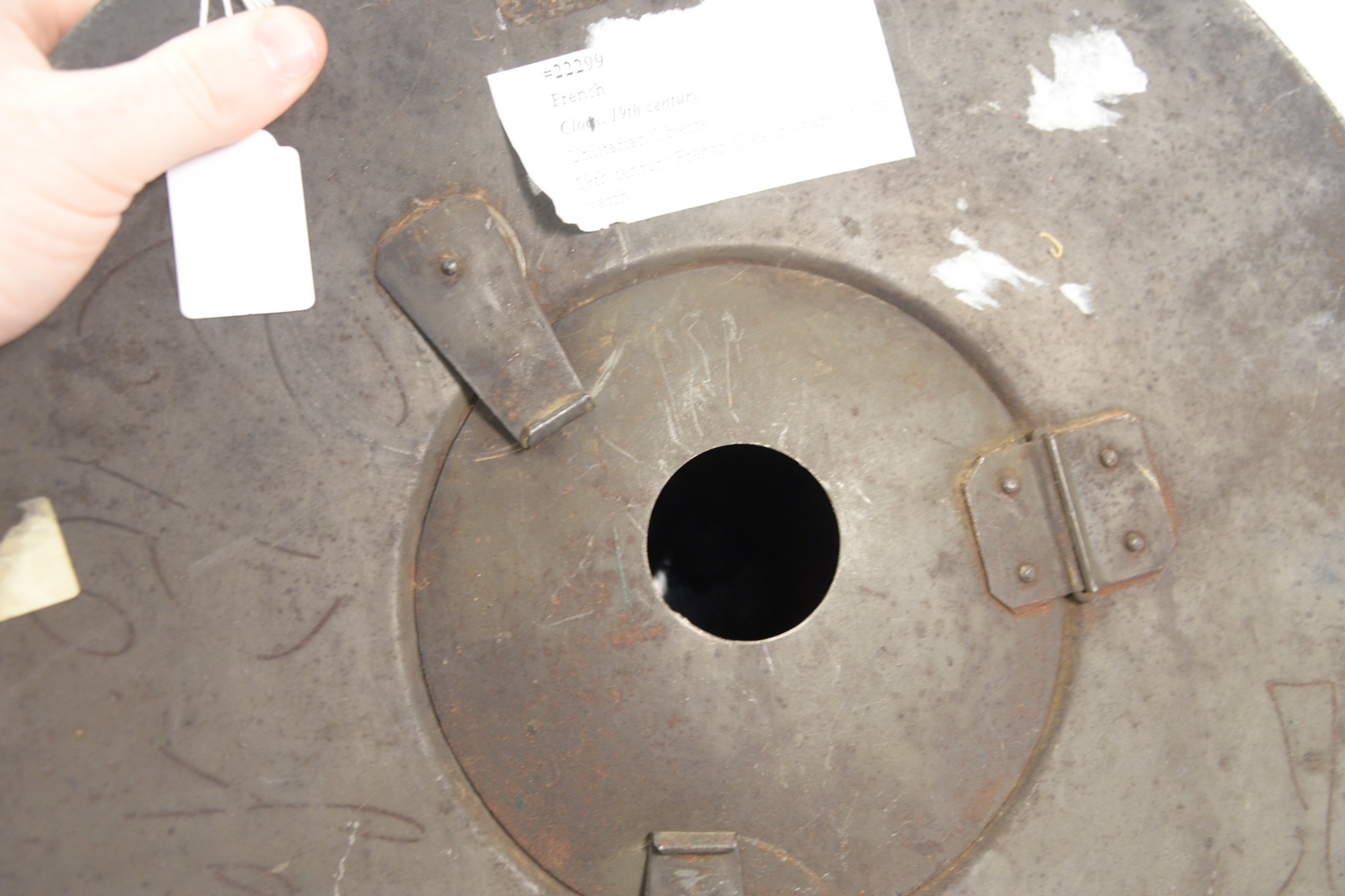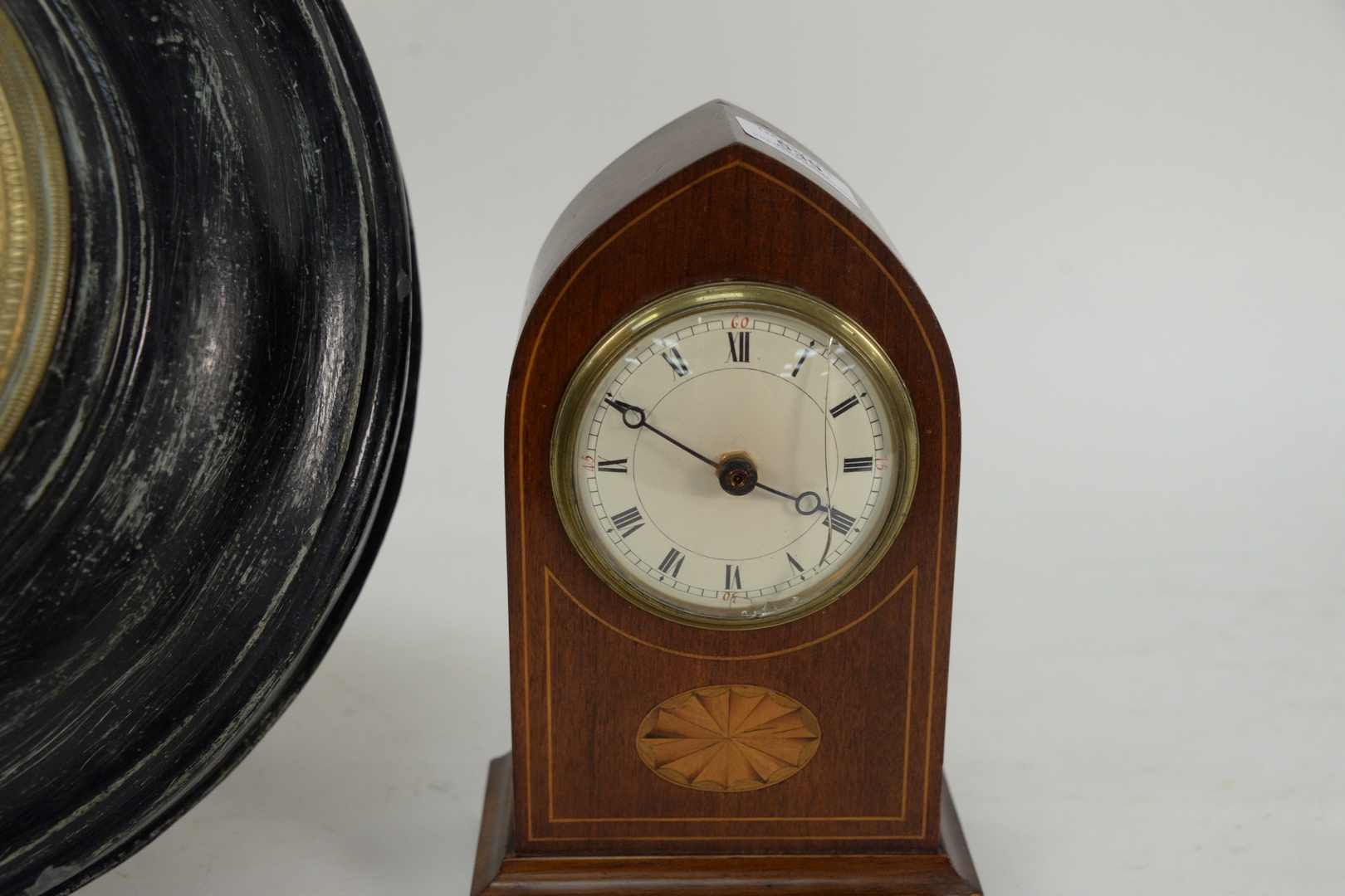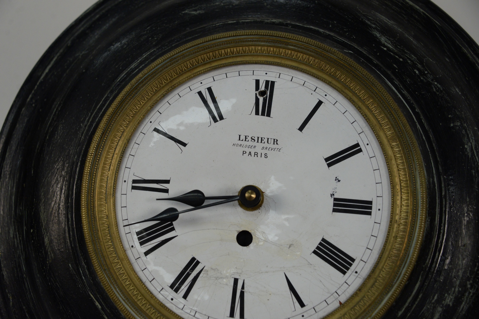 Lot 539: Two Clocks, to include Lesieur round hanging clock having enameled dial, marked Lesieur Horloger Brevete, Paris, diameter 15 inches, with painted tin body along with small mahogany inlaid mantle clock, height 9 1/4 inches.