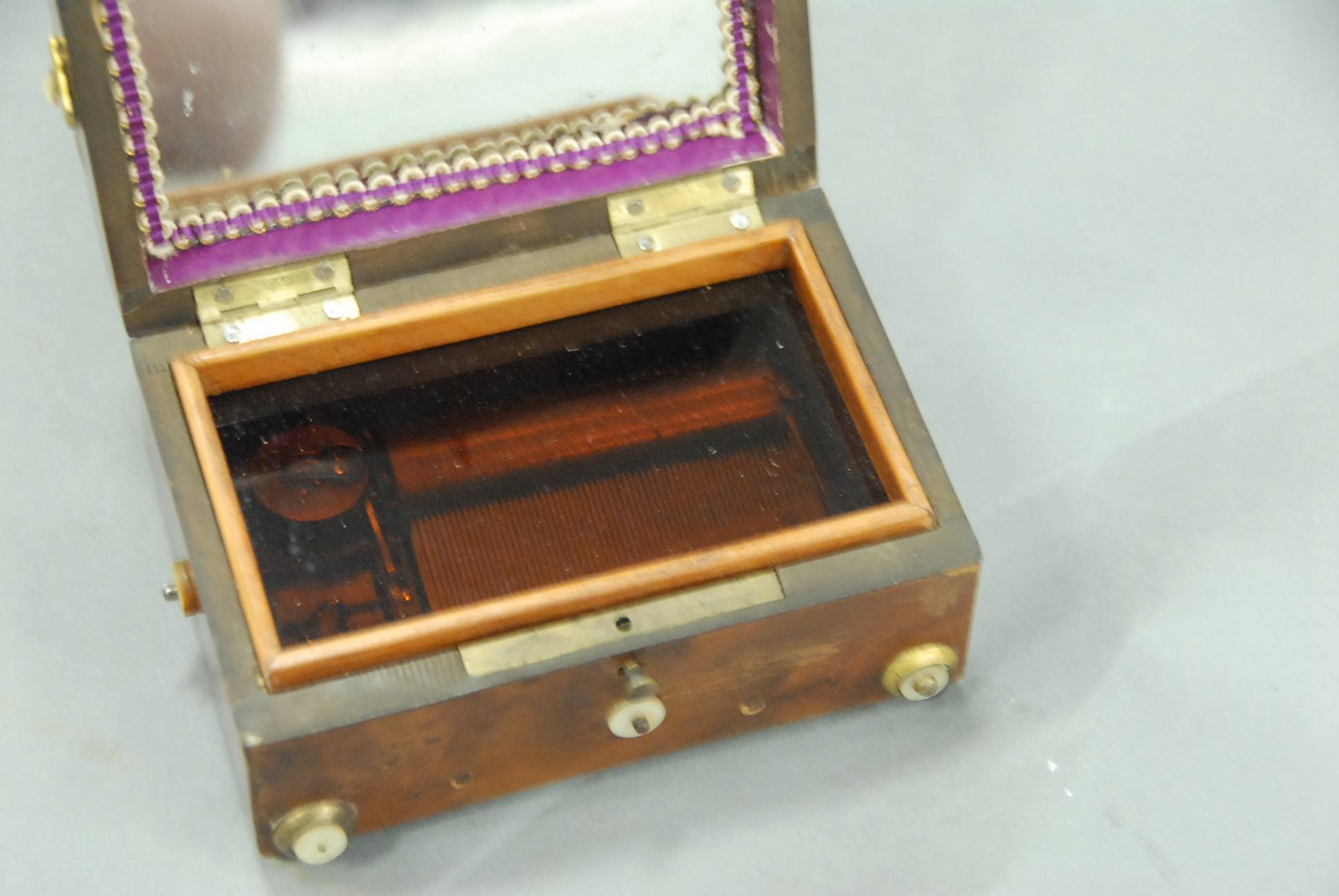 Brass and mother of pearl mounted small music box on brass ball feet.