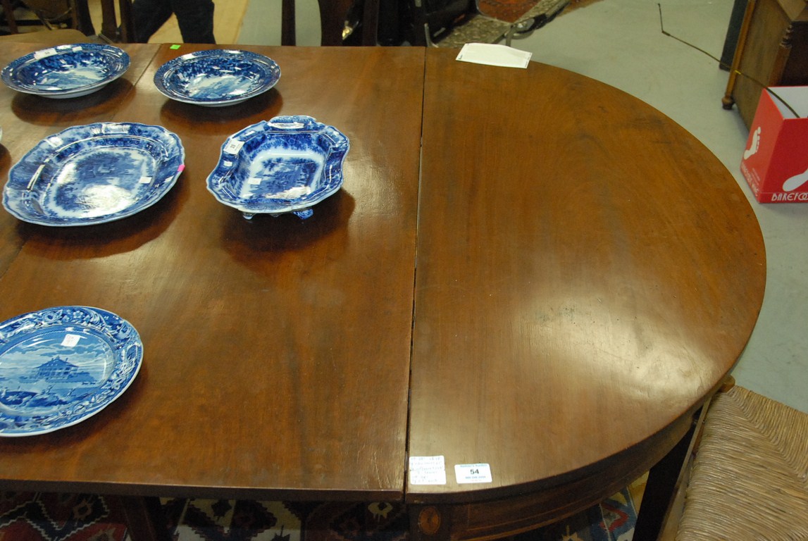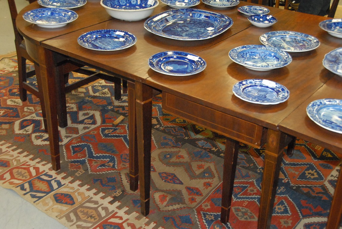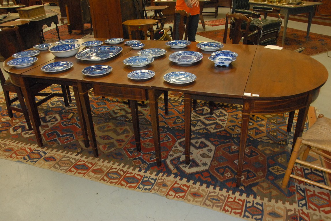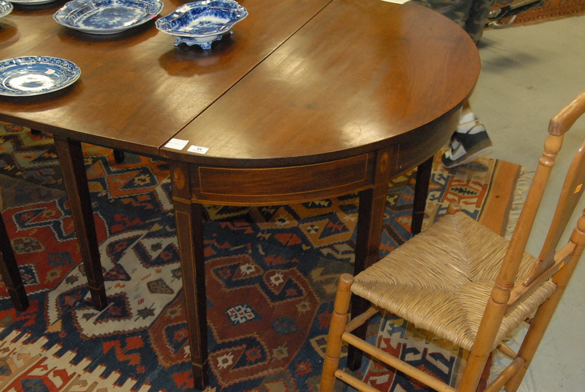 Lot 54: Federal mahogany three part dining table with panel and line inlays having two drop leaves and two additional leaves. ht. 29in. clo…