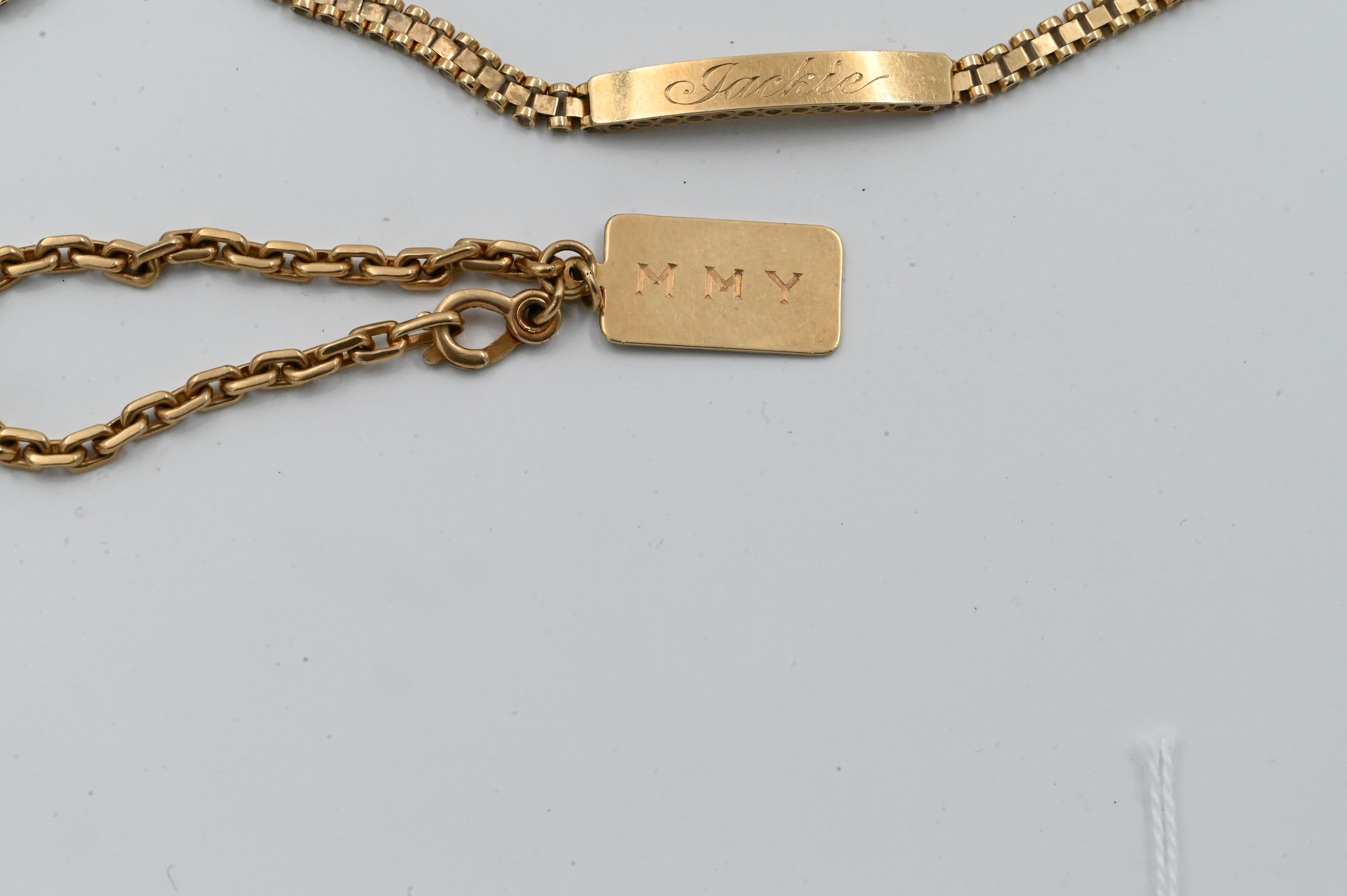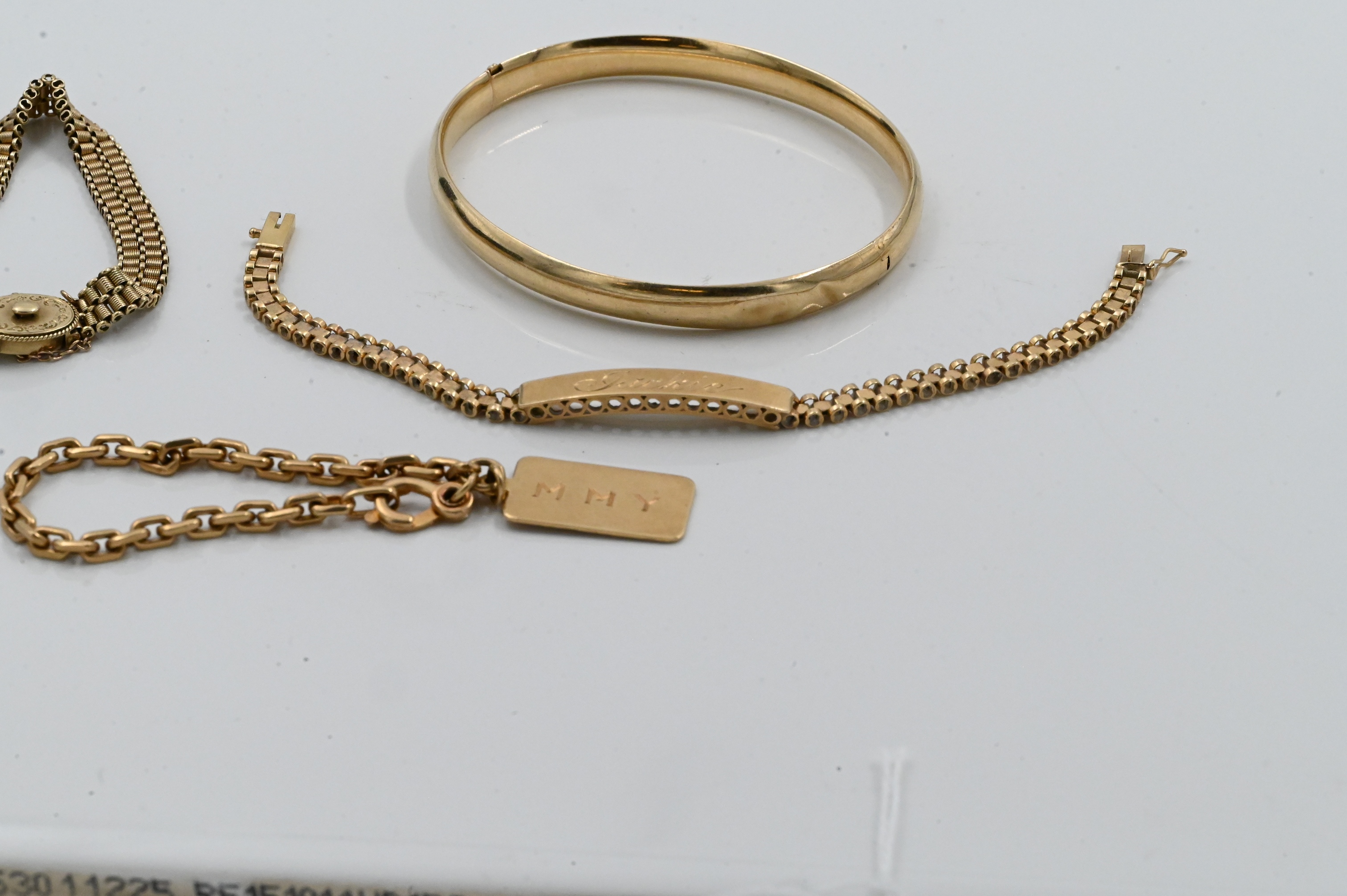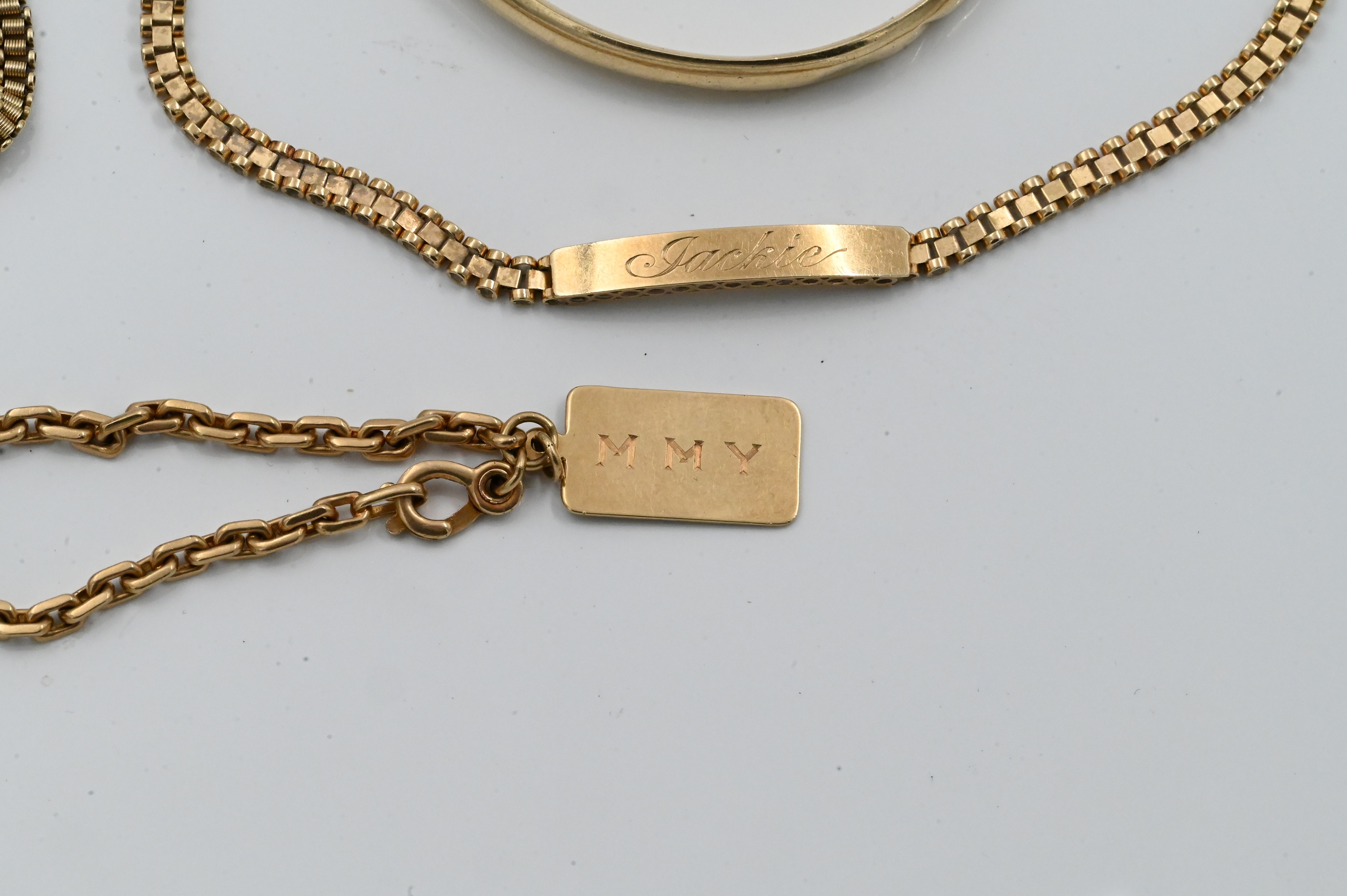 to include one bangle, one with a name plate, one with a tag, and one with oval shaped clasp