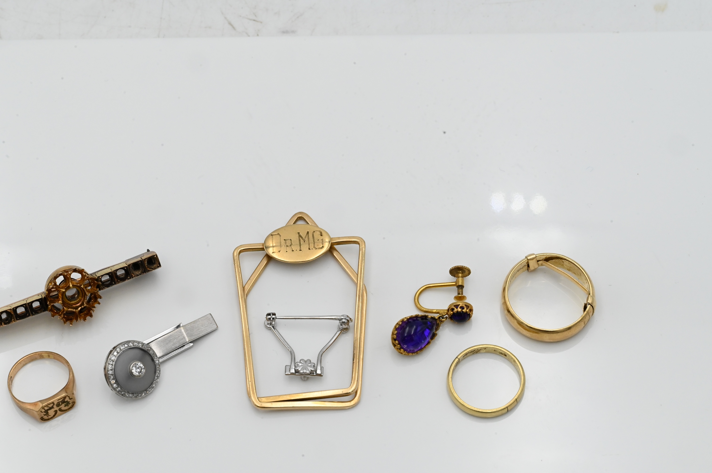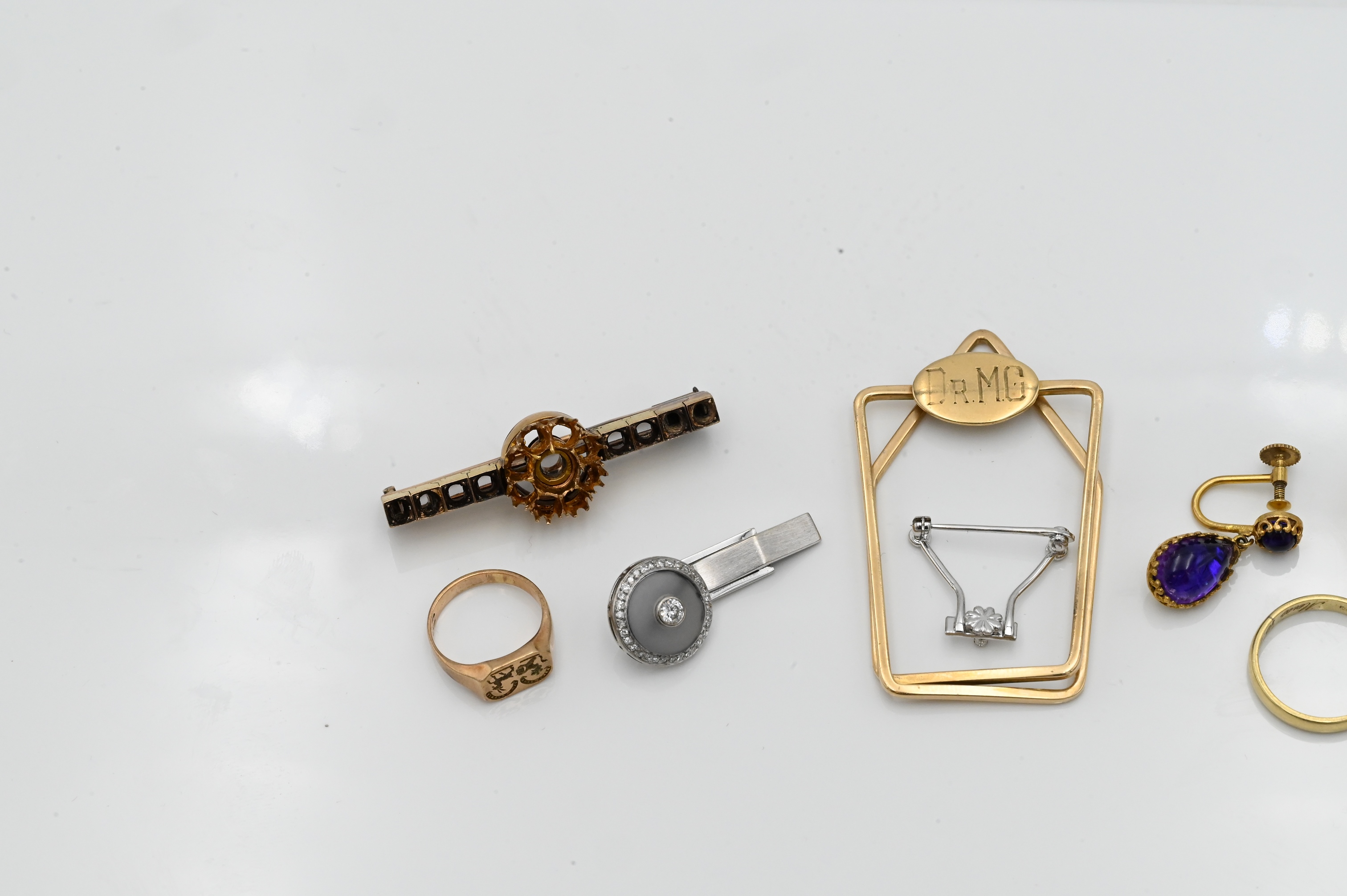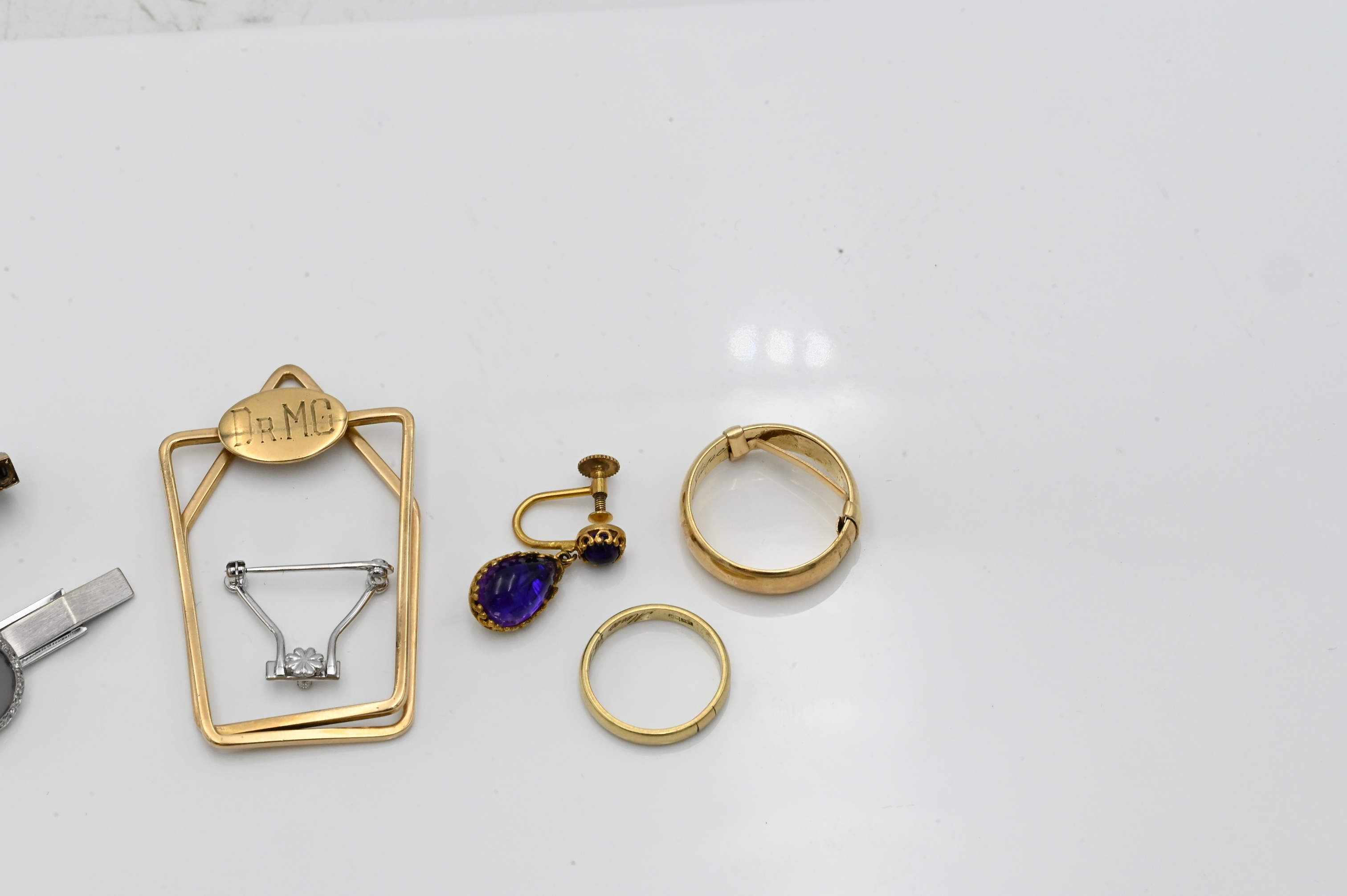 money clip, rings, one brooch mount only, 18K white gold cufflink with diamonds