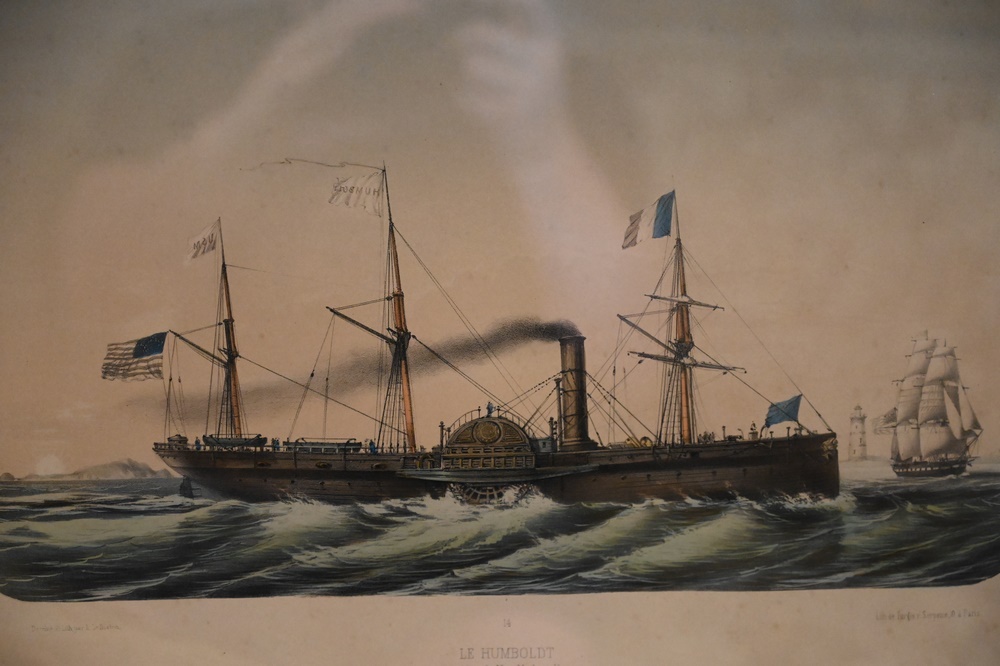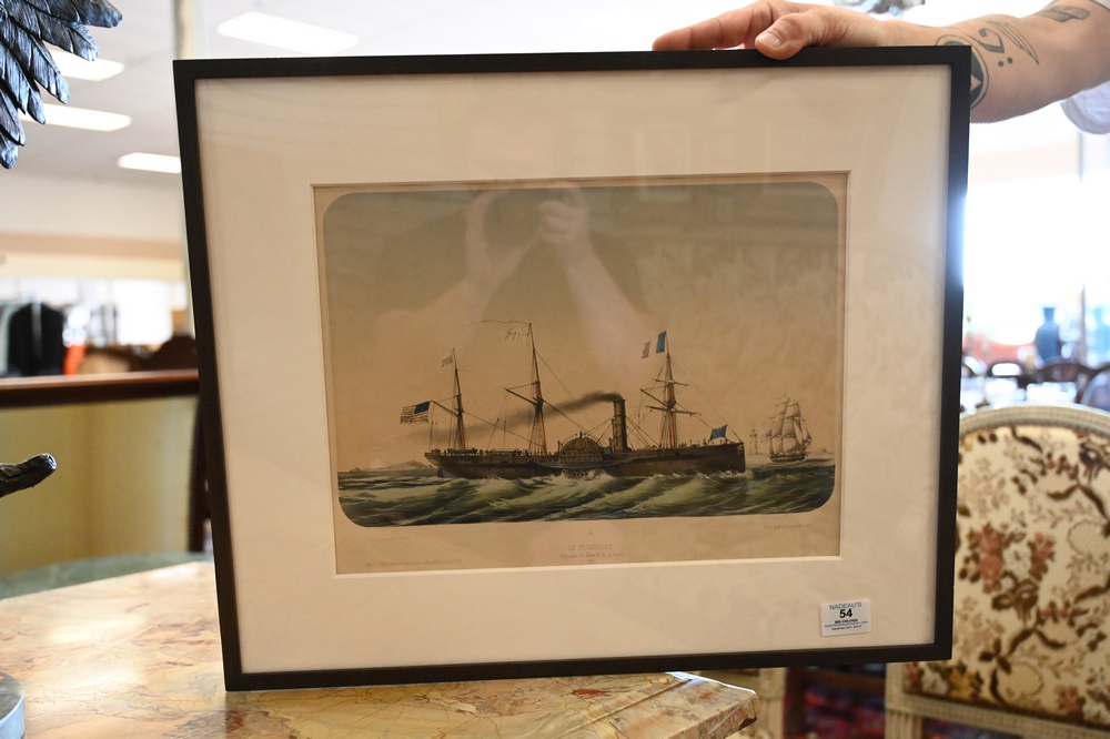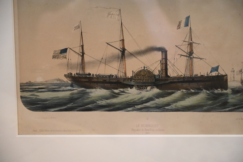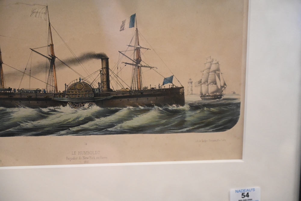 Lot 54: “Le Humboldt, Paquebot de New York-au-Havre”, circa 1851, printed by Turgis, lithograph with hand coloring on paper, sight size 9 1/2″ x 14 1/2″.