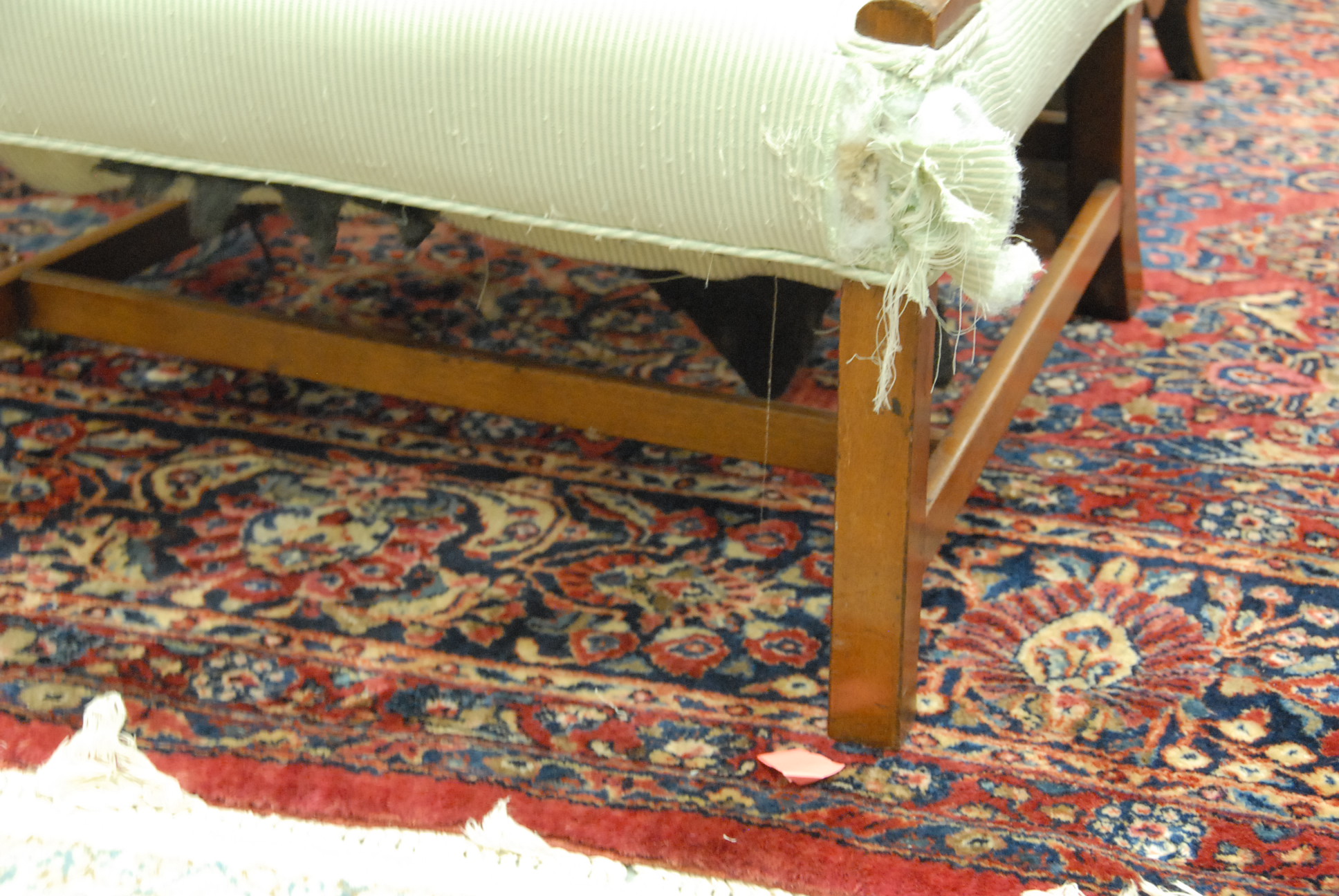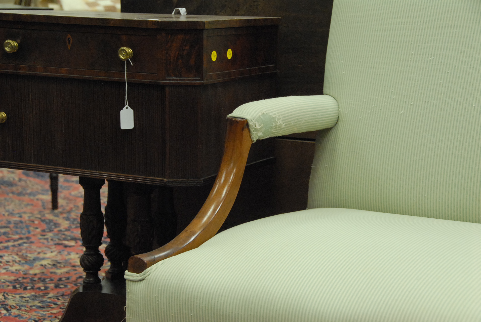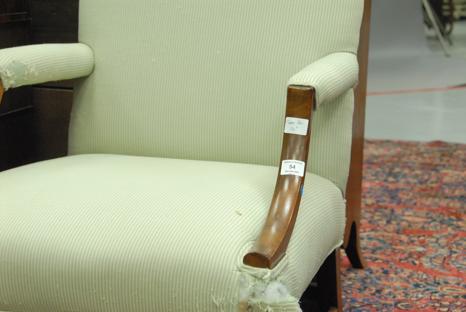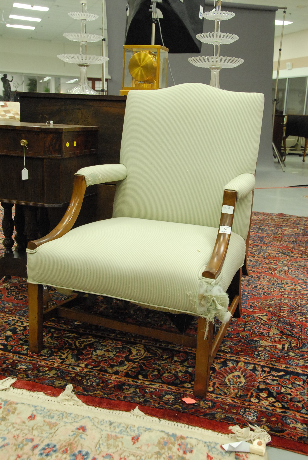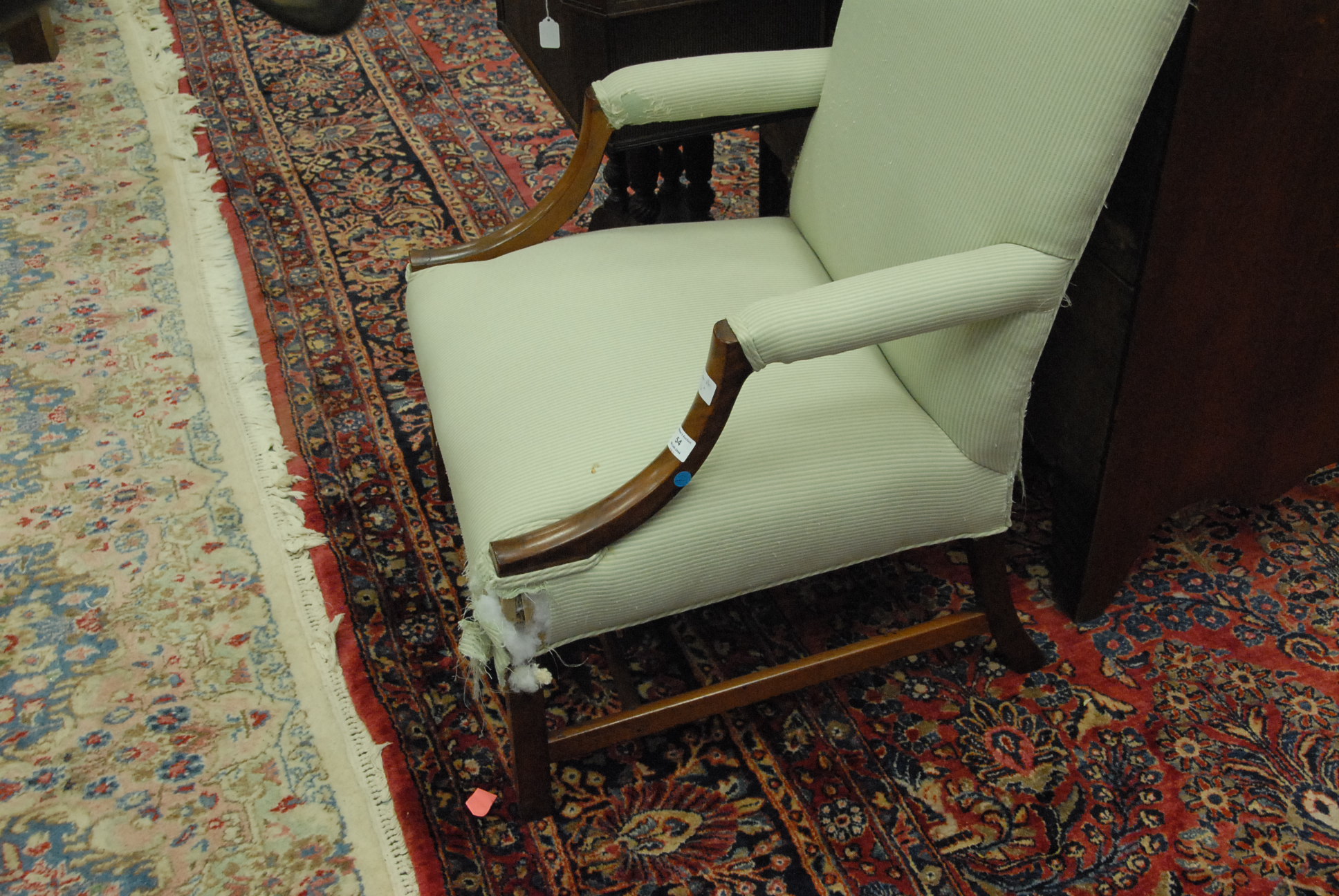 Mahogany Chippendale upholstered armchair with stretcher base, circa 1780.