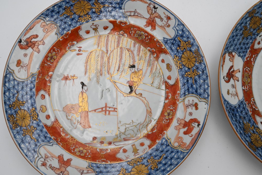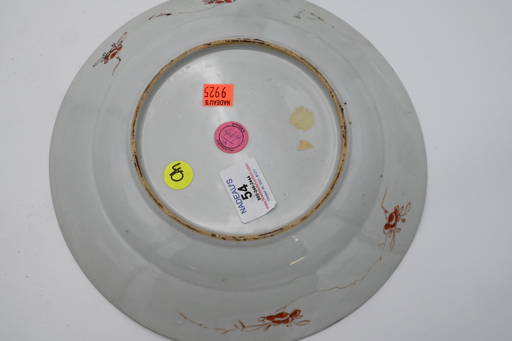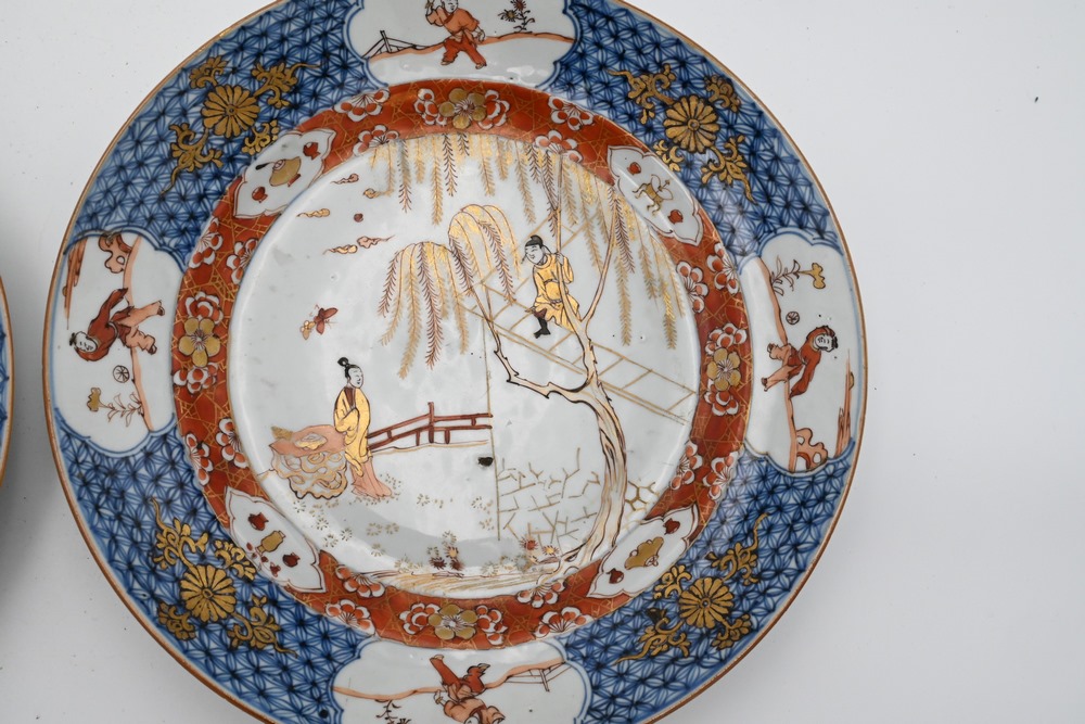 Lot 54: Pair of Chinese Export Porcelain Dishes or Chargers painted courtyard center decoration of man scaling garden wall to meet woman, blue cross hatching and four vignettes with rouge-de-fer figure decoration and gilt accents Kang XI 17th or 18th century old Sotheby’s sale sticker on bottom diameter 10 5/8 inches Provenance: From a private New York City collection.