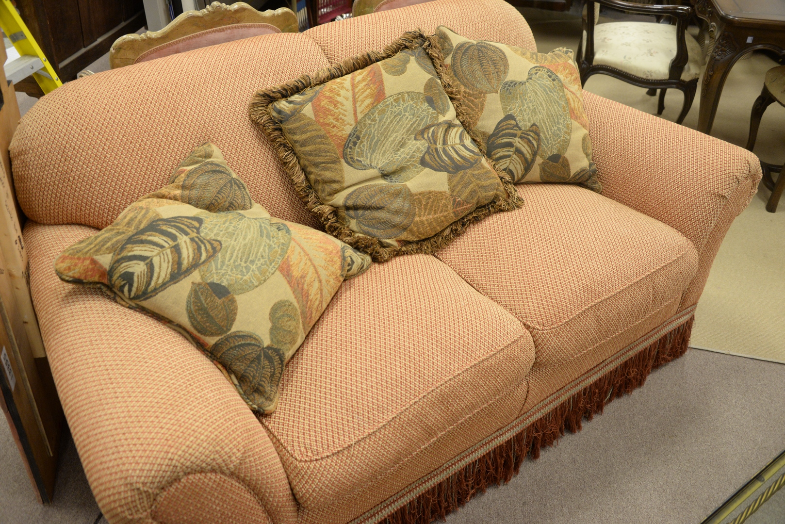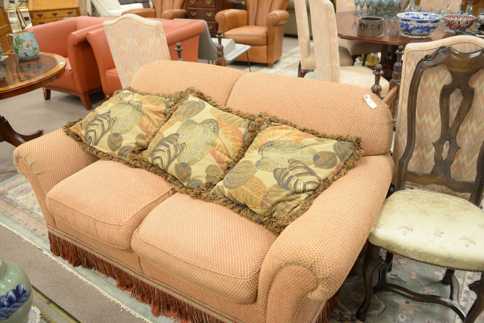 Pair of Custom Upholstered Loveseats, to include six pillows, height 32 inches, length 65 inches.