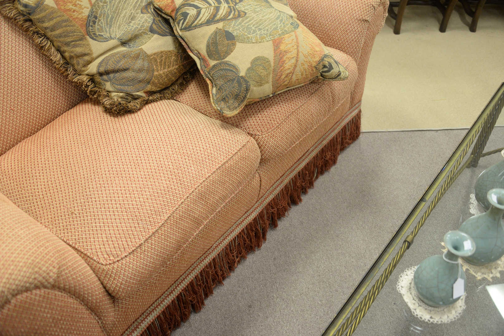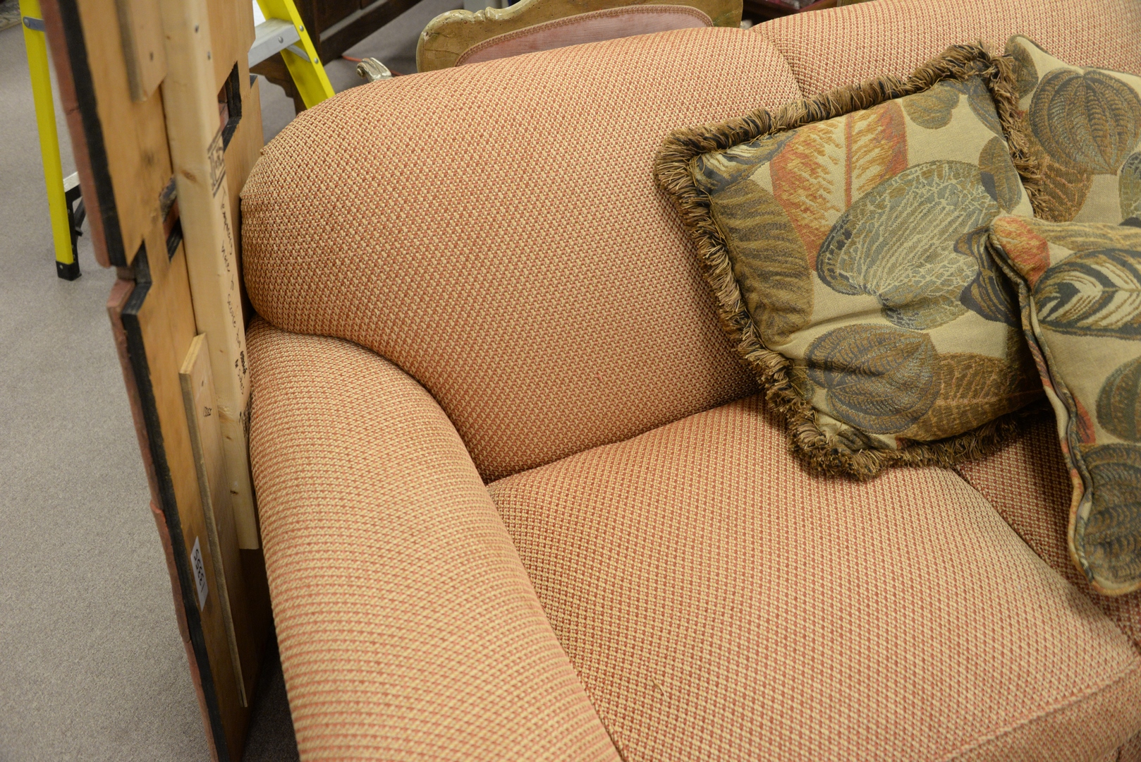 Lot 54: Pair of Custom Upholstered Loveseats, to include six pillows, height 32 inches, length 65 inches.