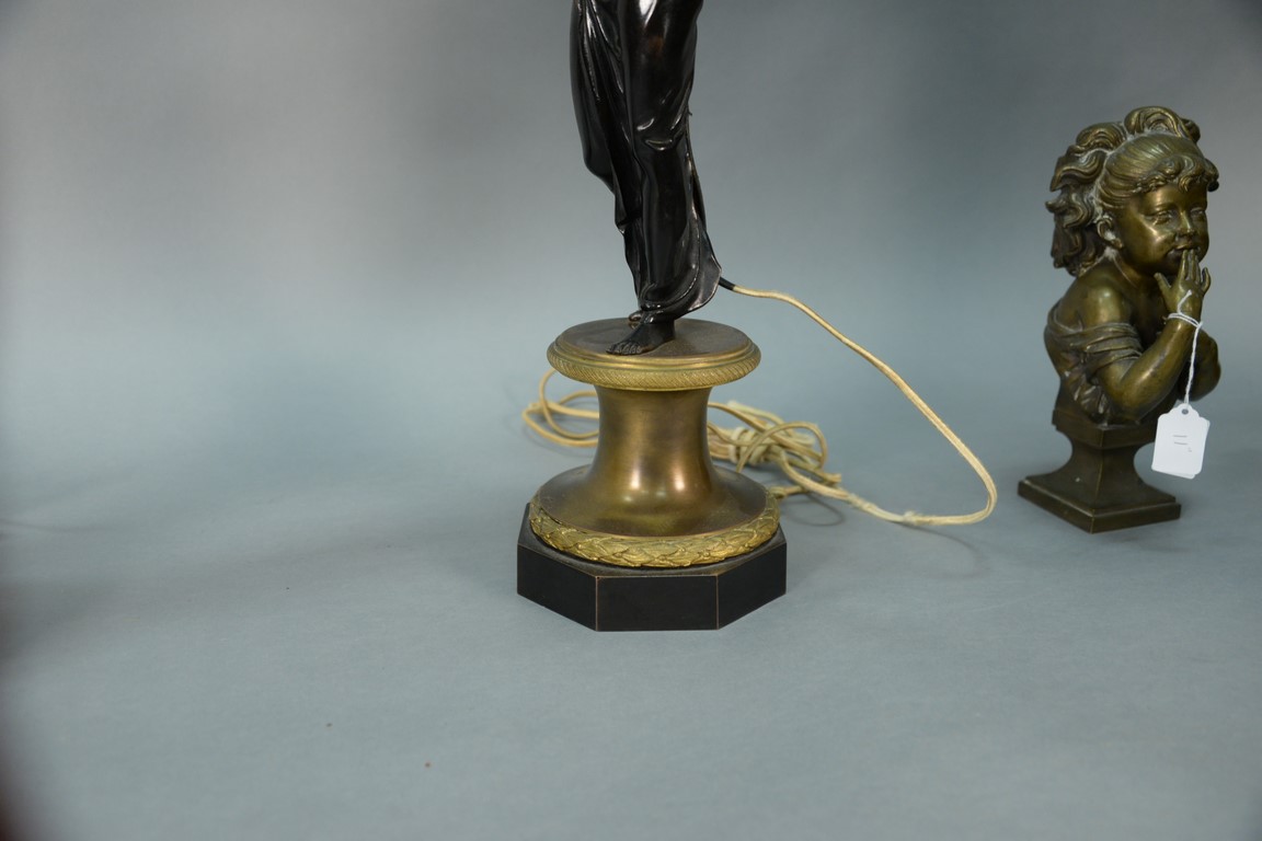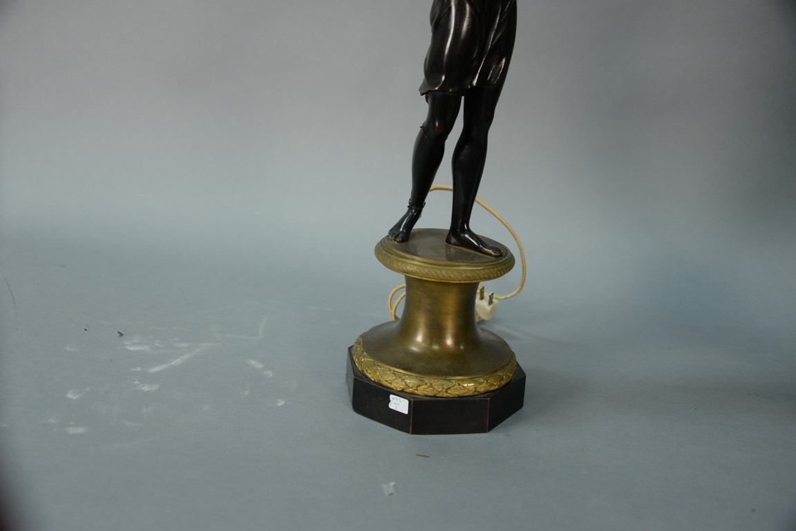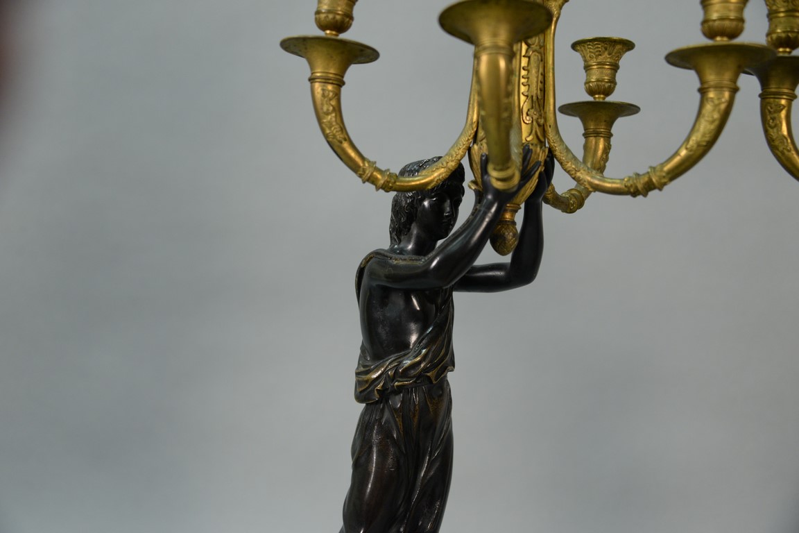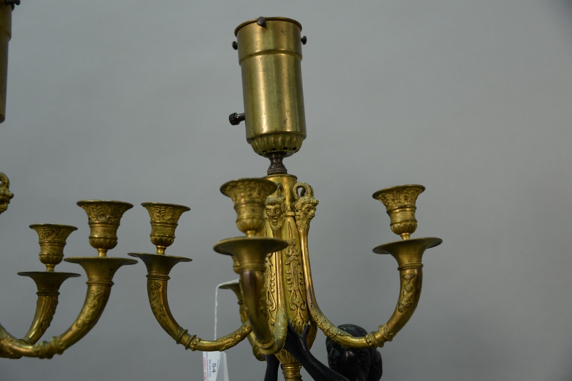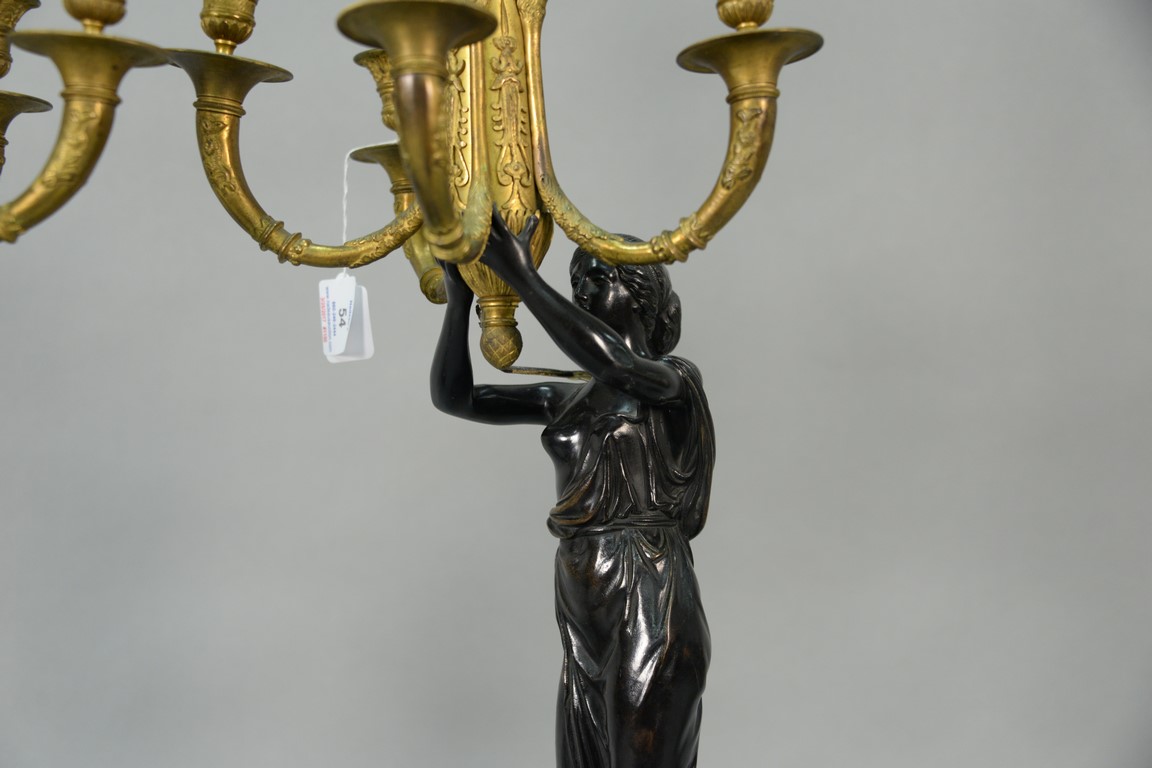 Lot 54: Pair of gilt and patinated bronze four light figural candelabra, late 19th century male and female classical figures holding urns is…