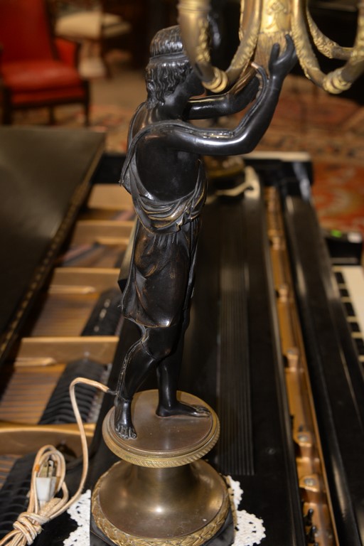 Pair of gilt and patinated bronze four light figural candelabra, late 19th century male and female classical figures holding urns issuing branches with satyr head terminals on bronze pedestal bases. ht. 26 1/2in., wd. 11in.