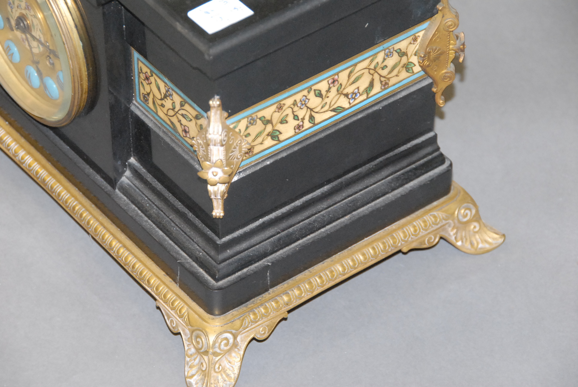 Victorian slate mantle clock, dial marked Shreve, Crump, and Low Boston, with enameled numbers and cloisonn trim and brass mounts.