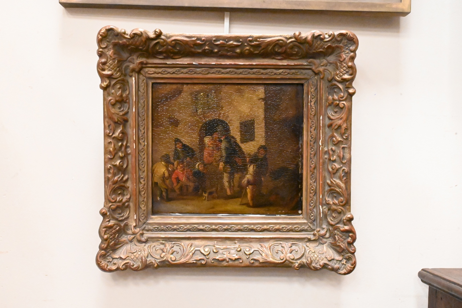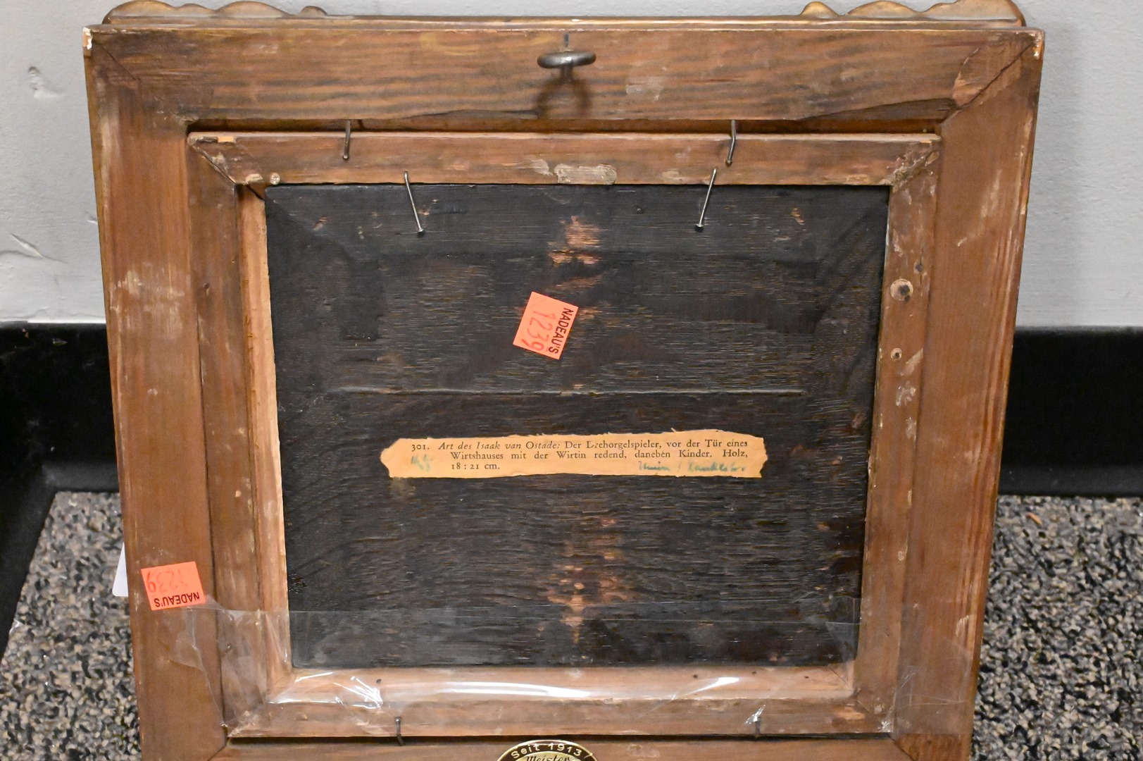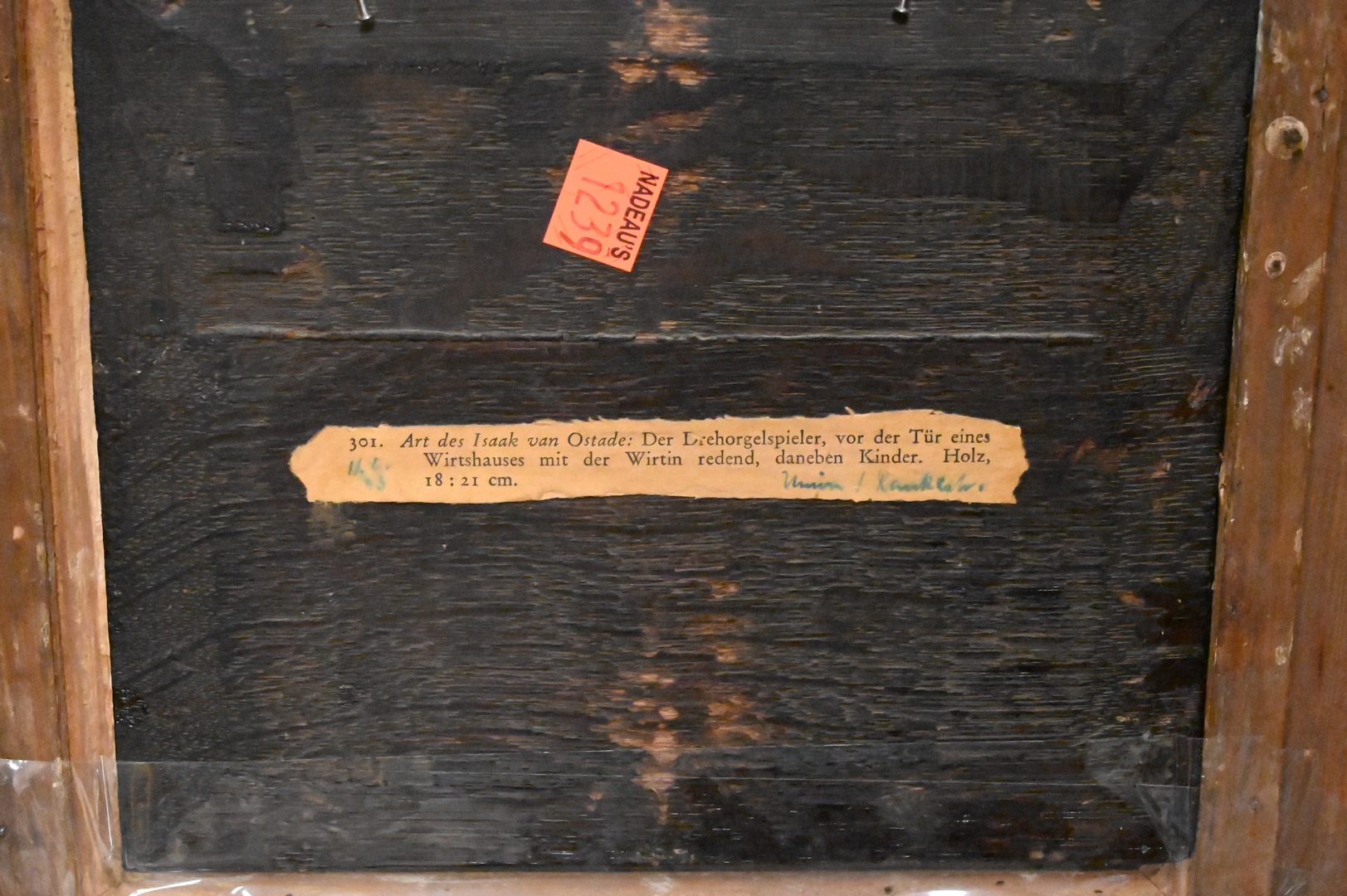 Attributed to Isaac Van Ostade (1621 – 1649), oil on oak panel, courtyard, unsigned, oil paper label on back, 7″ x 8 1/8″.