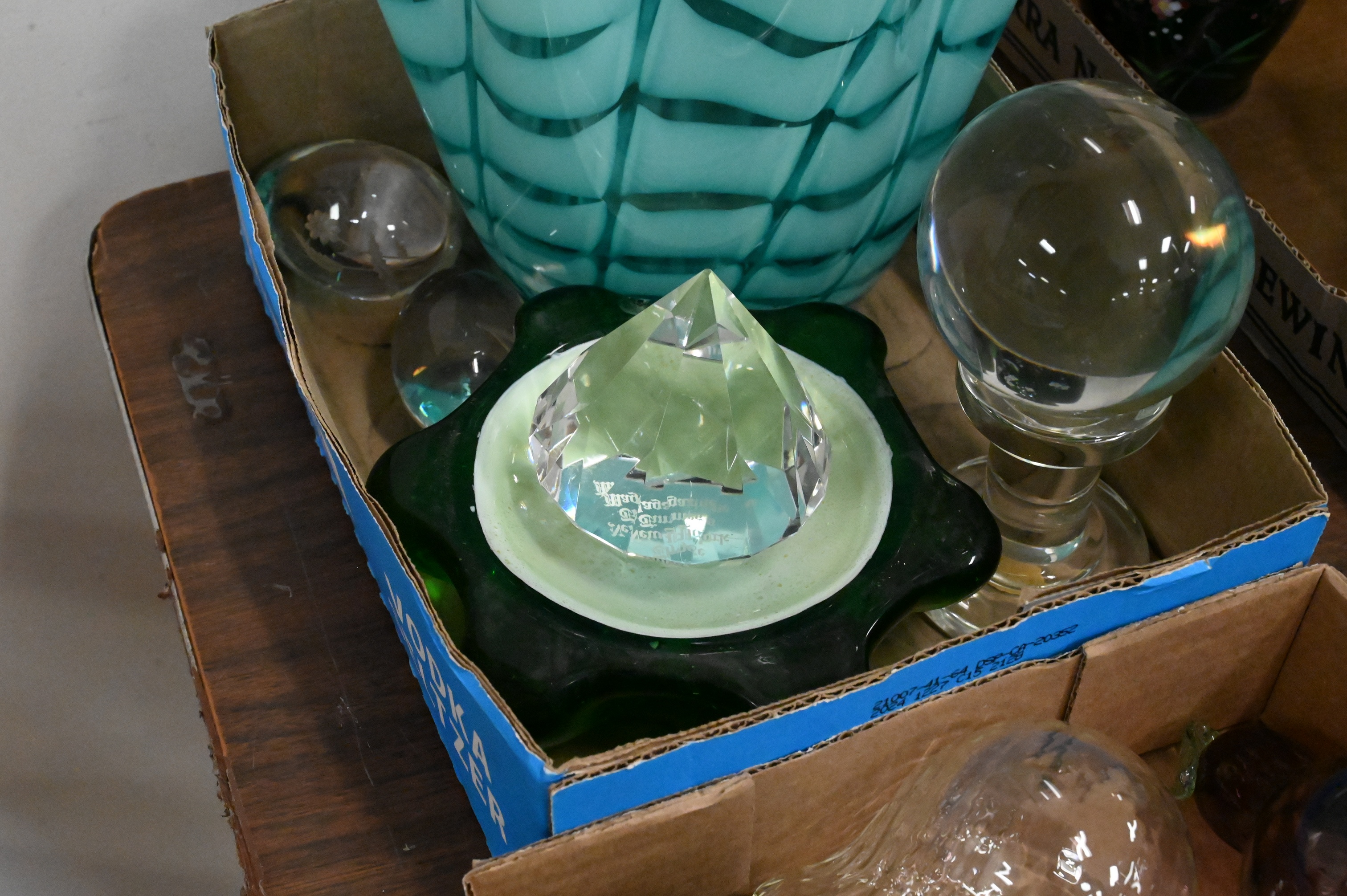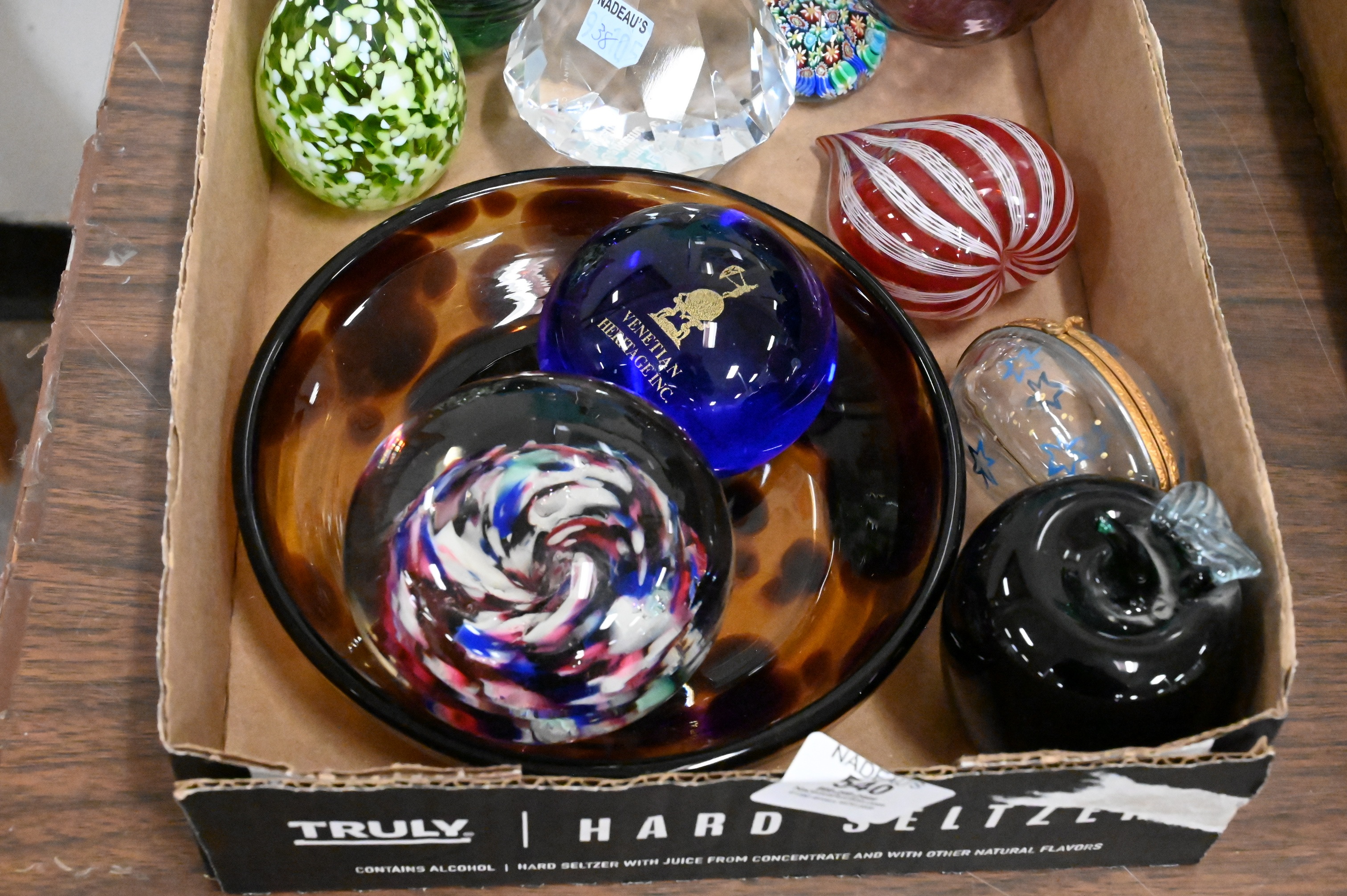 two blown glass eggplants, striped heart marked Dior, Millefiori paper weight, orb on pedestal, turtleshell colored plate, green apple paperweight, turquoise vase, egg shape paperweight etc…
