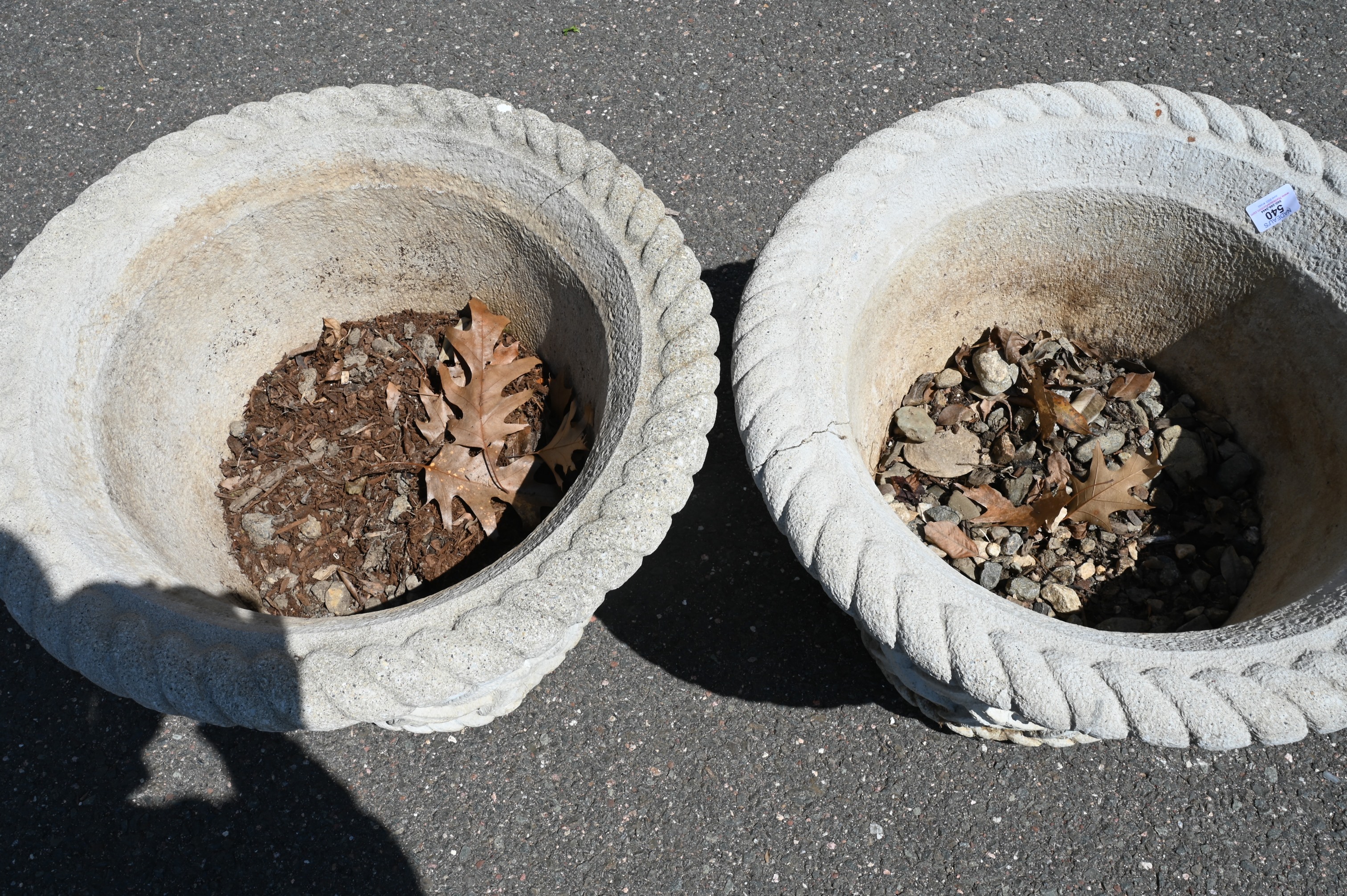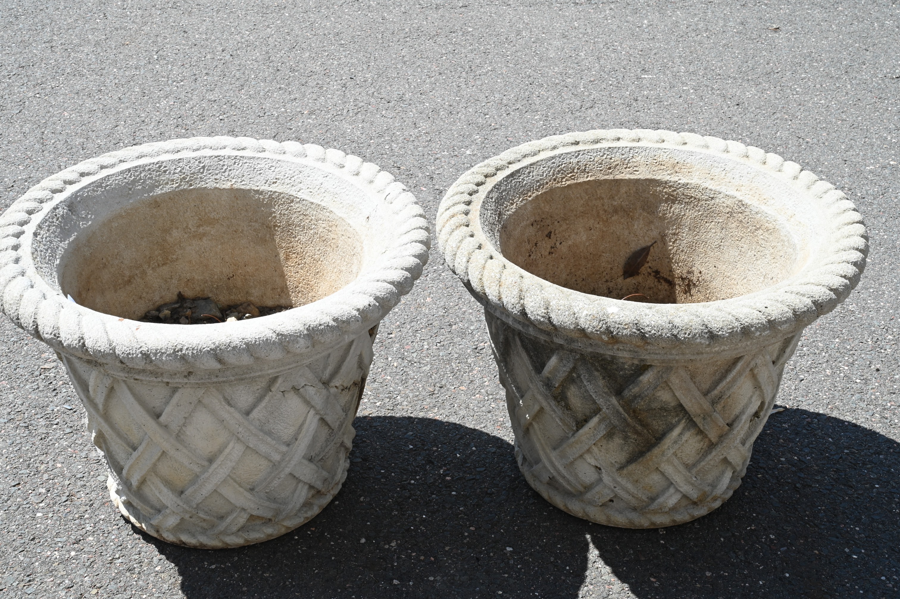 Pair of Outdoor Cement Urns/Planters, each with basket weave design, height 18 inches, diameter 24 inches, Provenance: A Private Collection from Greenwich Connecticut.