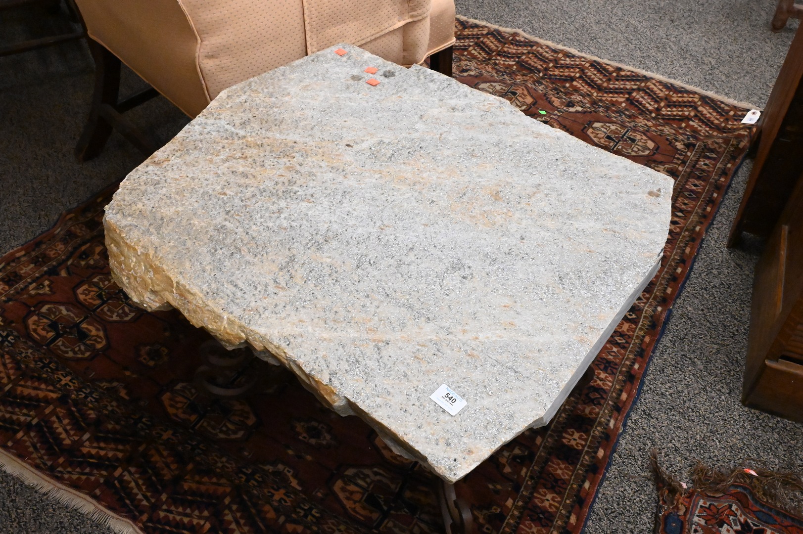 Slab Top Coffee Table, having natural stone top on iron base, height 19 1/2 inches, top 27″ x 30″. Provenance: Estate of Peter Tillou, Litchfield, Connecticut.