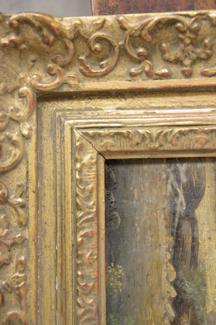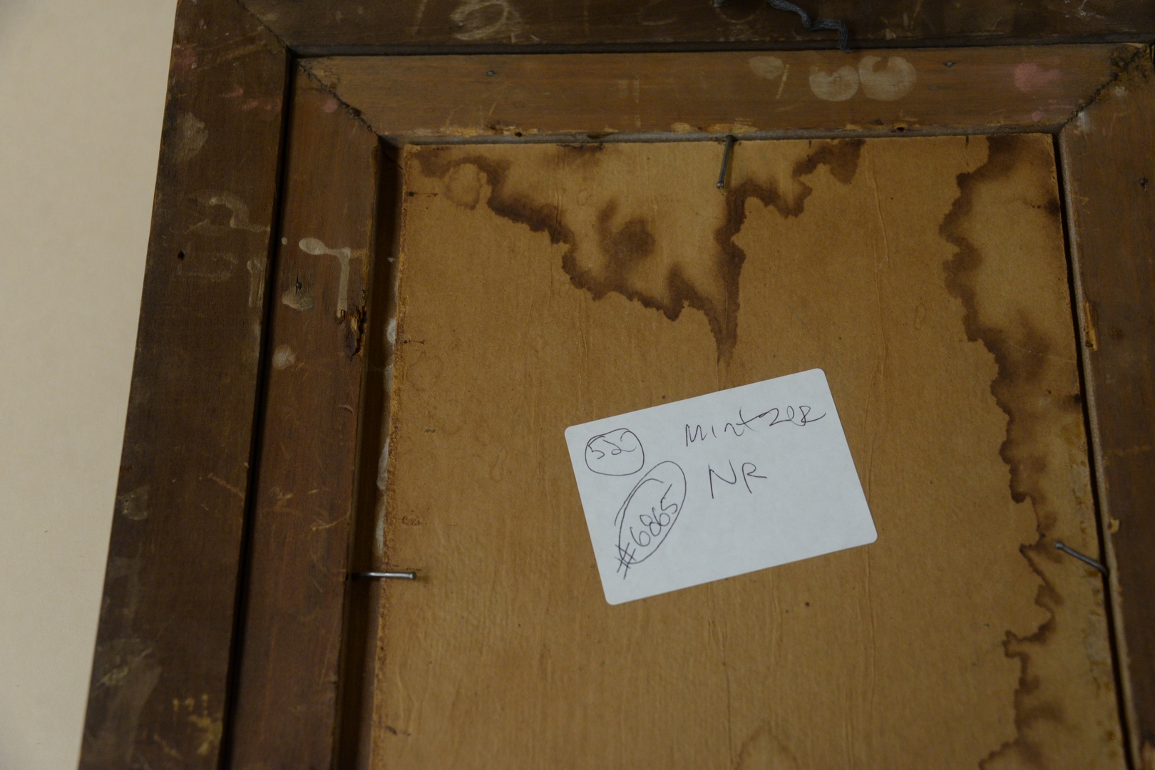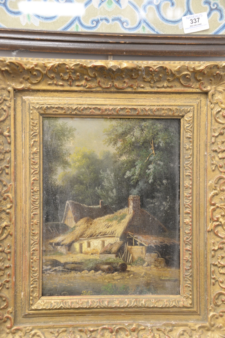 Lot 541: American School 19th century, oil on canvas laid on board, Cottage in the Forest with Thatched Roof, bears spurious signature lower left of John Constable, 11 1/2 x 9.