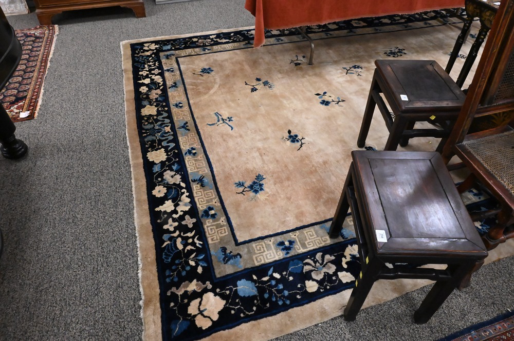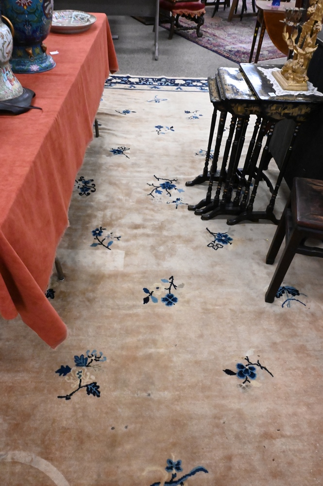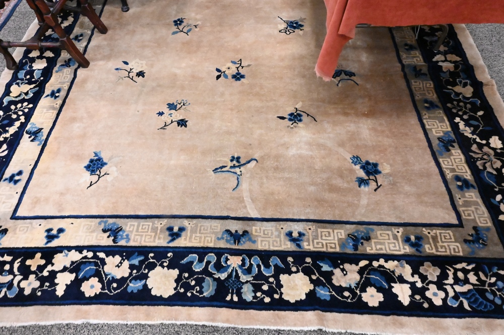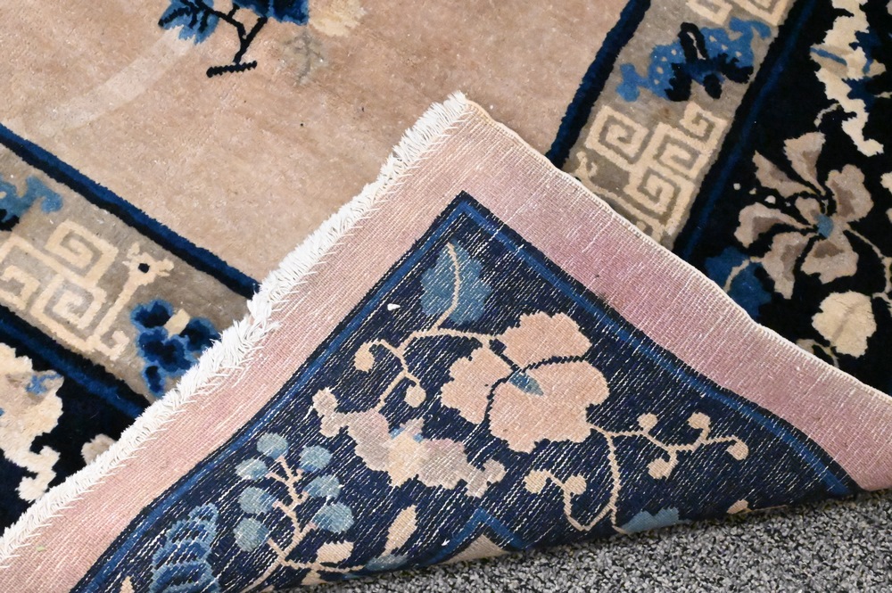 Lot 541: Chinese Oriental Carpet, having bats in border, 9′ x 14′ 2″, some wear.