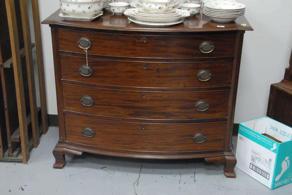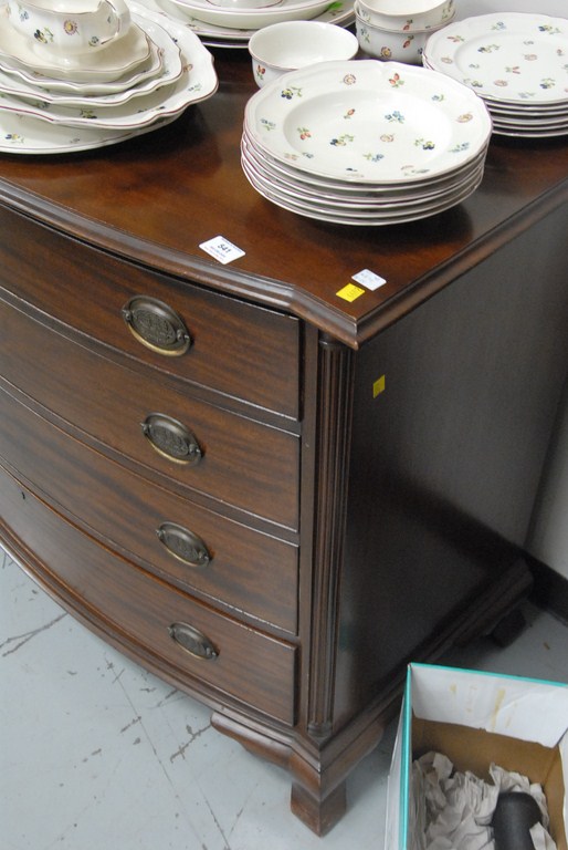 Lot 541: Margolis mahogany bowed front chest of four drawers with fluted quarter columns all set on ogee feet, signed Margolis with brass pla…