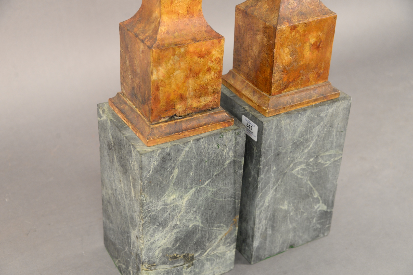 Pair of Orange Painted Wooden Obelisks mounted on green hardstone bases, height 35 inches, width 5 3/4 inches, depth 6 inches.