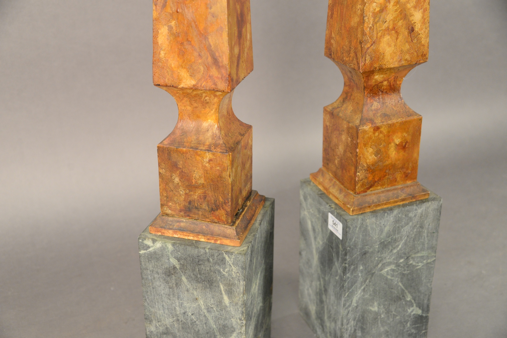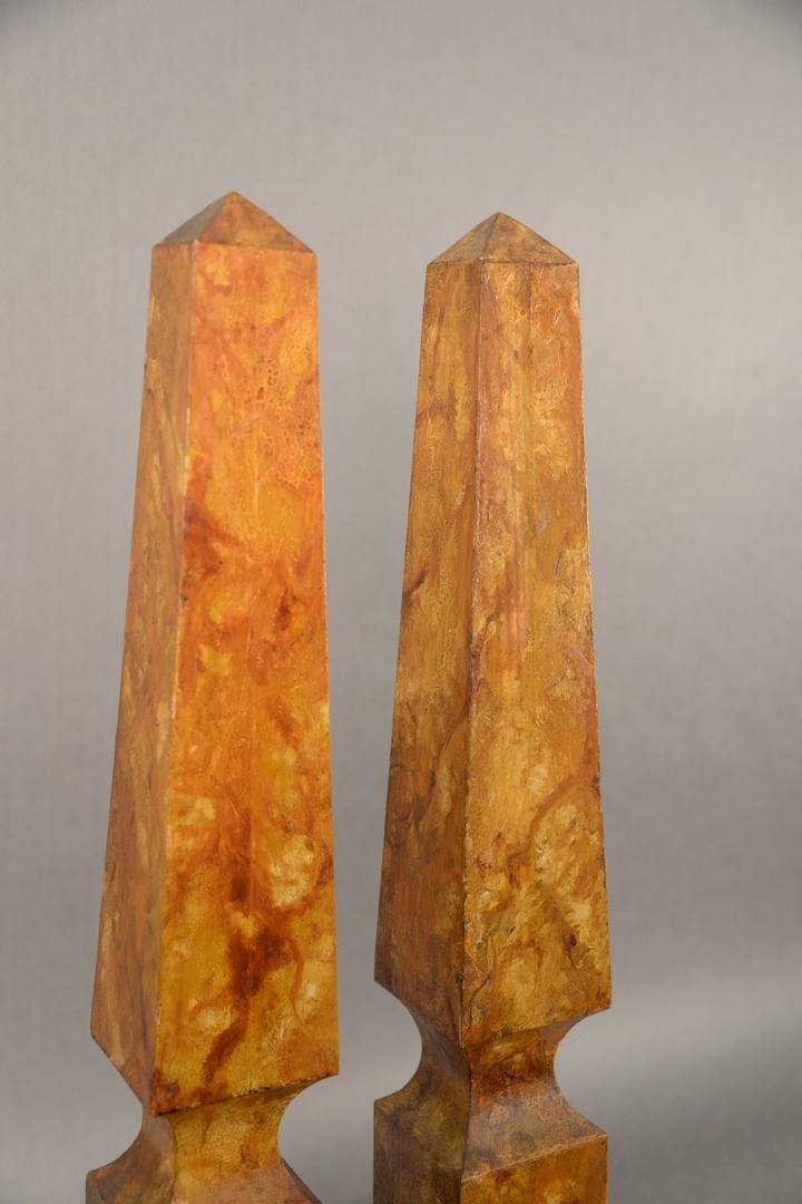 Lot 541: Pair of Orange Painted Wooden Obelisks mounted on green hardstone bases, height 35 inches, width 5 3/4 inches, depth 6 inches.