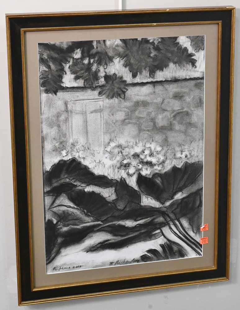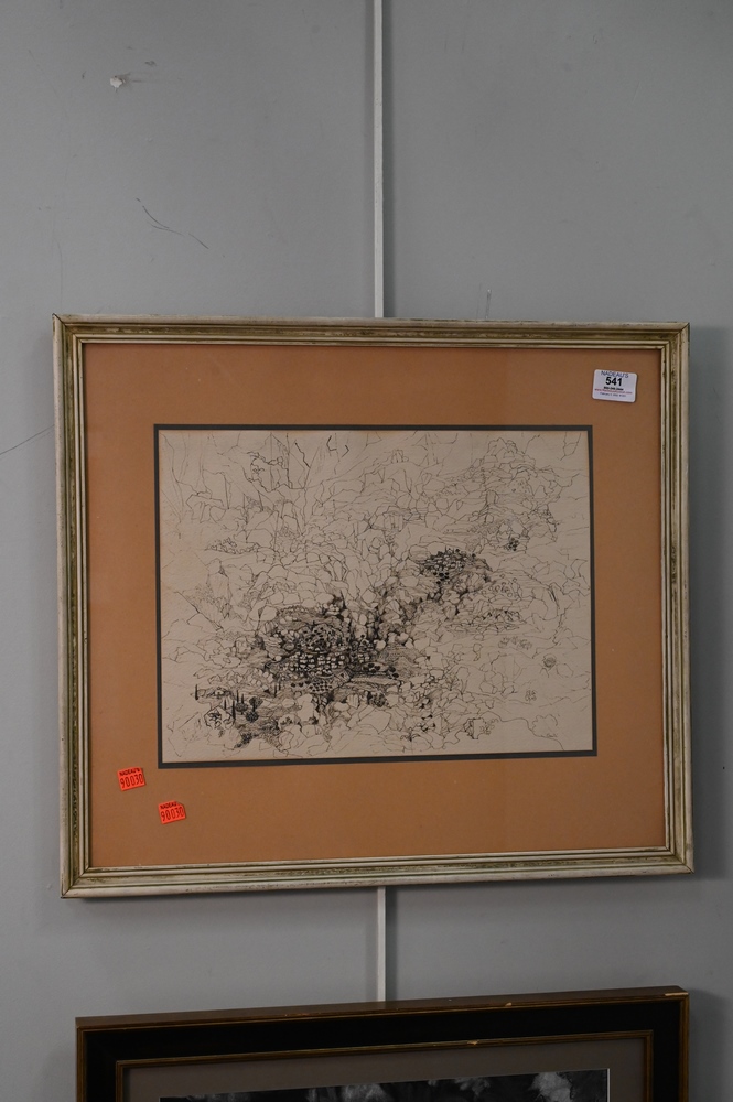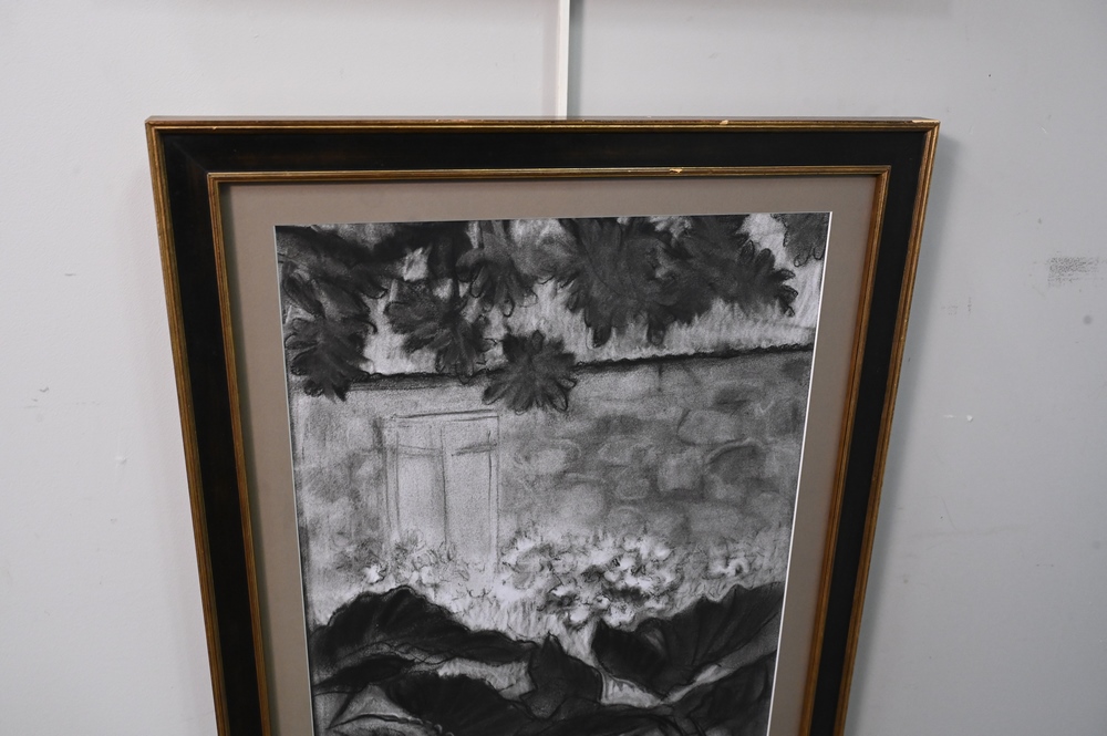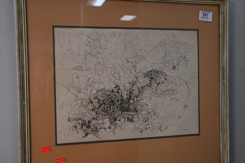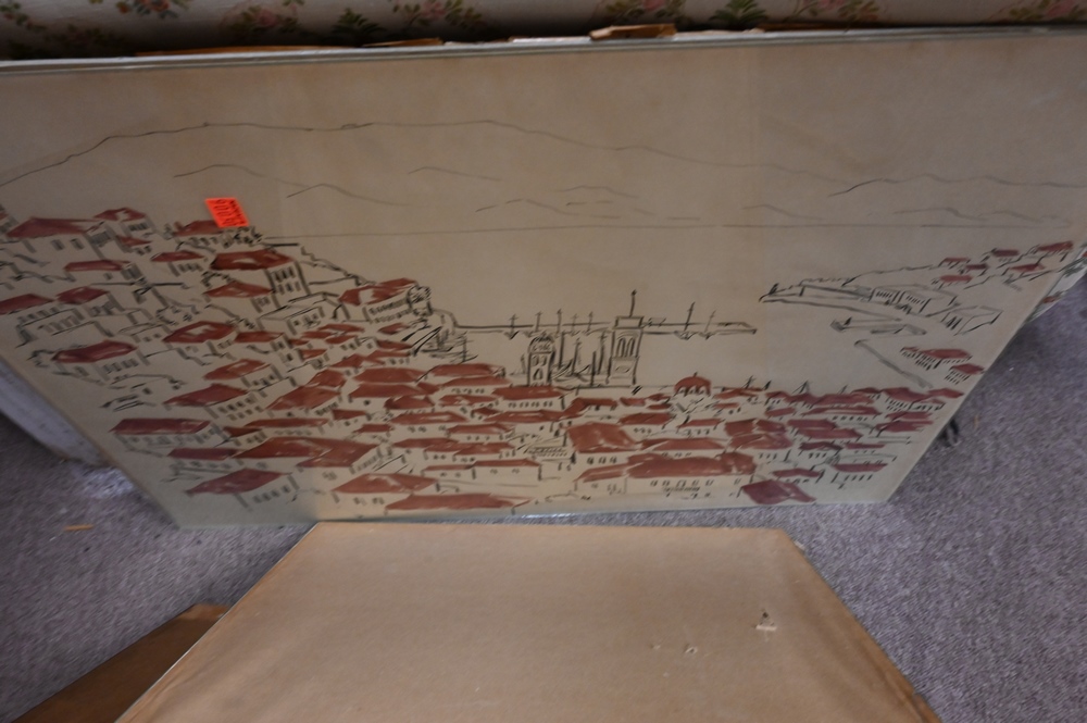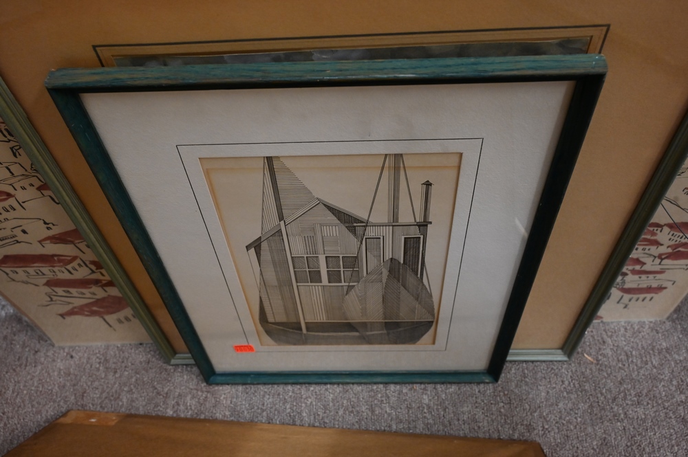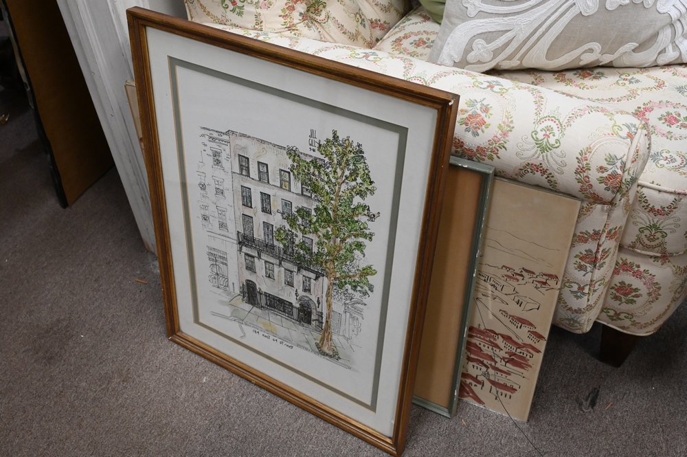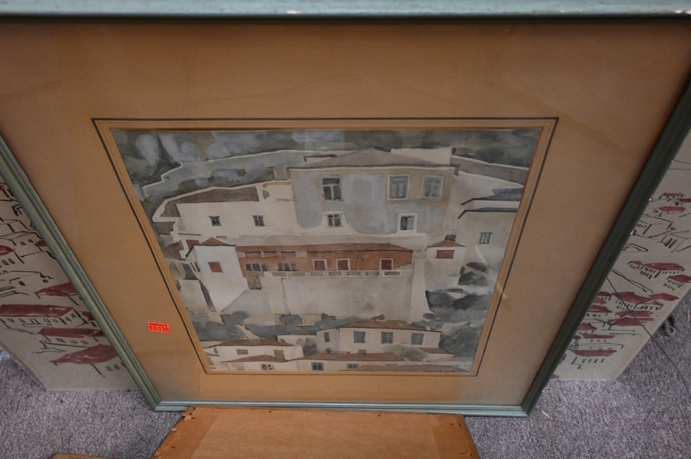 Lot 541: Six Piece Framed Group, to include C.M. Goff pen/ink Sailing House; landscape in ink signed illegibly; watercolor and ink of town edge harbor; watercolor of houses on hillside signed illegibly; Jill Gill watercolor of 184 East 64th Street NY; and a Charcoal signed illegibly, largest 22″ x 15″.