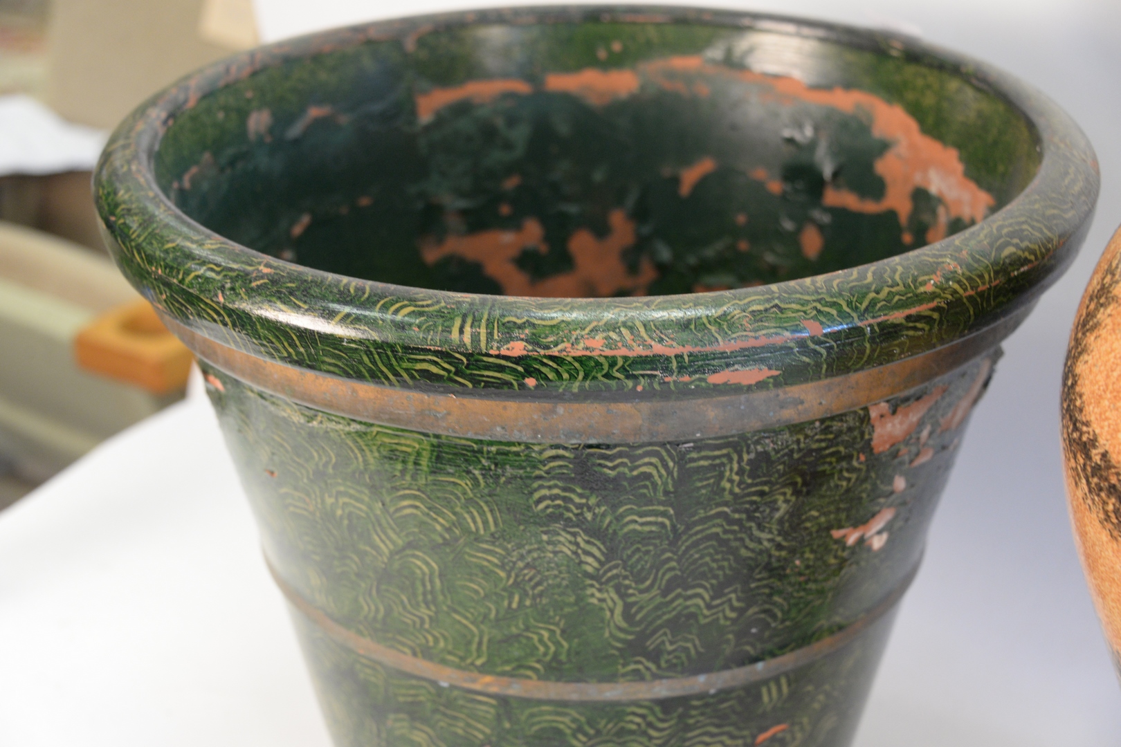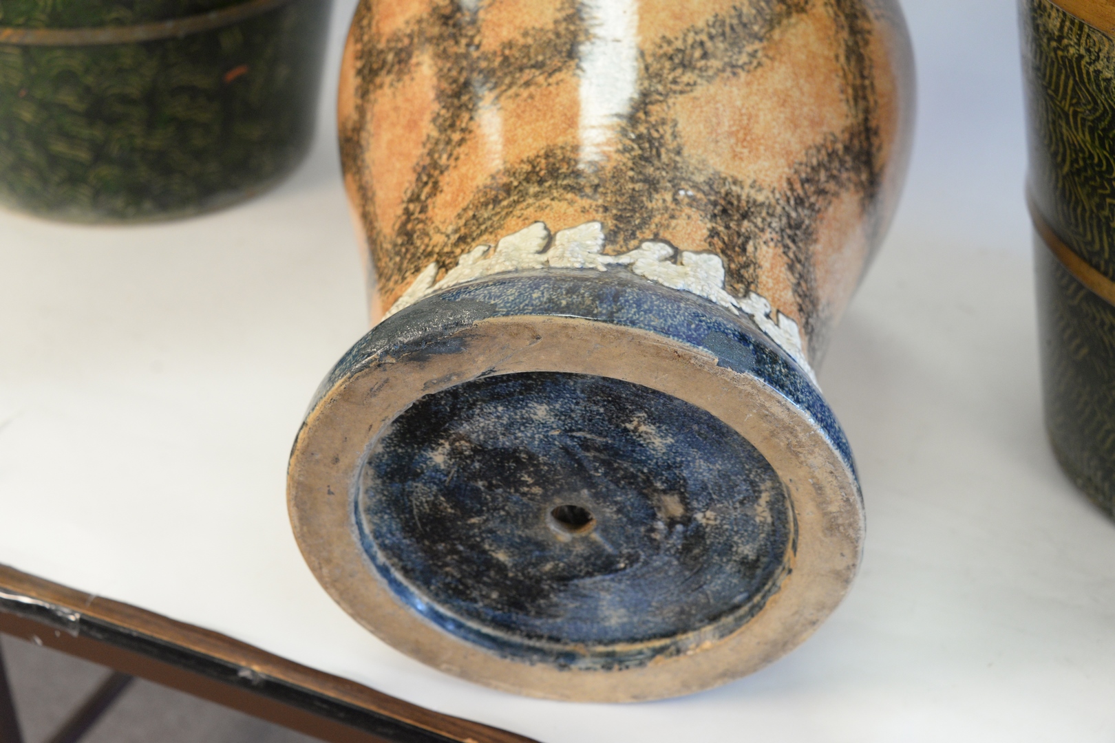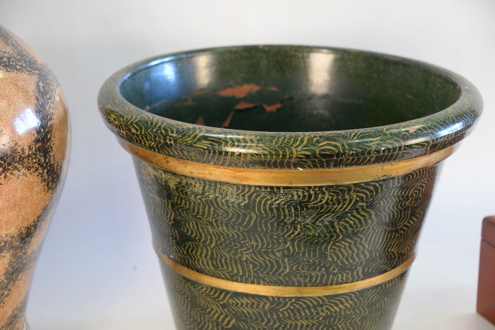 Lot 541: Three Piece Lot, to include pair of decorative, earthenware urns, height 16 inches, diameter 19 1/2 inches along with a glazed plan…