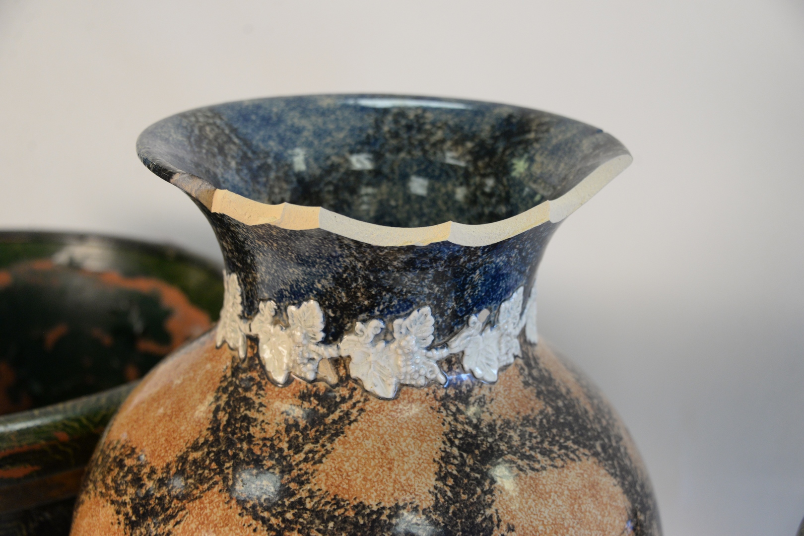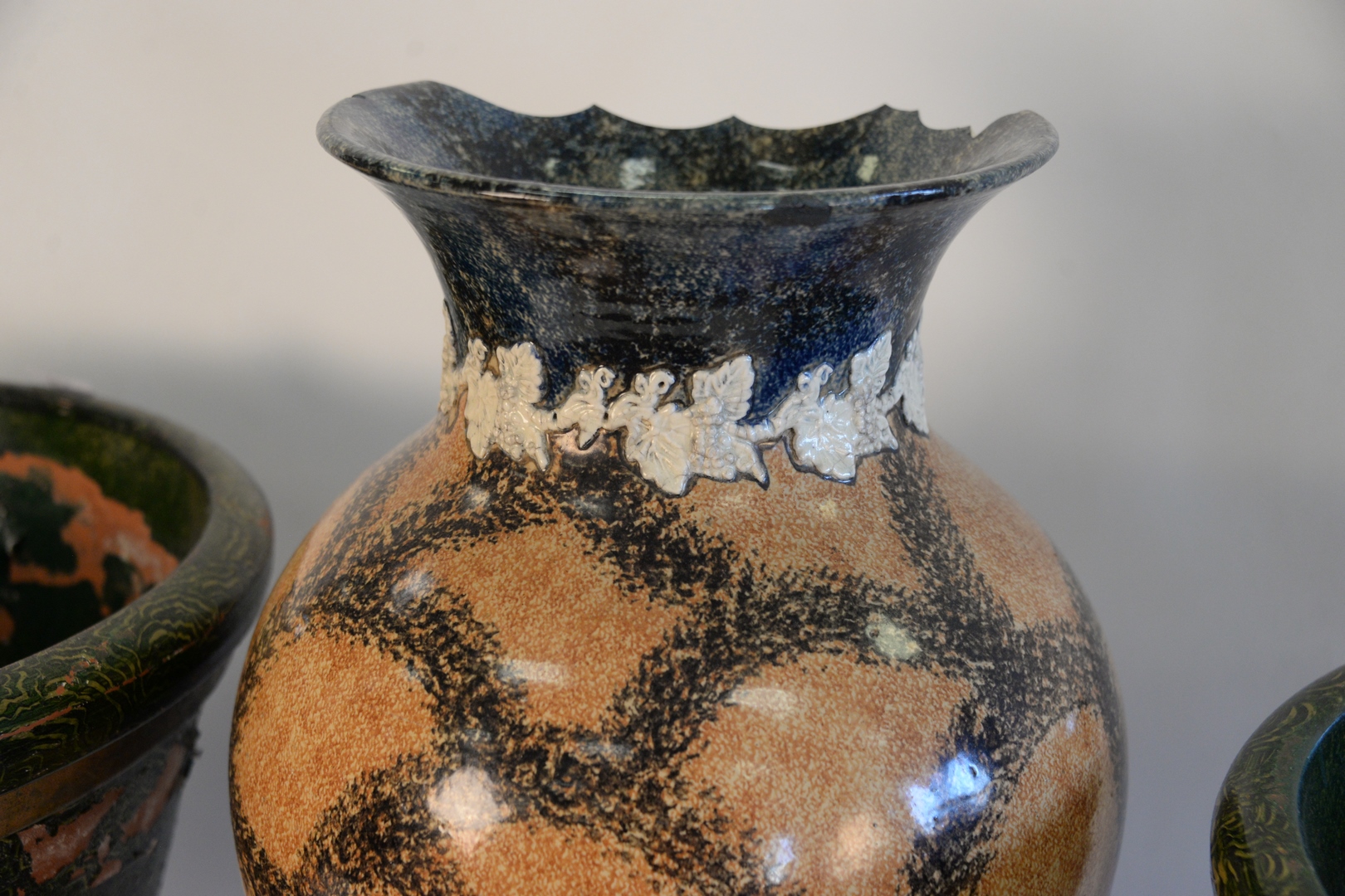 Three Piece Lot, to include pair of decorative, earthenware urns, height 16 inches, diameter 19 1/2 inches along with a glazed planter as is.