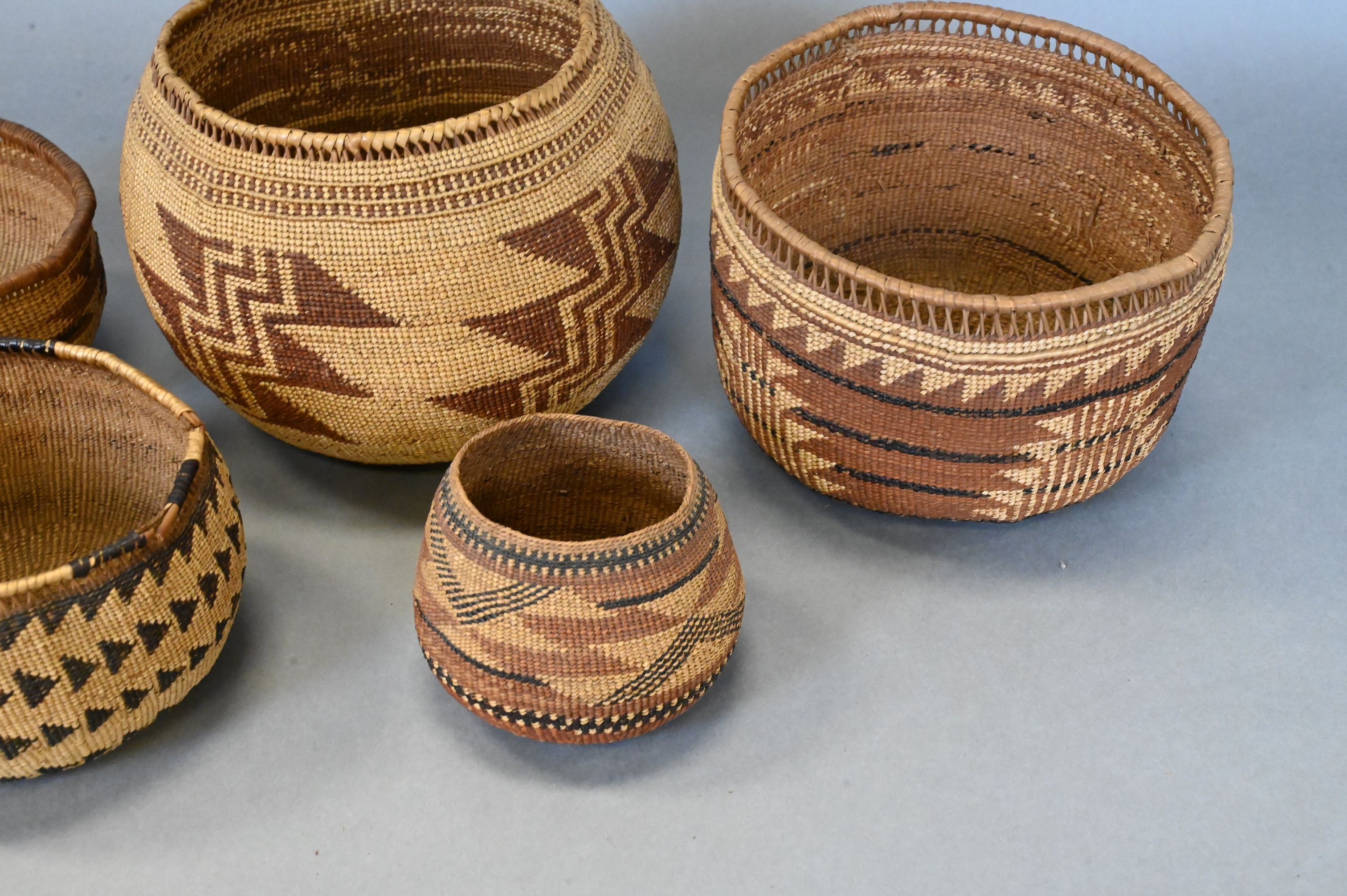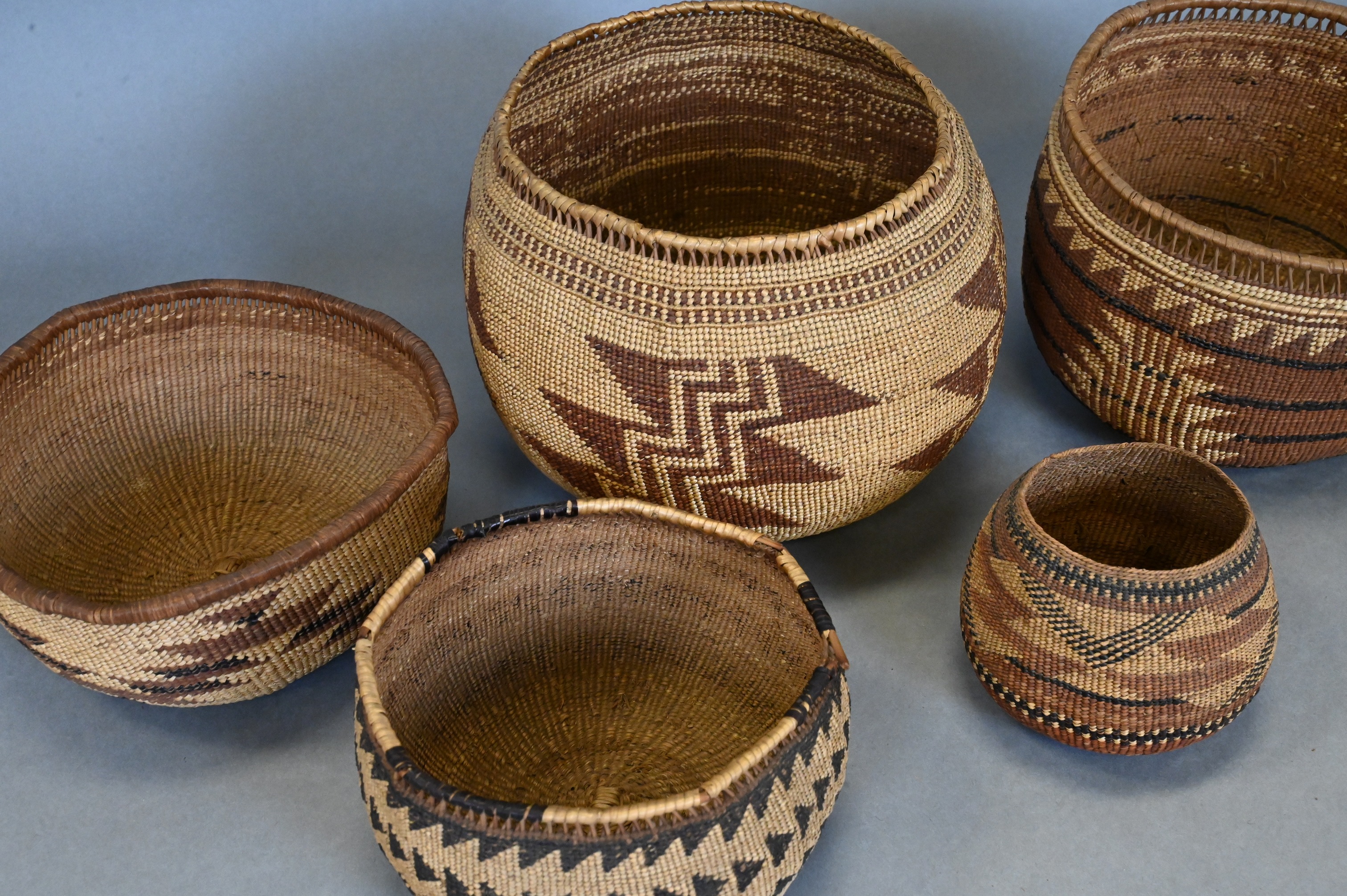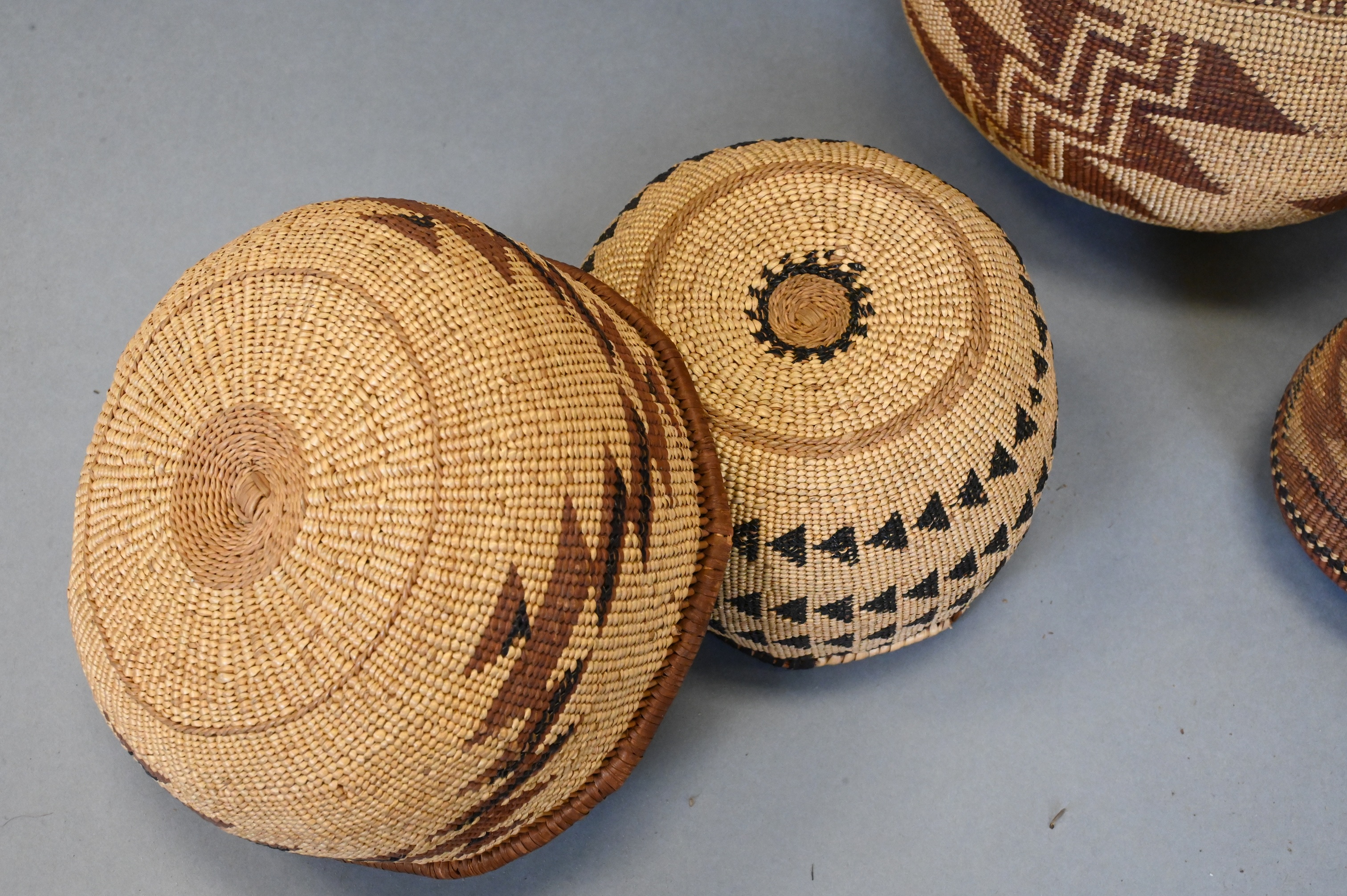 most likely from the Pacific Northwest Tlingit, one with red and brown bands, one with lid with beads on the inside