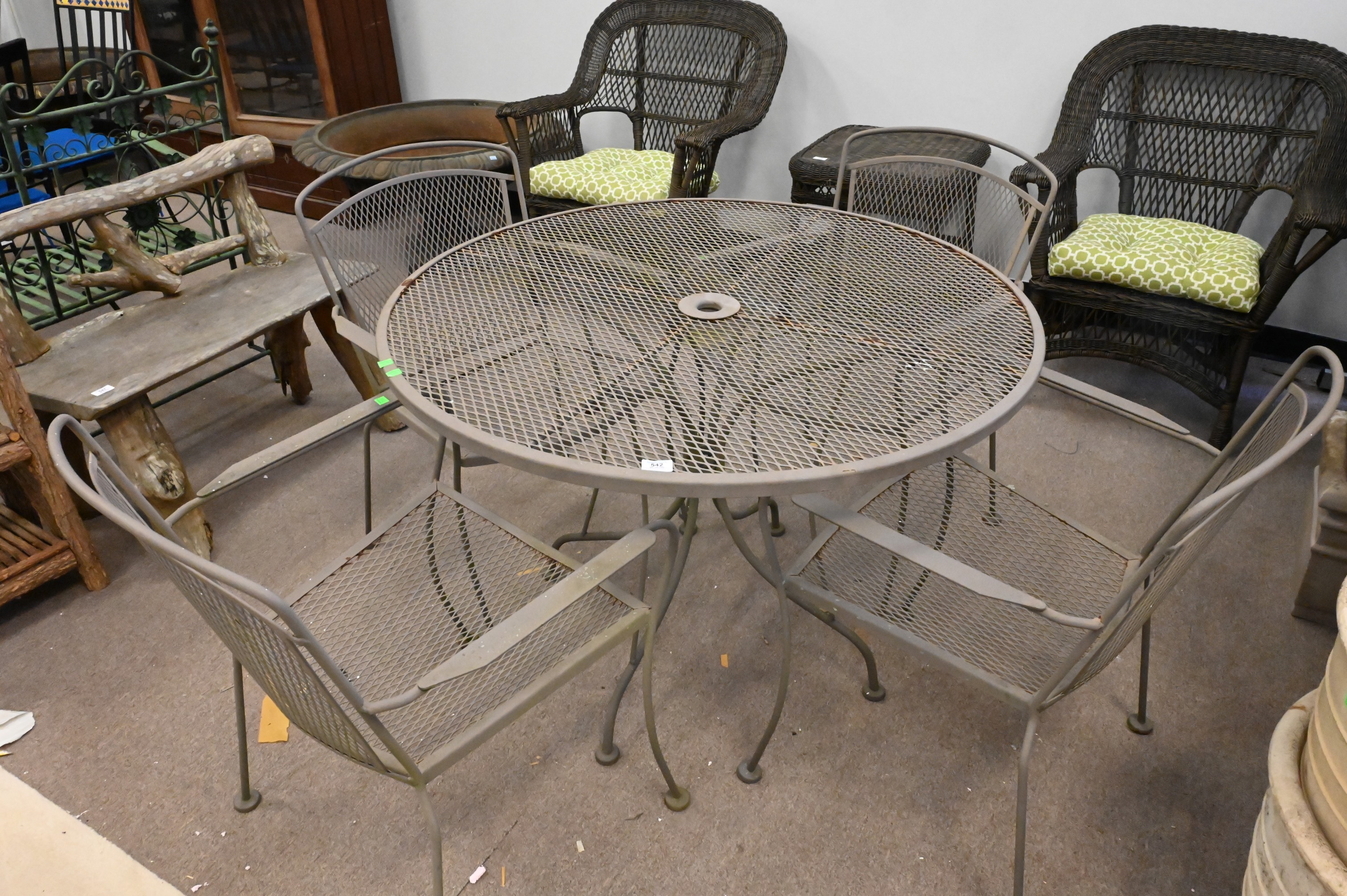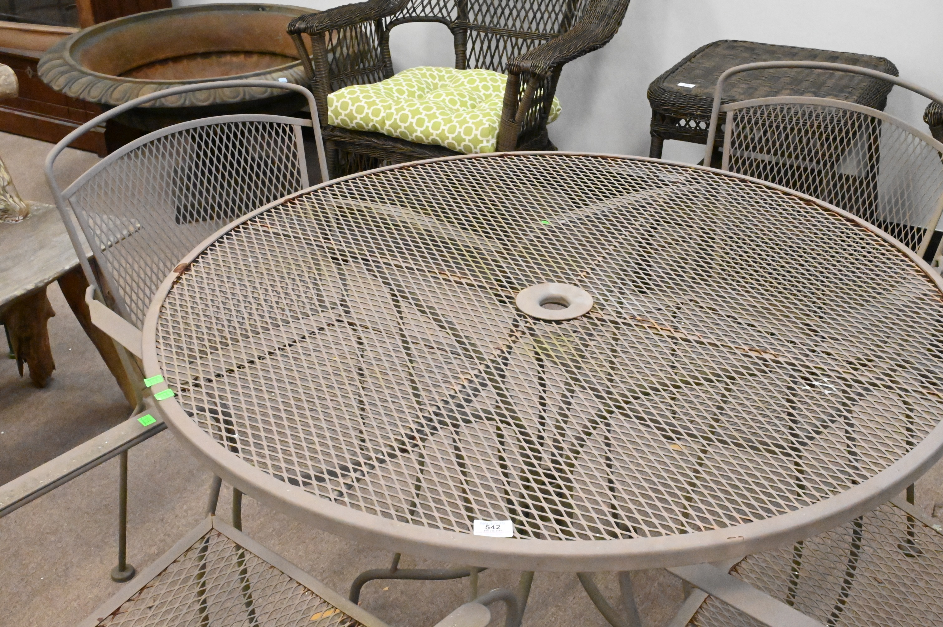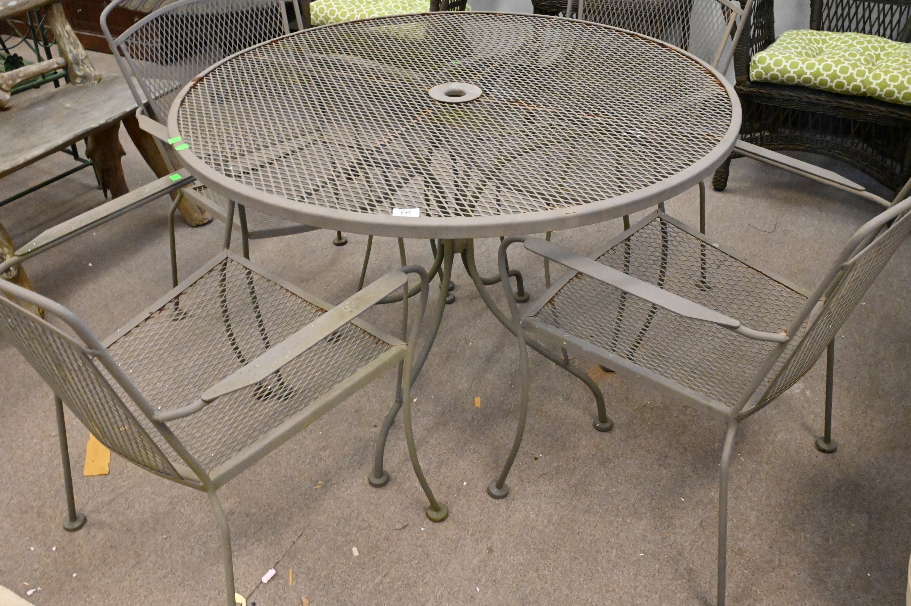 Five Piece Outdoor Iron Mesh Patio Set, to include round table and arm chairs, height 29 inches, diameter 42 inches, Provenance: West Hartford Estate of Dorothy Elsner.