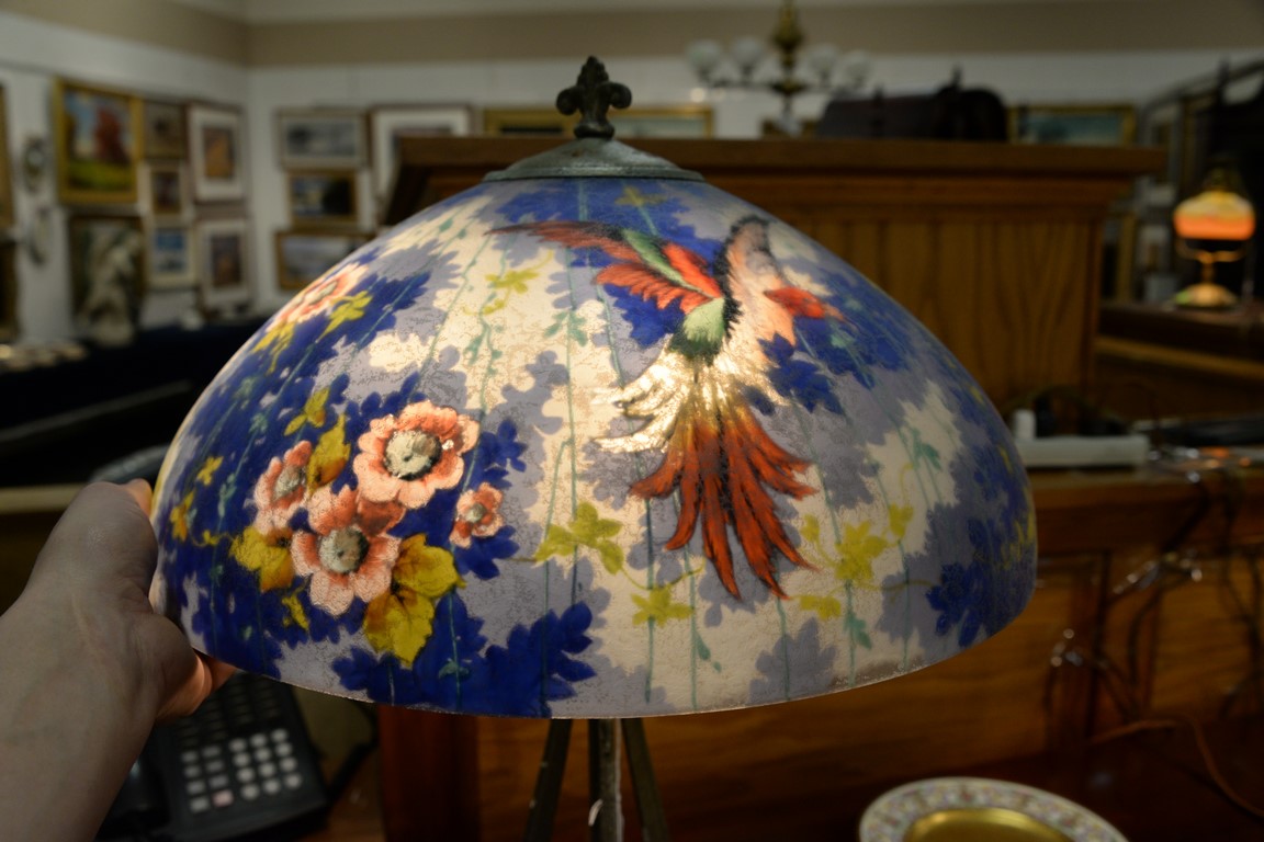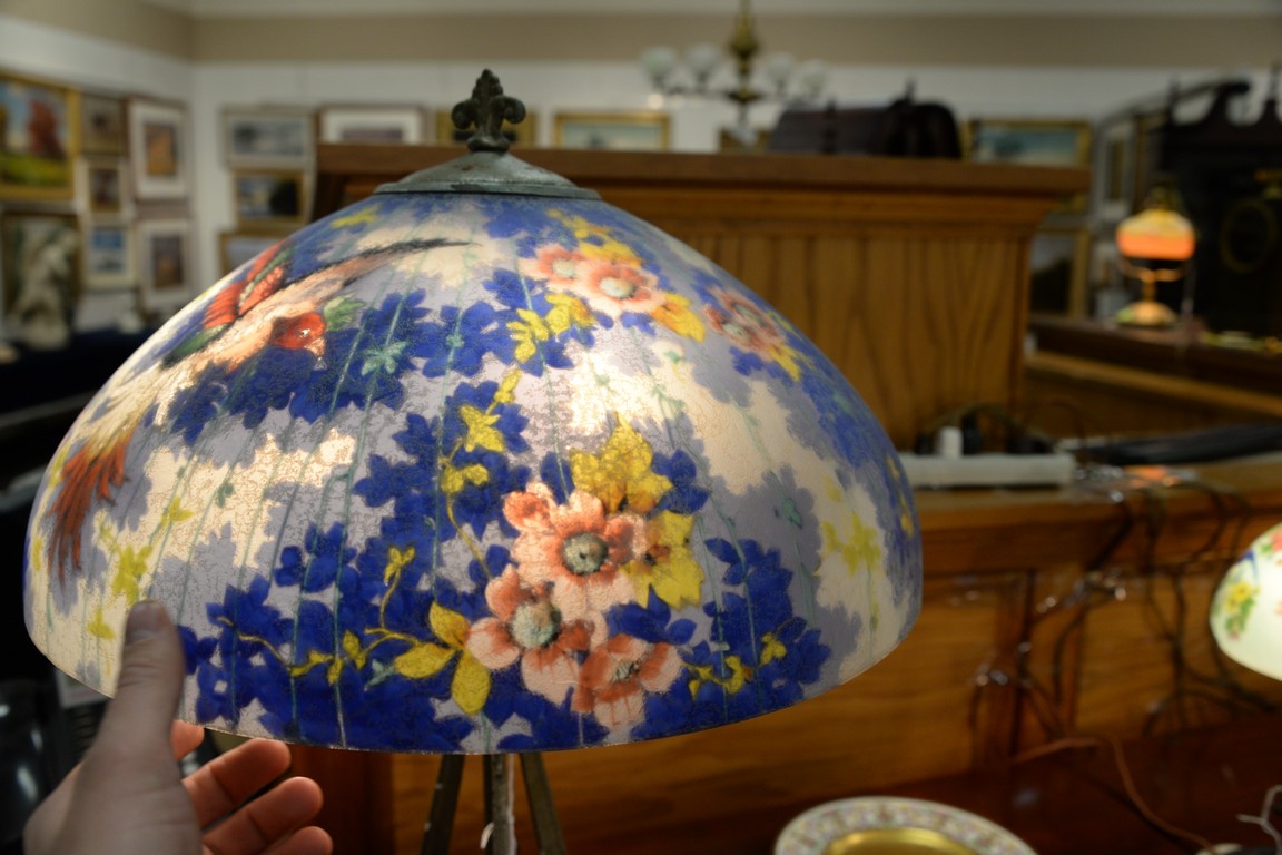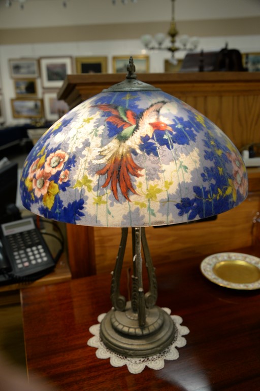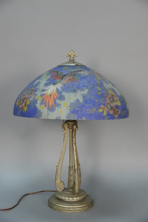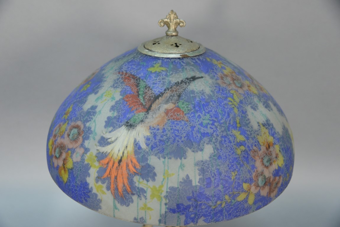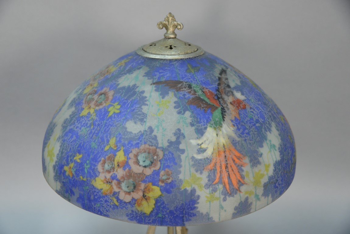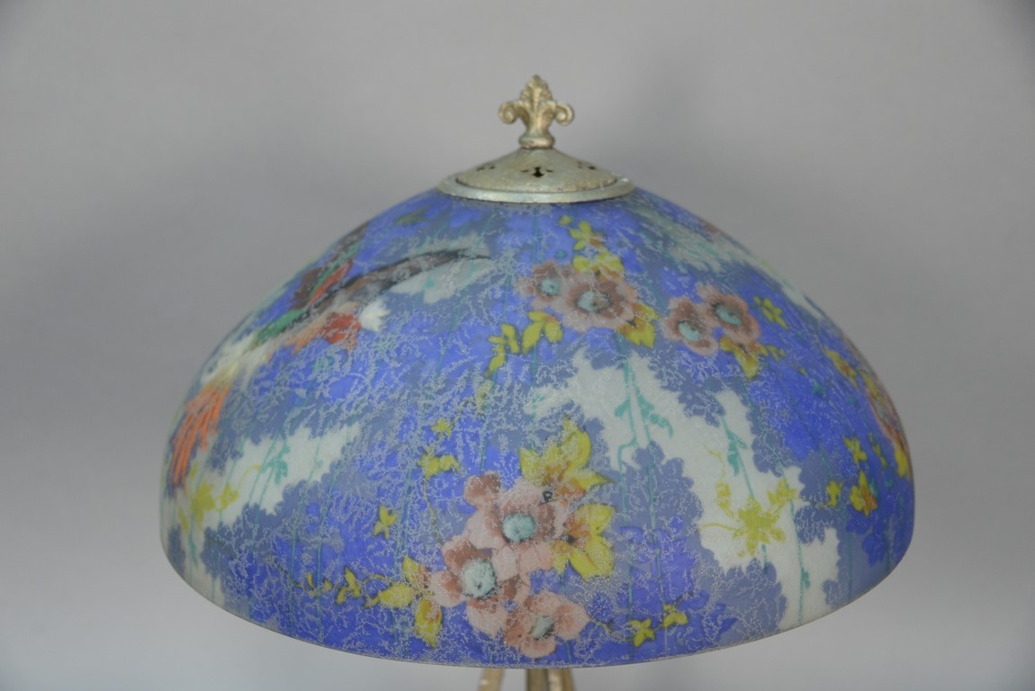 Lot 542: Handel blue pheasant reverse painted table lamp having colorful exotic pheasant flying above rich in color flowers and foliage again…