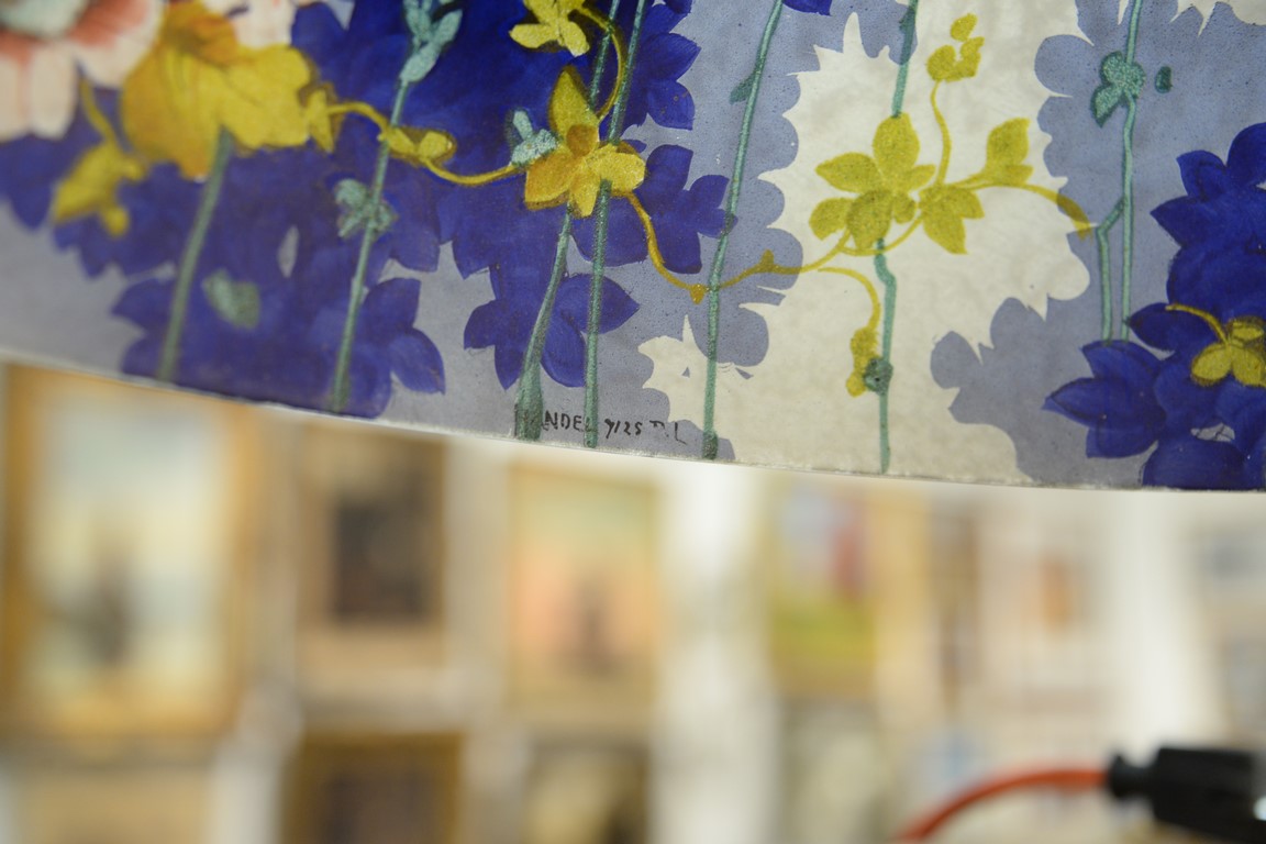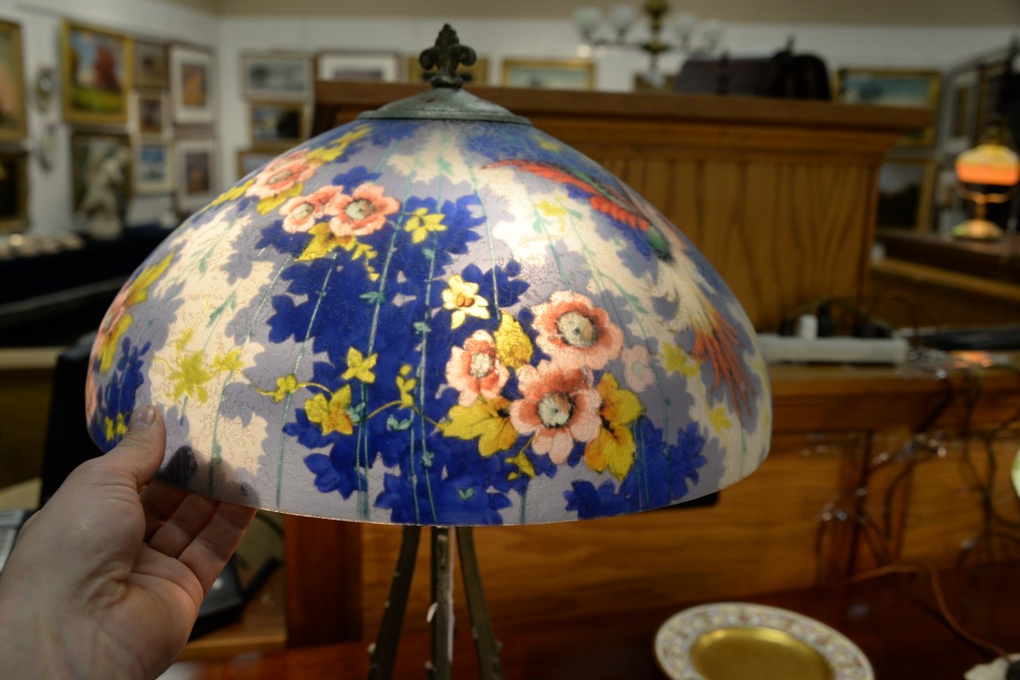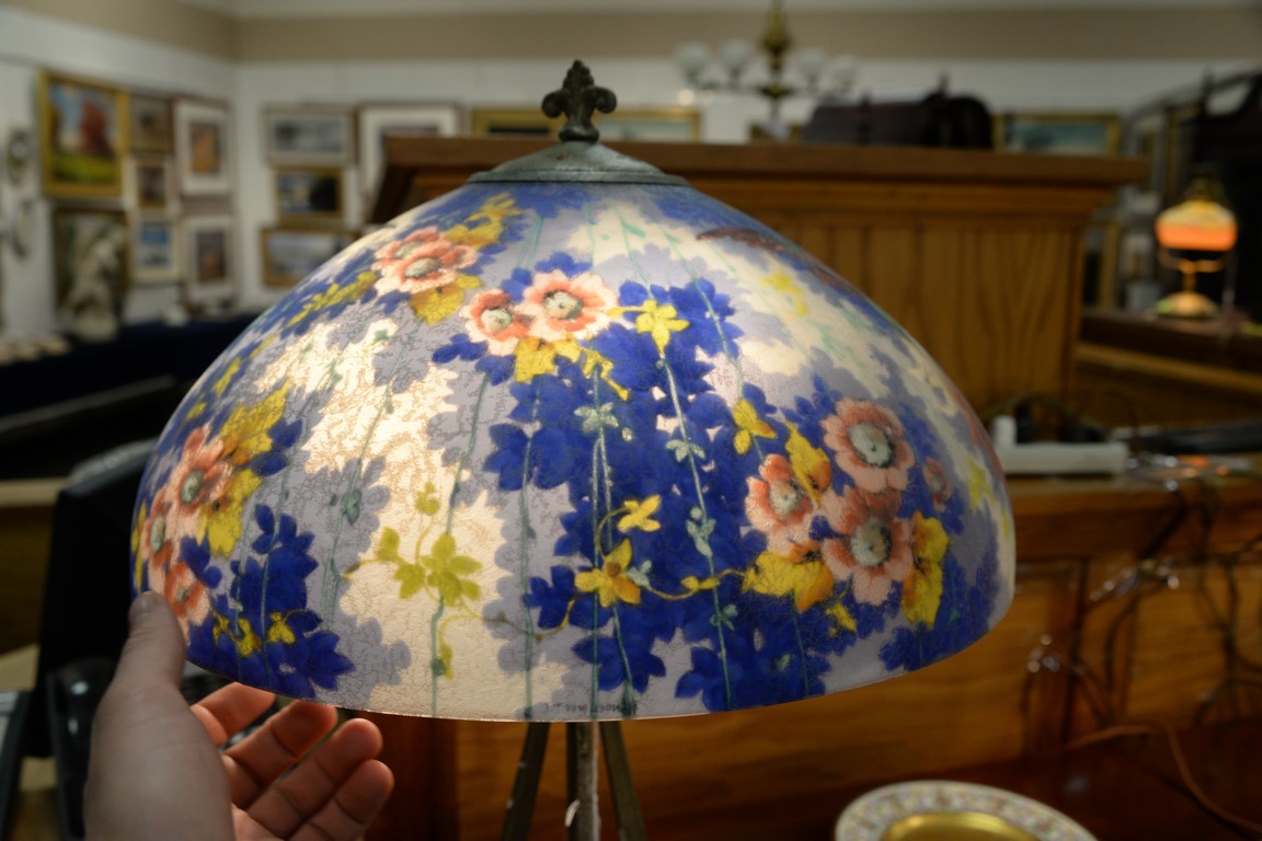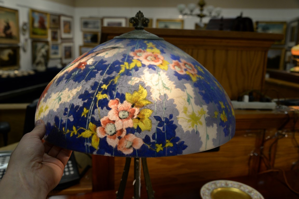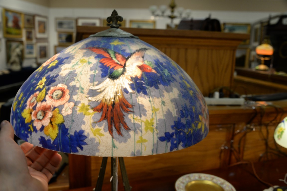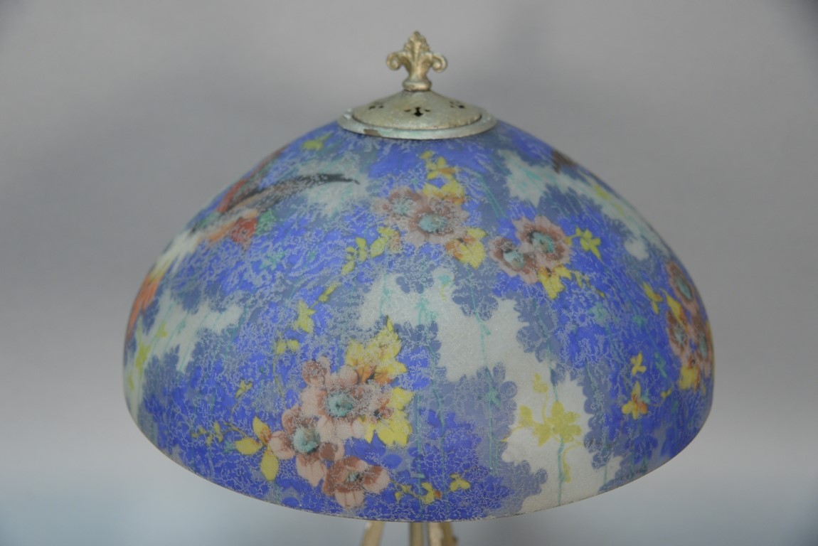 Lot 542: Handel blue pheasant reverse painted table lamp having colorful exotic pheasant flying above rich in color flowers and foliage again…
