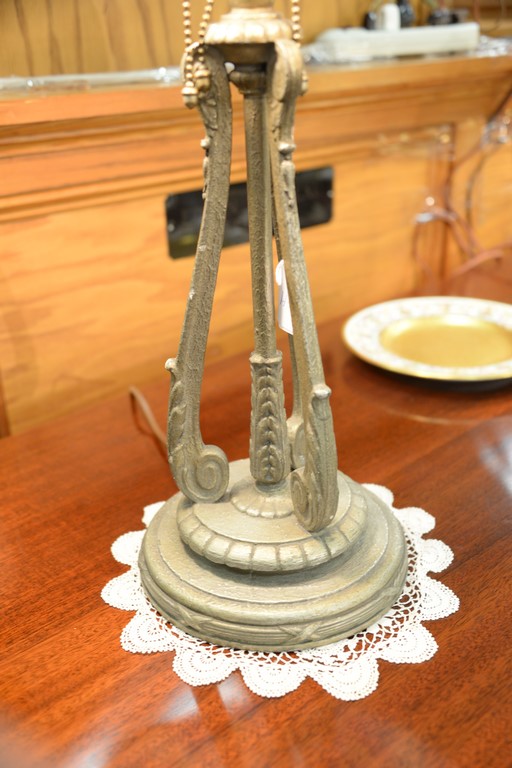 Handel blue pheasant reverse painted table lamp having colorful exotic pheasant flying above rich in color flowers and foliage against bright blue background. Chipped ice exterior and signed on interior edge: Handel 7125. Similar to Birds of Paradise, shade resting on original Handel three legged base with platform foot, three socket cluster, and Fleur-de-lis cap. Artist signed B.L., possibly Barbara Lee. base and rim now painted silver ht. 24in., dia. 18in., shade ht. 7 3/4in.