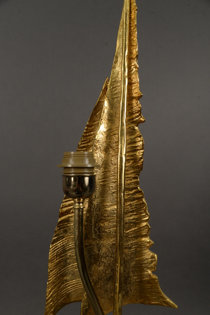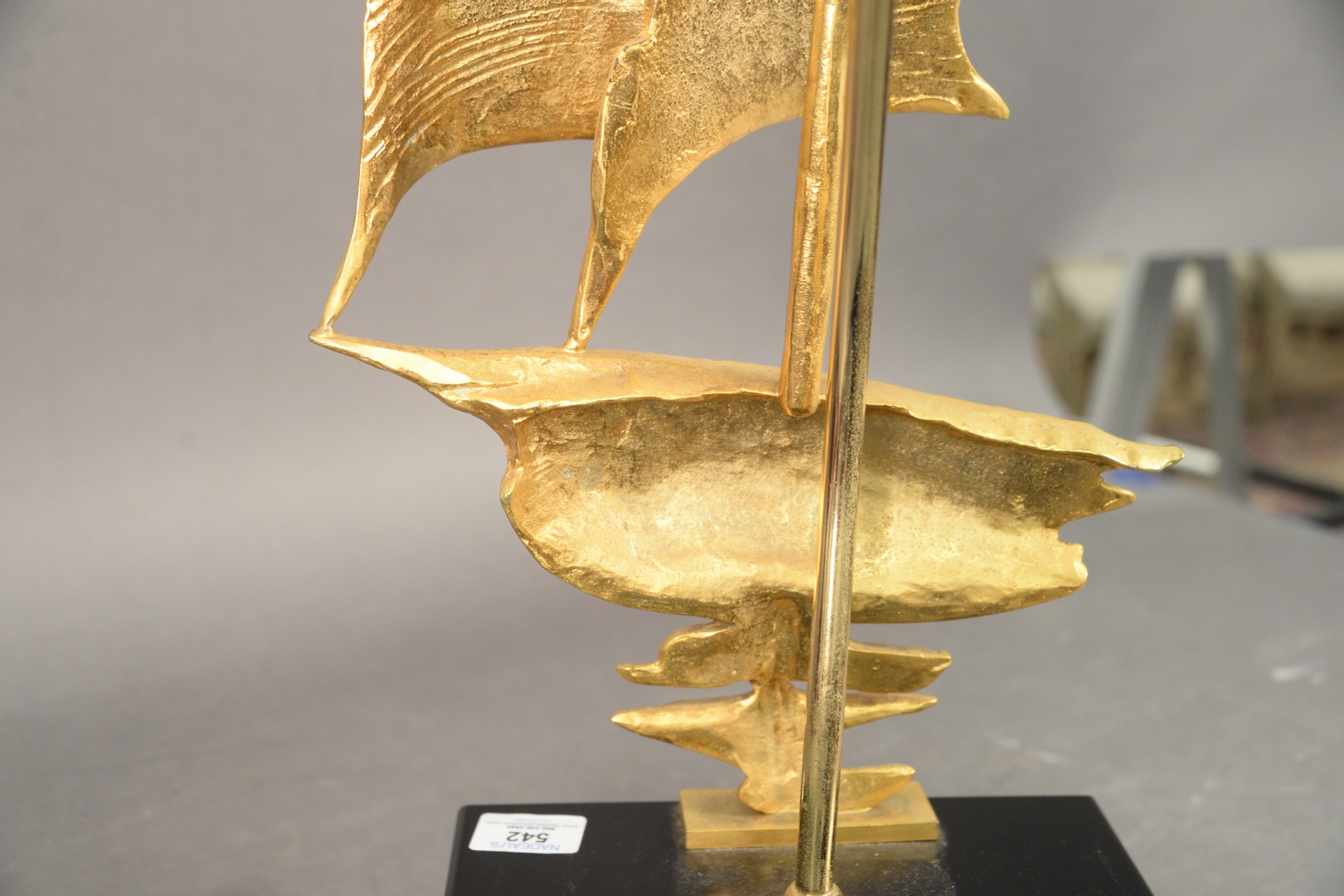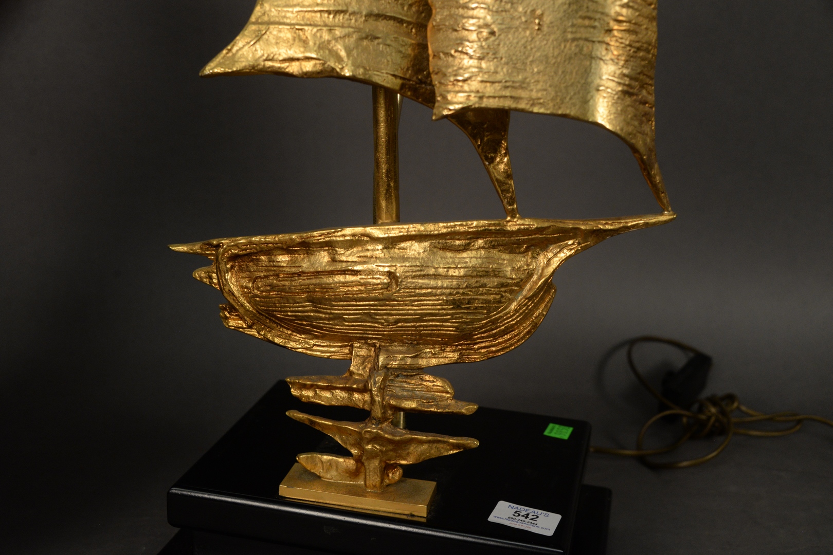 Lot 542: Mid-century Sailboat Form Gilt Bronze Table Lamp, mounted on black two-tiered base, height 35 inches, width 11 inches.