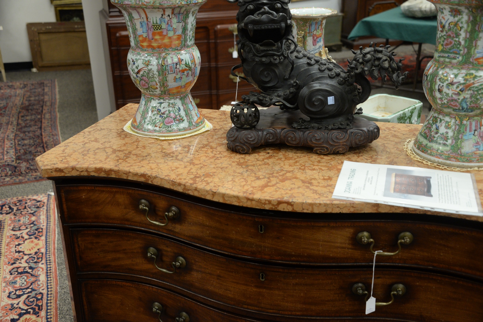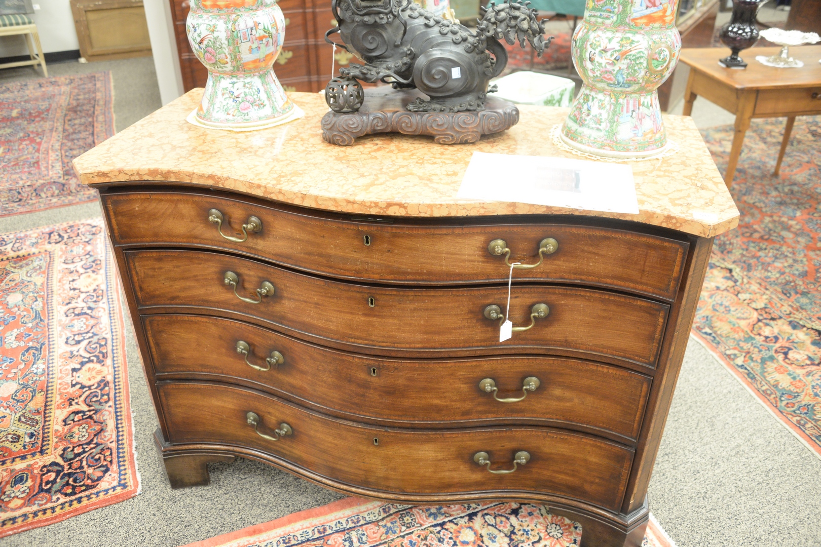 George III Mahogany Serpentine Chest having later added Guillestre Breccia marble top over four graduated banded inlaid drawers top drawer fitted with adjustable compartments and sliding green felt writing surface all on bracket feet, label on back inscribed J.G.S. Macphail, height 36 inches, width 50 inches, depth 24 1/2 inches. Provenance: Purchased from Christie’s, South Kensington sale, November 30, 2000. Collection from Mr. and Mrs. Fowler, West Hartford, Connecticut.