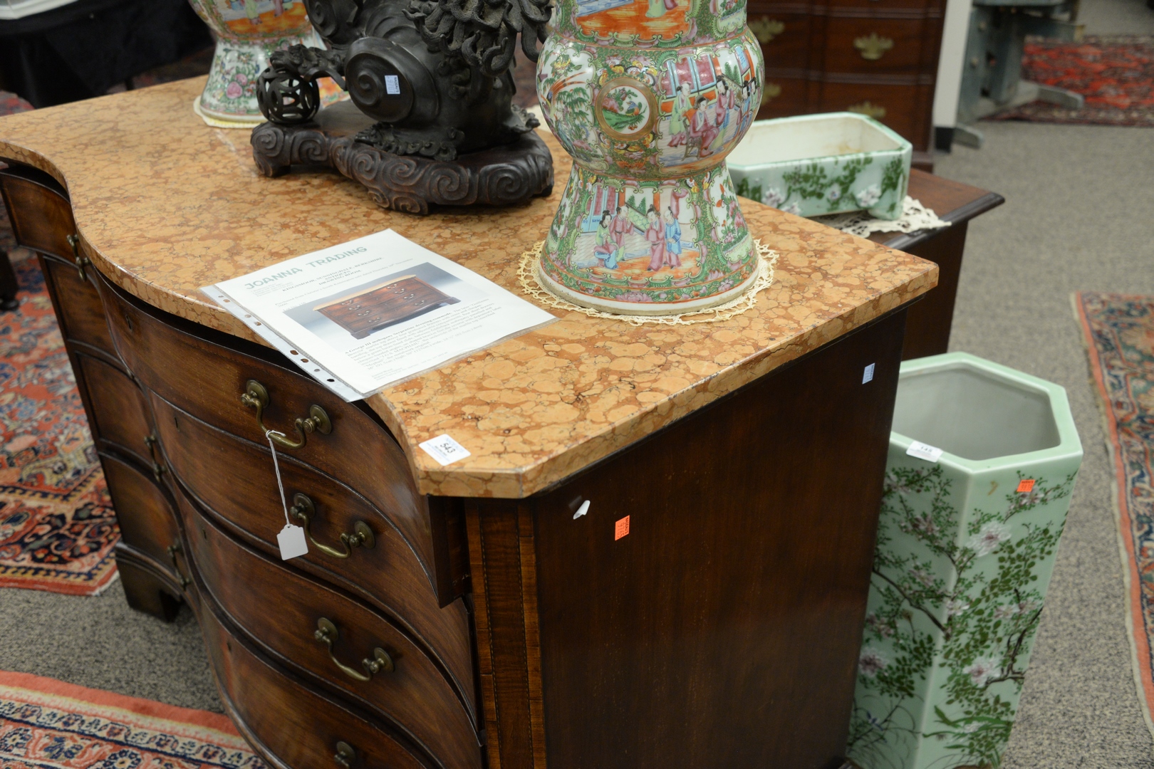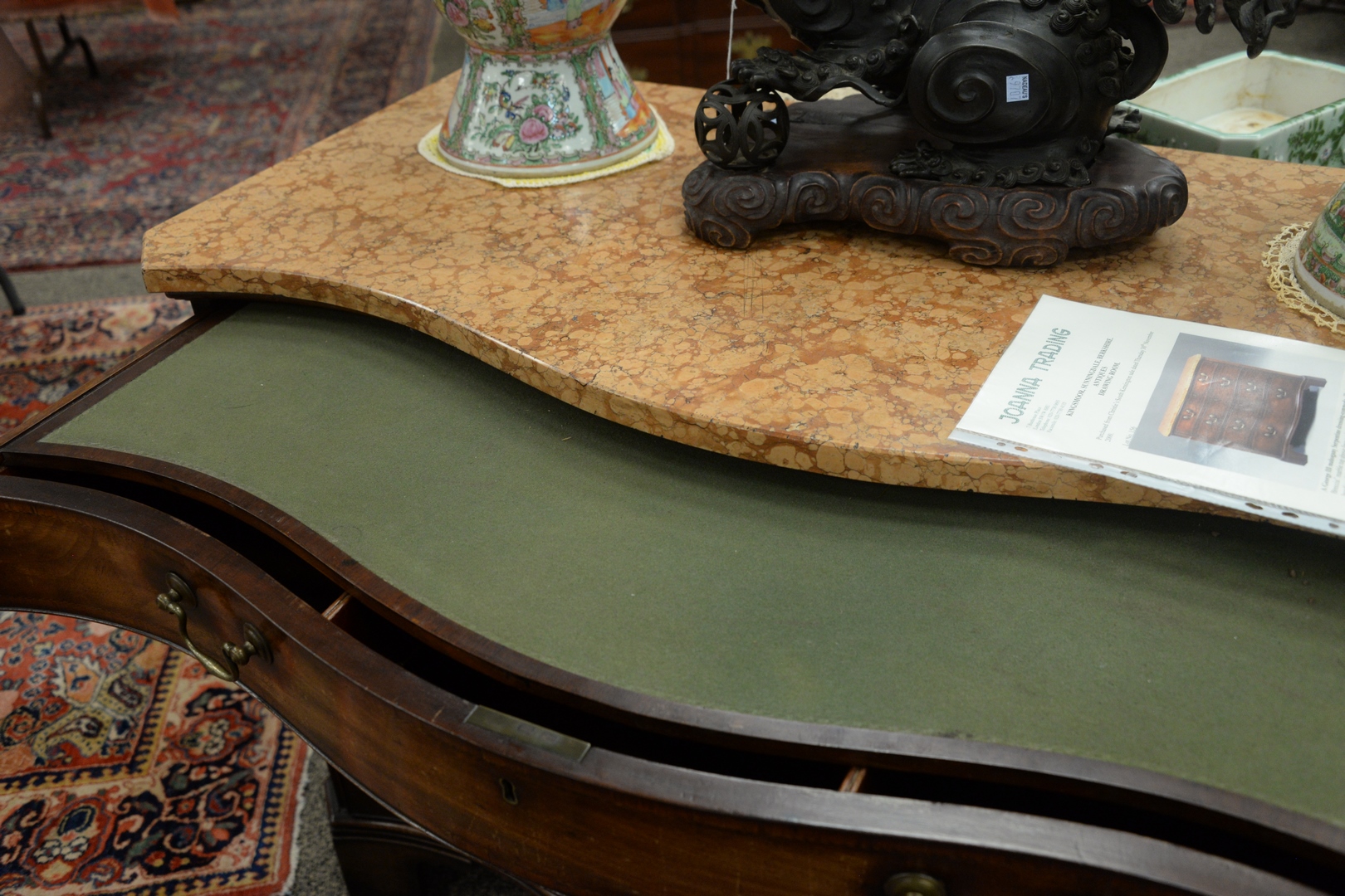 Lot 543: George III Mahogany Serpentine Chest having later added Guillestre Breccia marble top over four graduated banded inlaid drawers top drawer fitted with adjustable compartments and sliding green felt writing surface all on bracket feet, label on back